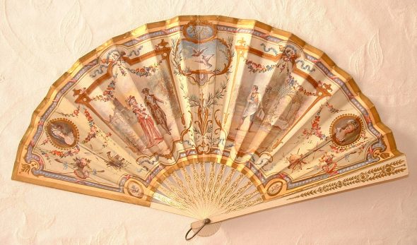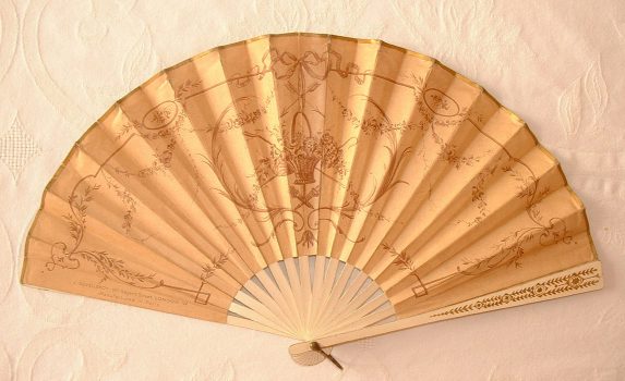 Eventail publicitaire pour l'hôtel Ritz de Londres, vers 1920. Feuille en papier chromolithographiée à la façon des éventails XVIIIe. Marqué J. Duvelleroy au revers.