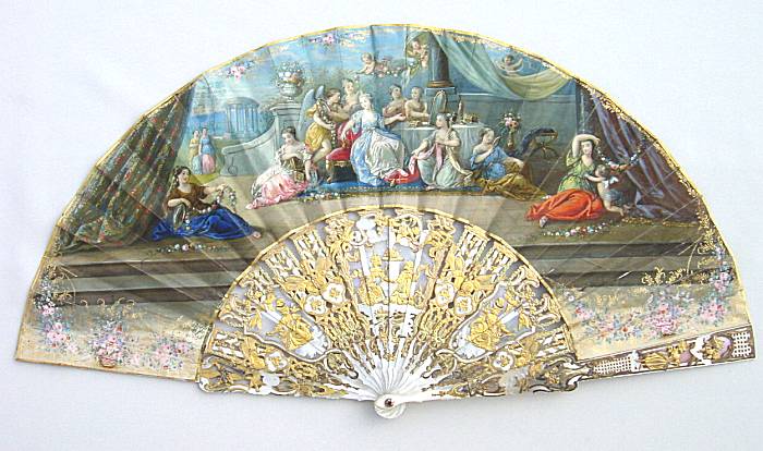 Monture en nacre, très finement repercée et ajourée d'une scène d'hymen et de trophées. Rehauts or, argent, vermeil. Au revers bouquets fleuris gouachés.