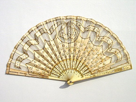 Eventail plié, milieu XIXème. Feuille en dentelle à rehauts de pastillages dorés et argentés.