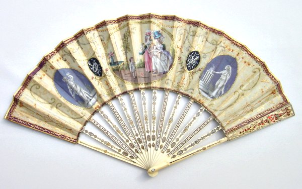 Eventail plié, vers 1770. Feuille en tissu. Gouache de trois médaillons de scènes à l'Antique, de personnages à guirlandes de fleurs et en son centre sur le thème de l'Enfance. Broderies de pastillages dorés et argentés et de couleurs, rehaussant et encadrant les médaillons.