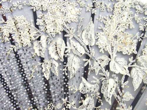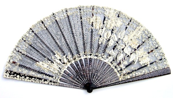 Eventail plié, vers 1880. Eventail de deuil en tulle noire ornée de broderies en dentelle de Chantilly blanche et pastillages argentés représentant des branchages fleuris.
