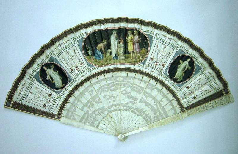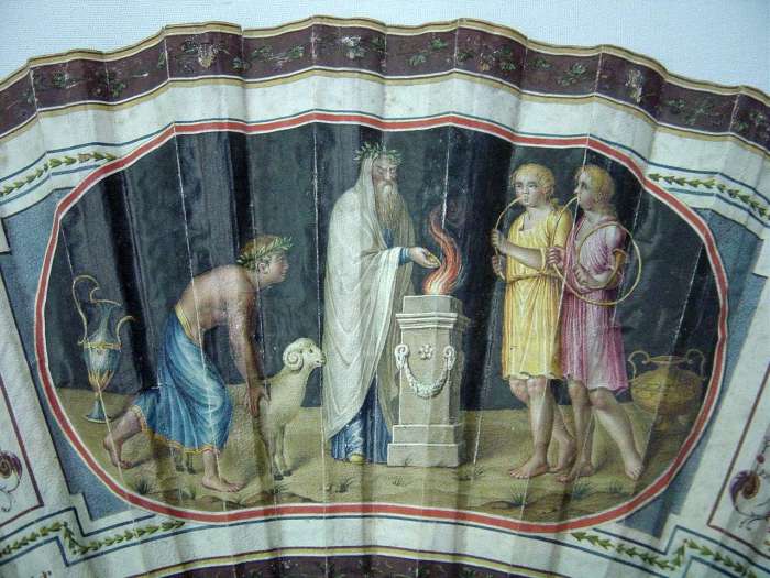 Eventail plié, double face, Directoire. Feuille en papier peinte à la gouache, à rare décor de triple scène "pompéienne".