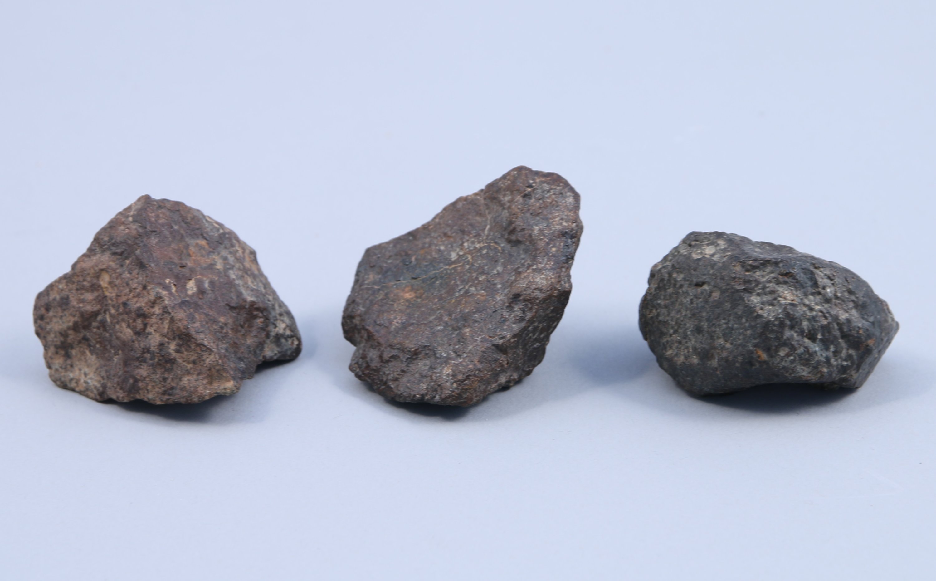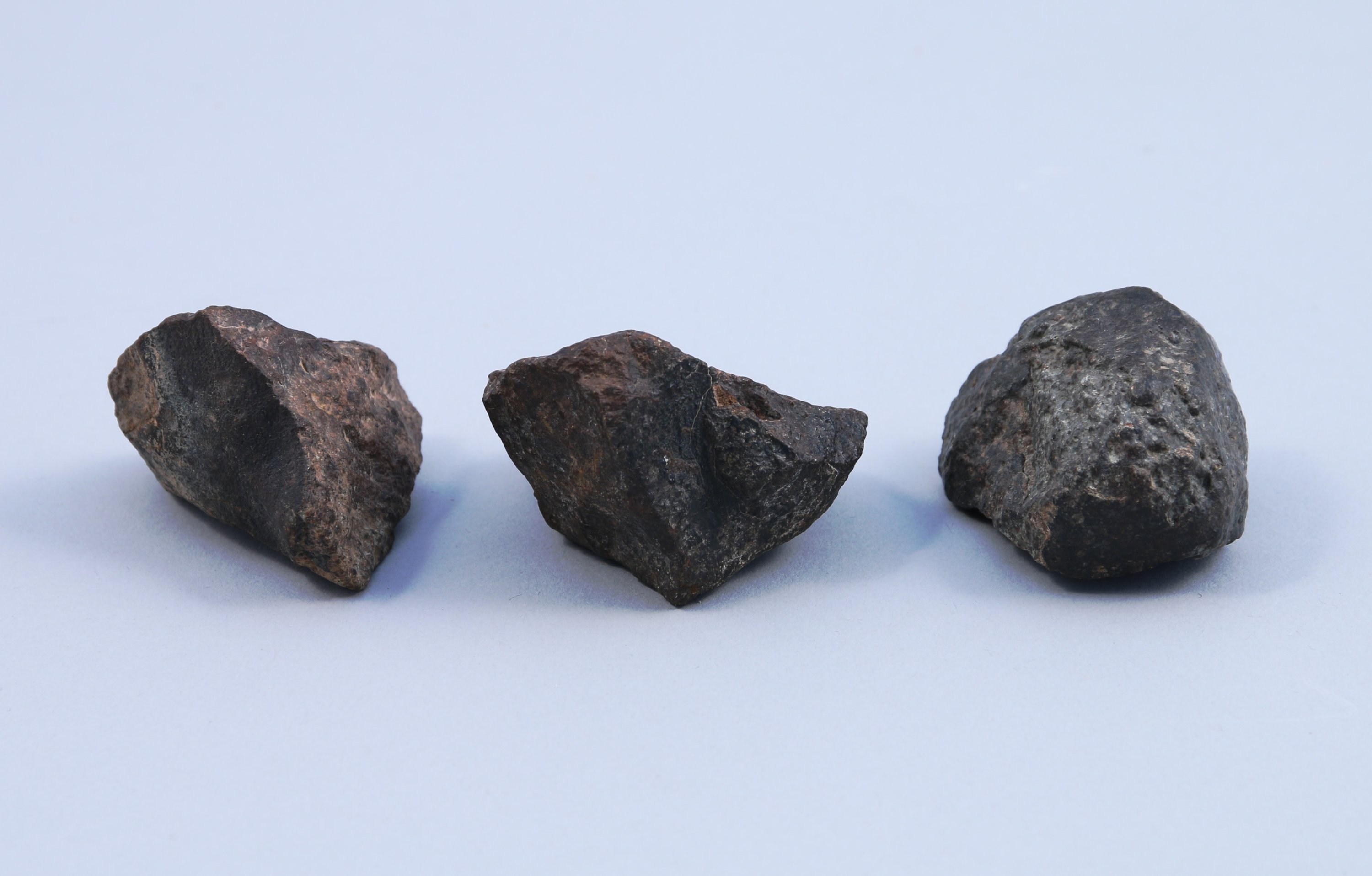 RÉUNION de trois MÉTÉORITES SAHARIENNES entières à belles croûtes de fusion: