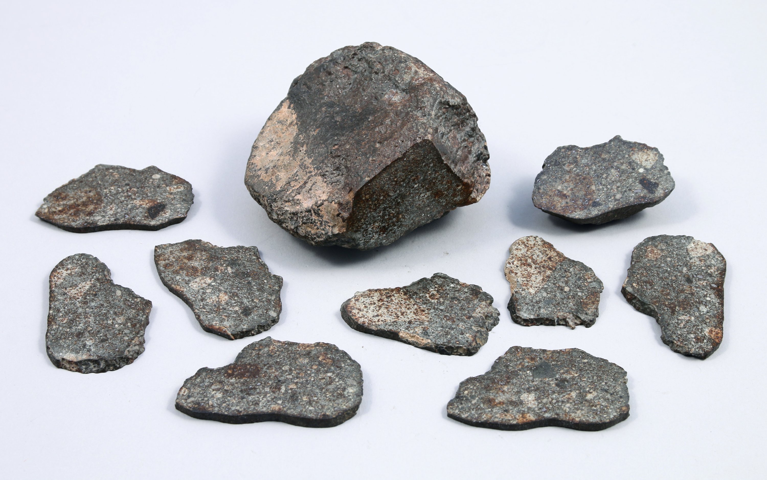 Joint: Huit TRANCHES entières de MÉTÉORITE L4/5. Une face polie, l'autre naturelle. 166,8 g. Météorite très bien préservée.