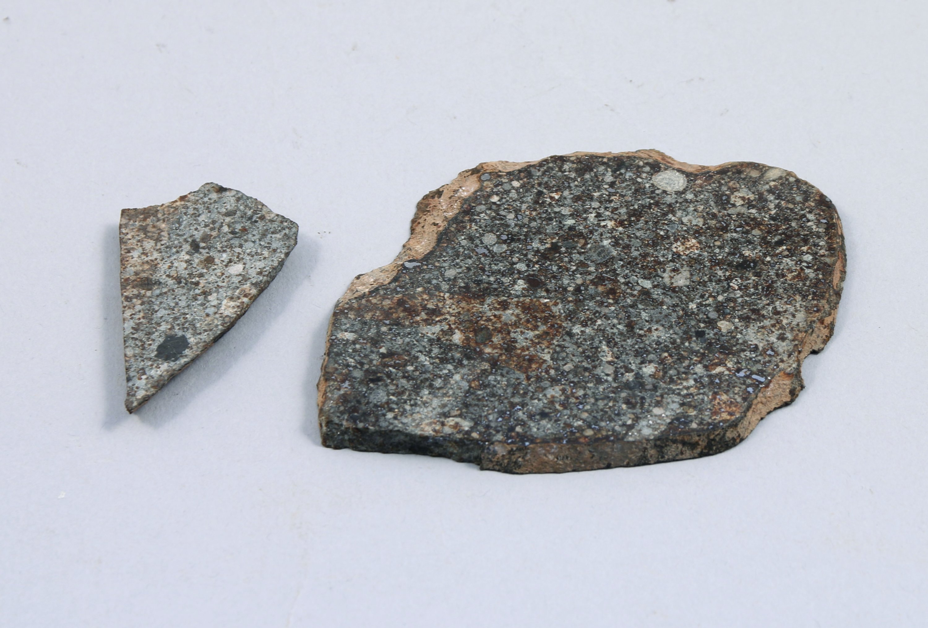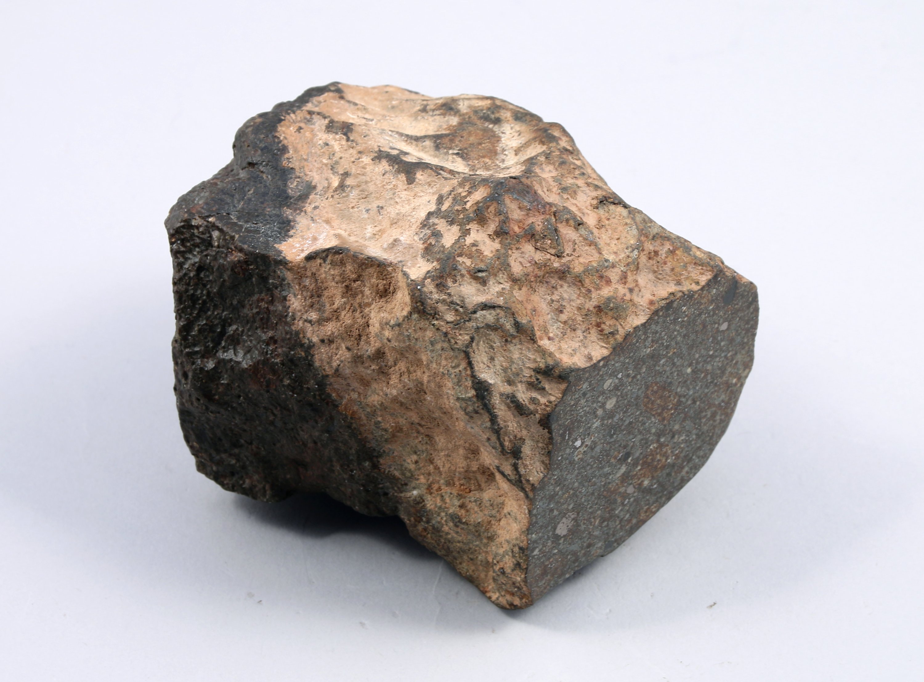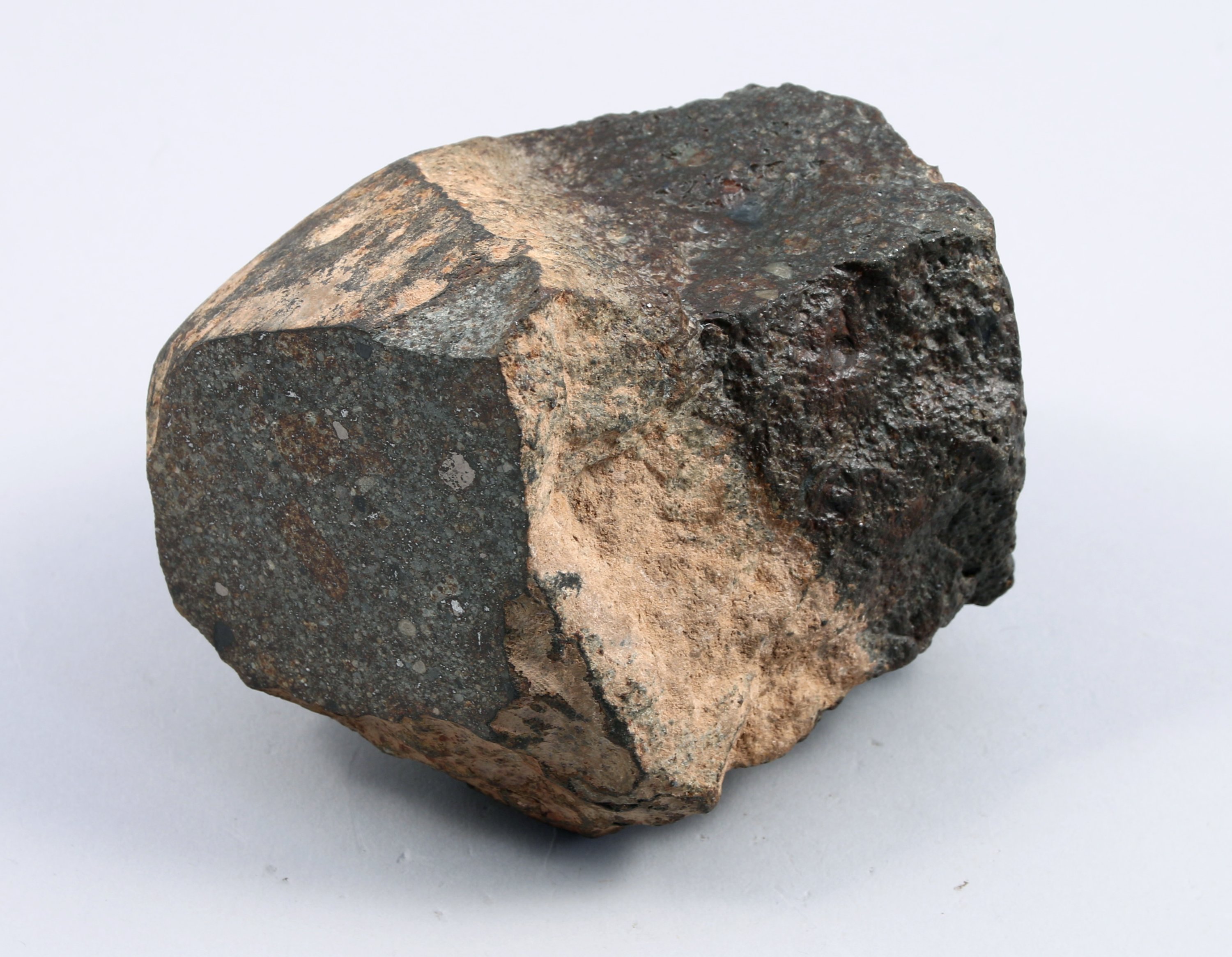 CHONDRITE L3,9/L5. Une MÉTÉORITE " NWA 2243 " à matrice intérieure riche en chondre et en grain de ferronickel, belle croûte de fusion, jolis regmaglyptes. Une face coupée et polie.