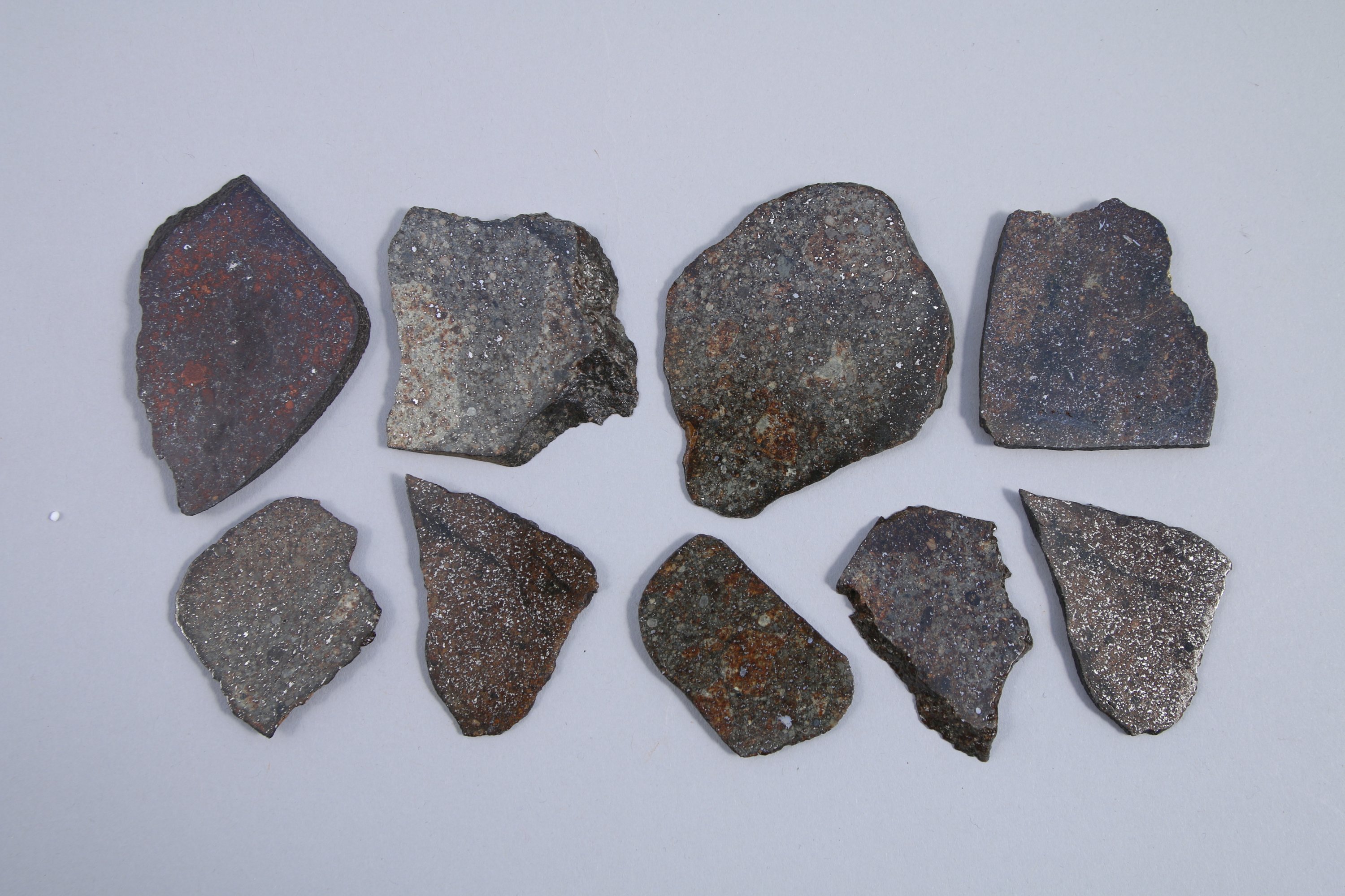 CHONDRITE H ou L. LOT de TRANCHES de MÉTÉORITE de la " Ceinture d'Astéroïdes " entre Mars et Jupiter. Une face polie et légèrement vernie, une face naturelle.