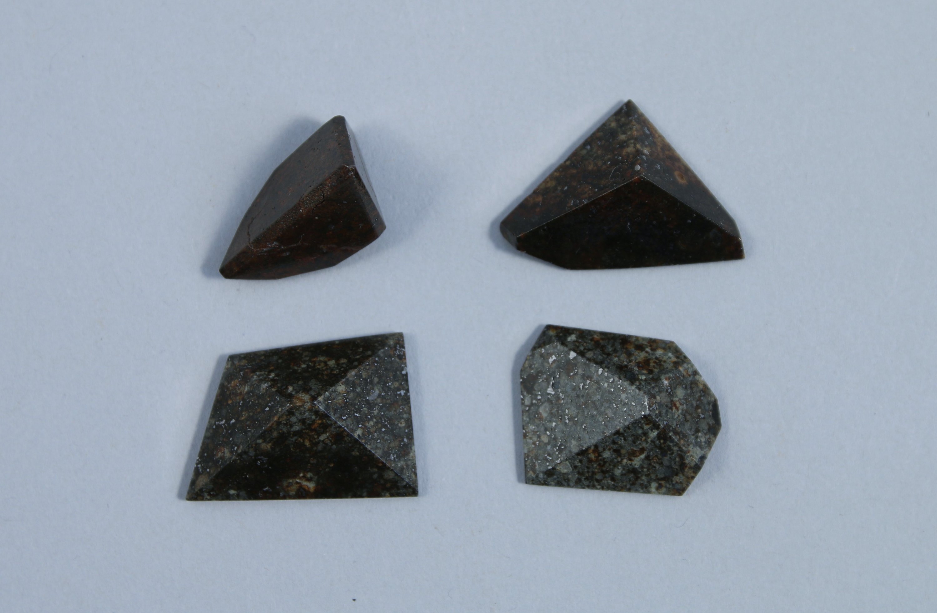 Joint: CHONDRITE H ou L. Deux lots de DEUX petites PYRAMIDES en MÉTÉORITE facettée de la Ceinture d'Astéroïdes entre Mars et Jupiter. Polies et légèrement vernies. Entre 7 et 10g.