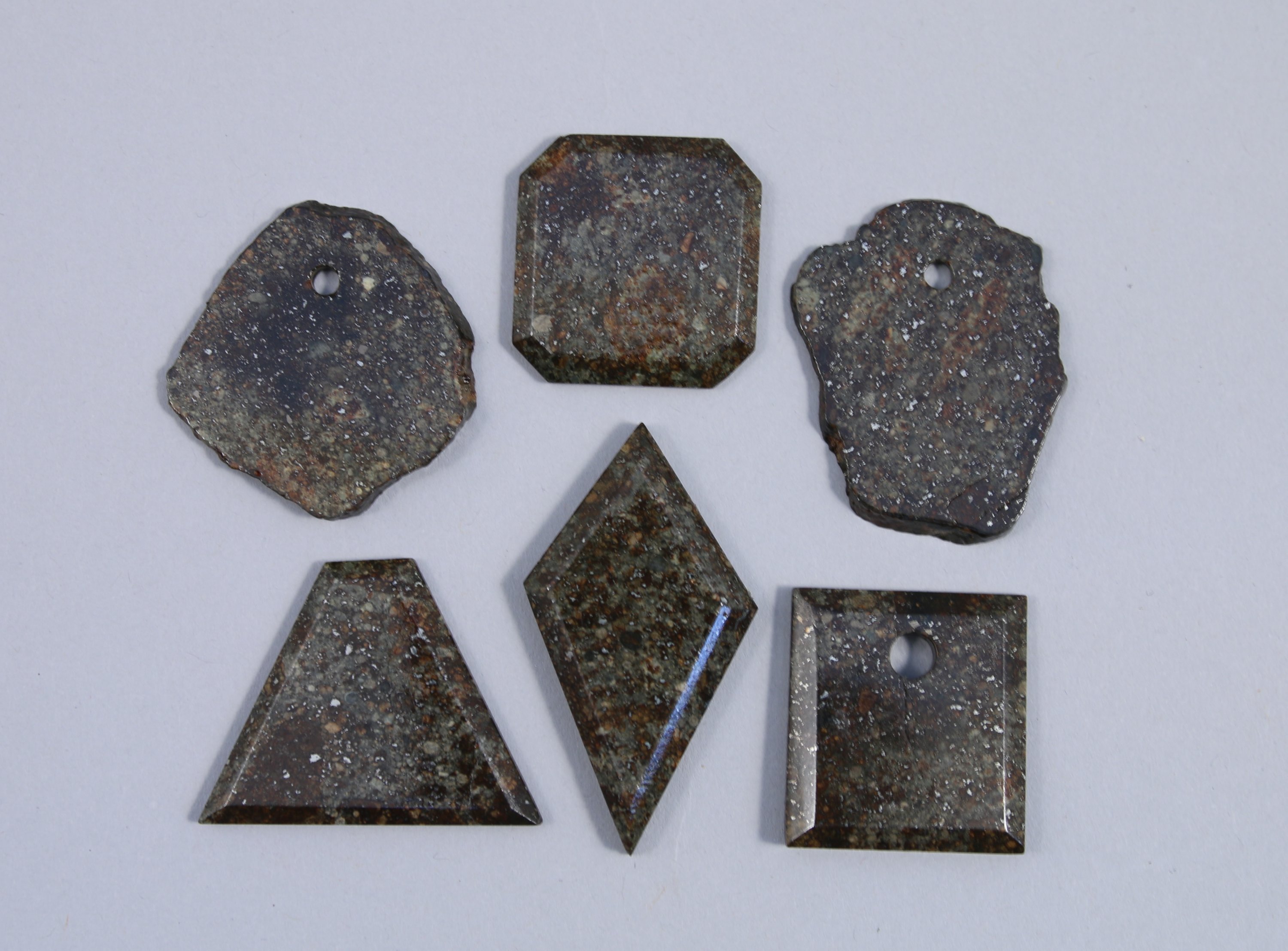CHONDRITE H ou L. LOT de SIX CRÉATIONS ORIGINALES en MÉTÉORITE facettée de la " Ceinture d'Astéroïdes " entre Mars et Jupiter. Faces polies et légèrement vernies.