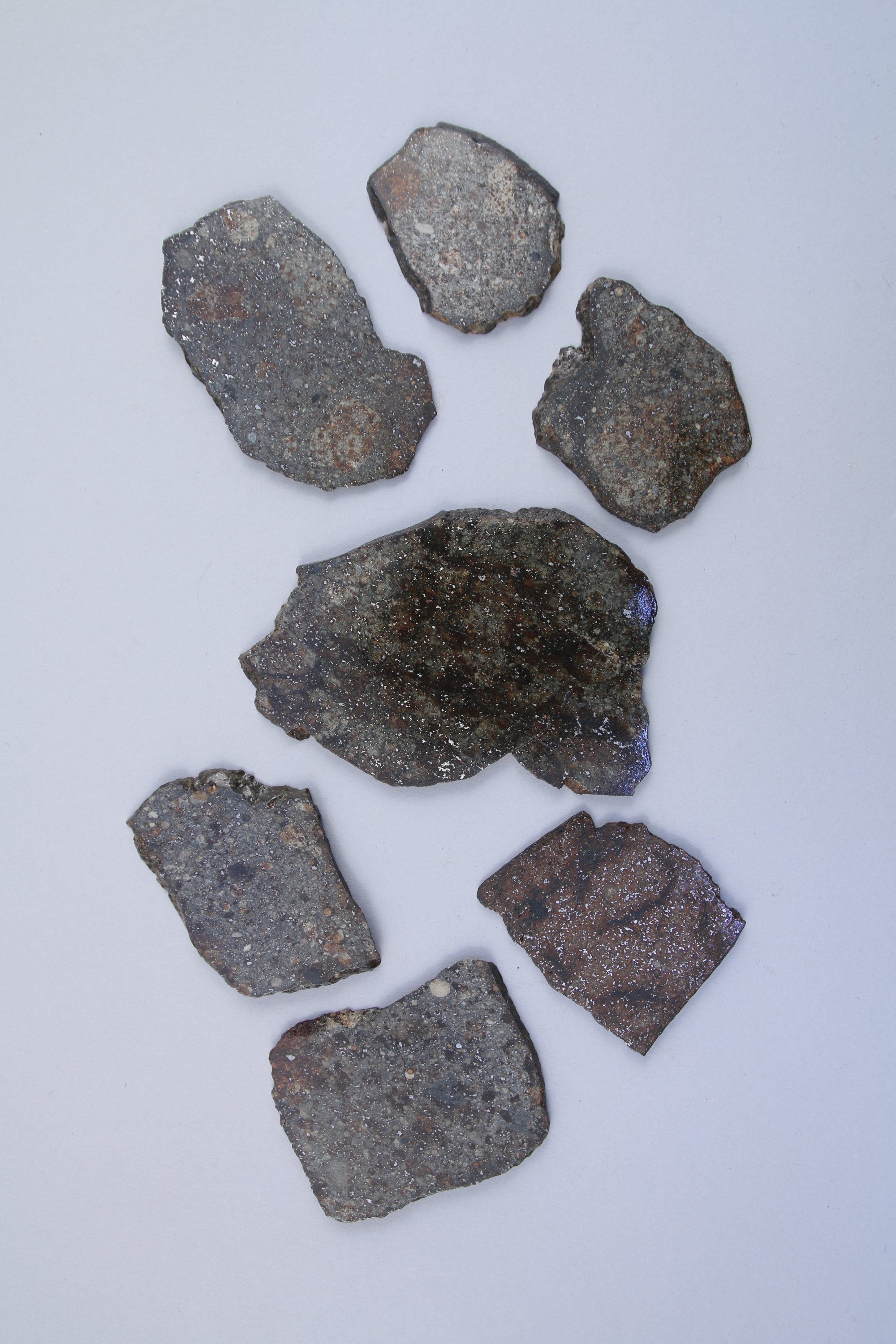 CHONDRITE H ou L. LOT de SEPT TRANCHES de MÉTÉORITE de la " Ceinture d'Astéroïdes " entre Mars et Jupiter. Une face polie et légèrement vernie, l'autre naturelle.