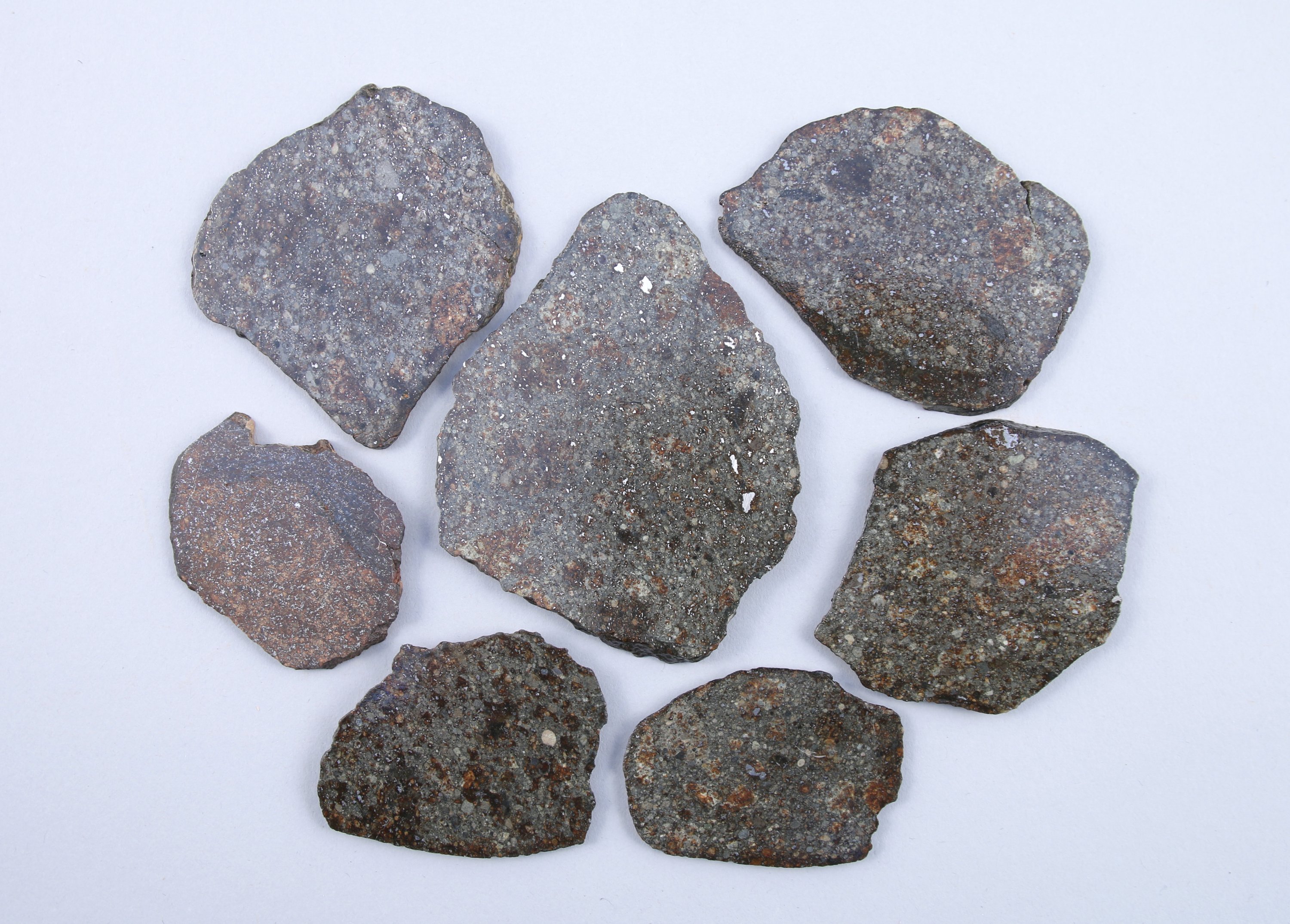 CHONDRITE H ou L. LOT de SEPT TRANCHES de MÉTÉORITE de la " Ceinture d'Astéroïdes " entre Mars et Jupiter. Une face polie et légèrement vernie, l'autre naturelle.