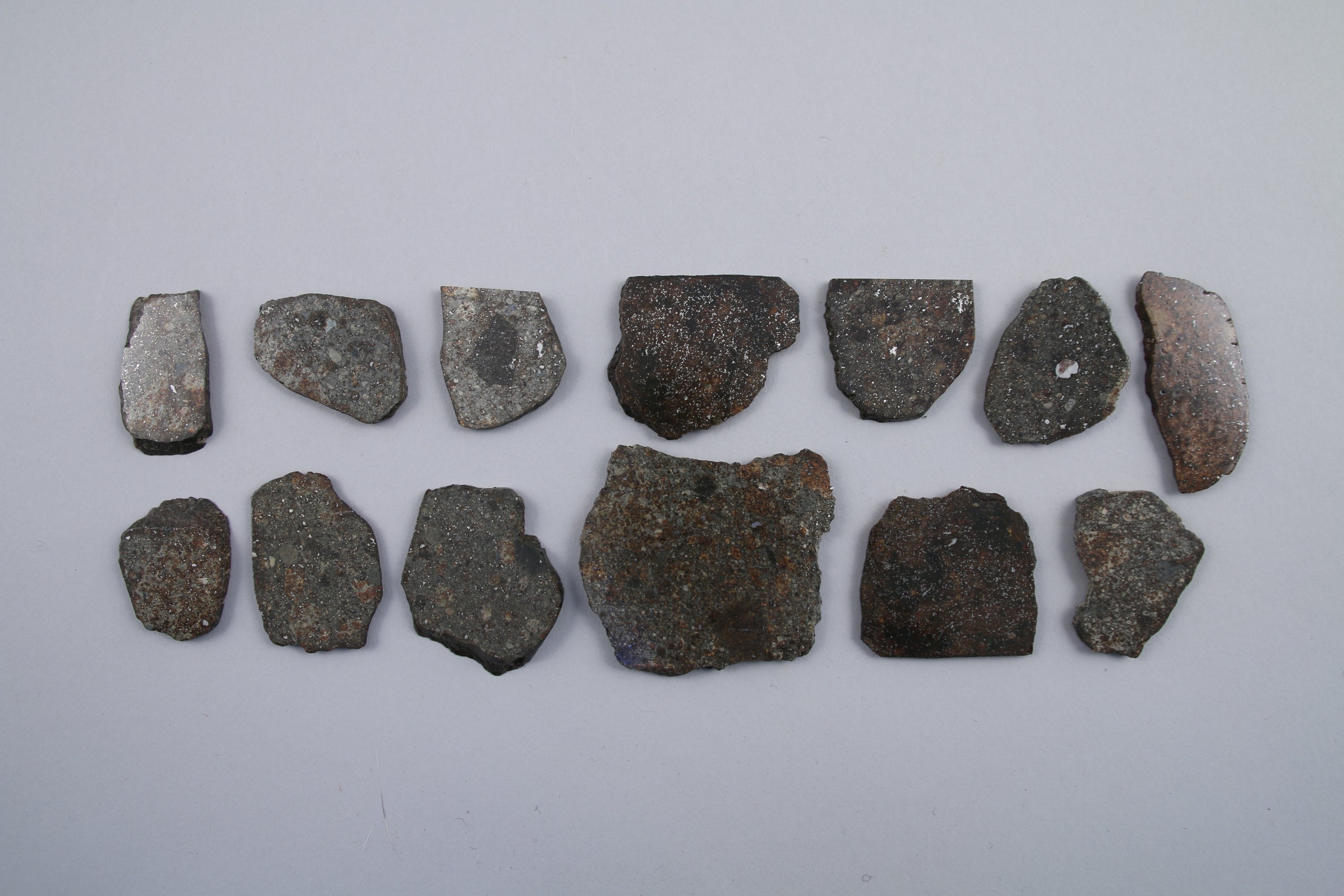 CHONDRITE H ou L. LOT de TREIZE TRANCHES de MÉTÉORITE de la " Ceinture d'Astéroïdes " entre Mars et Jupiter. Une face polie et légèrement vernie, l'autre naturelle.