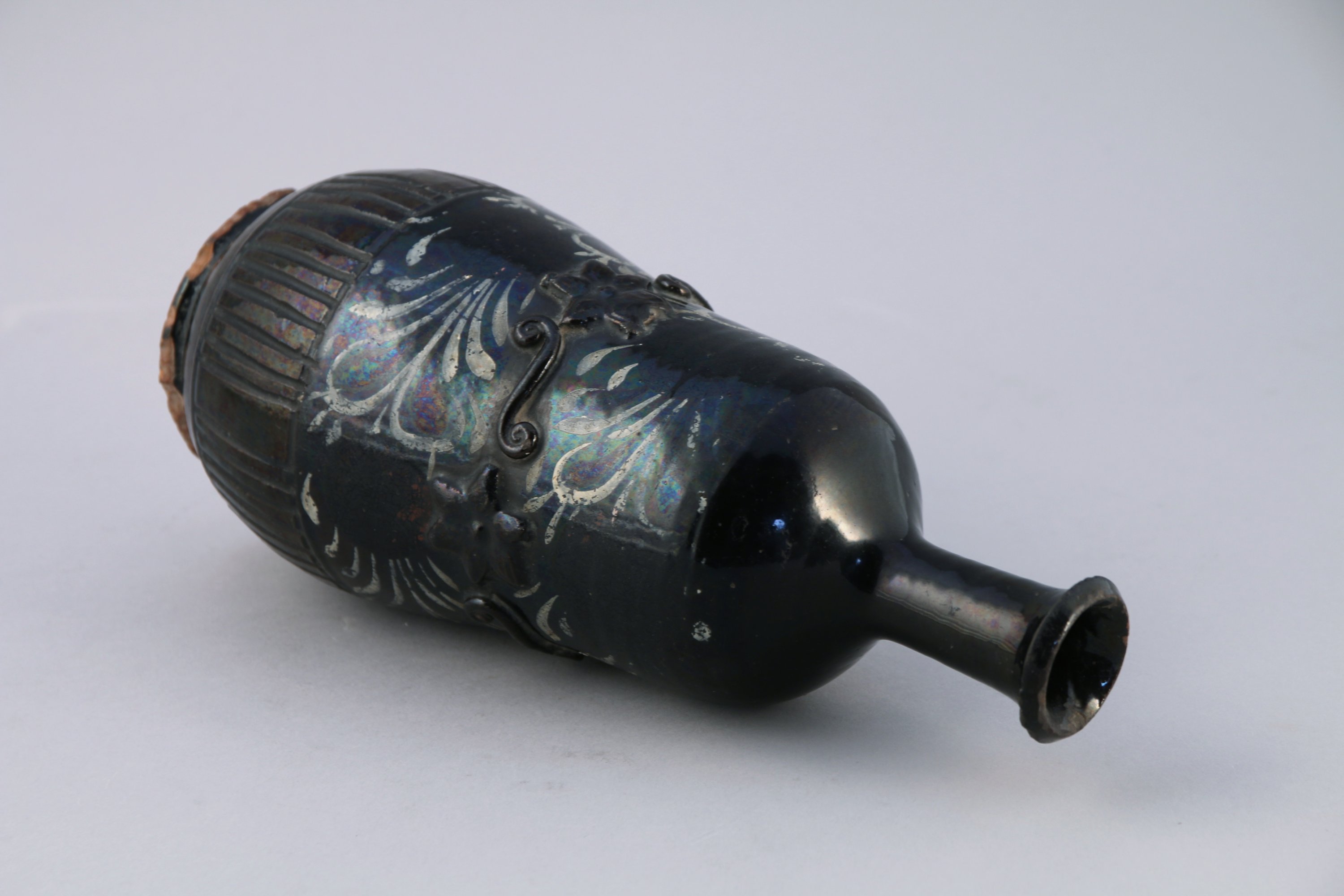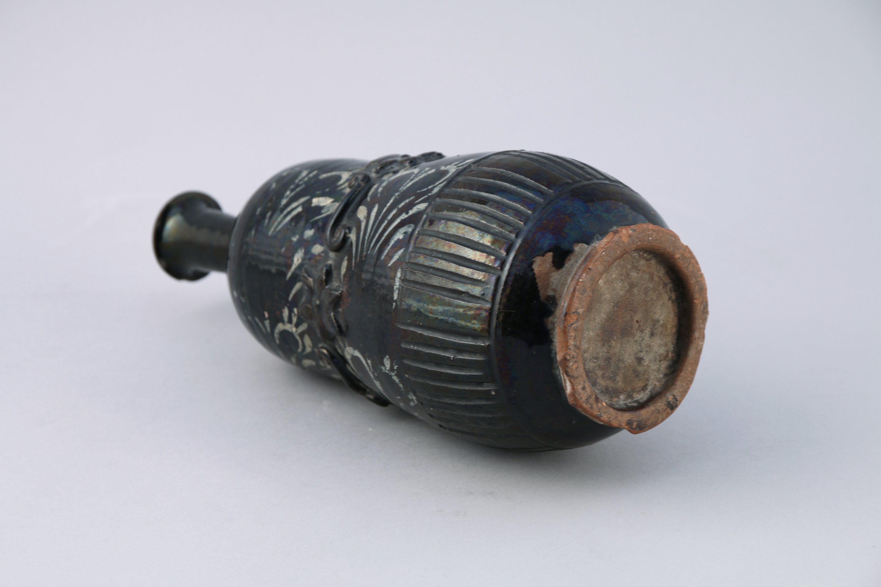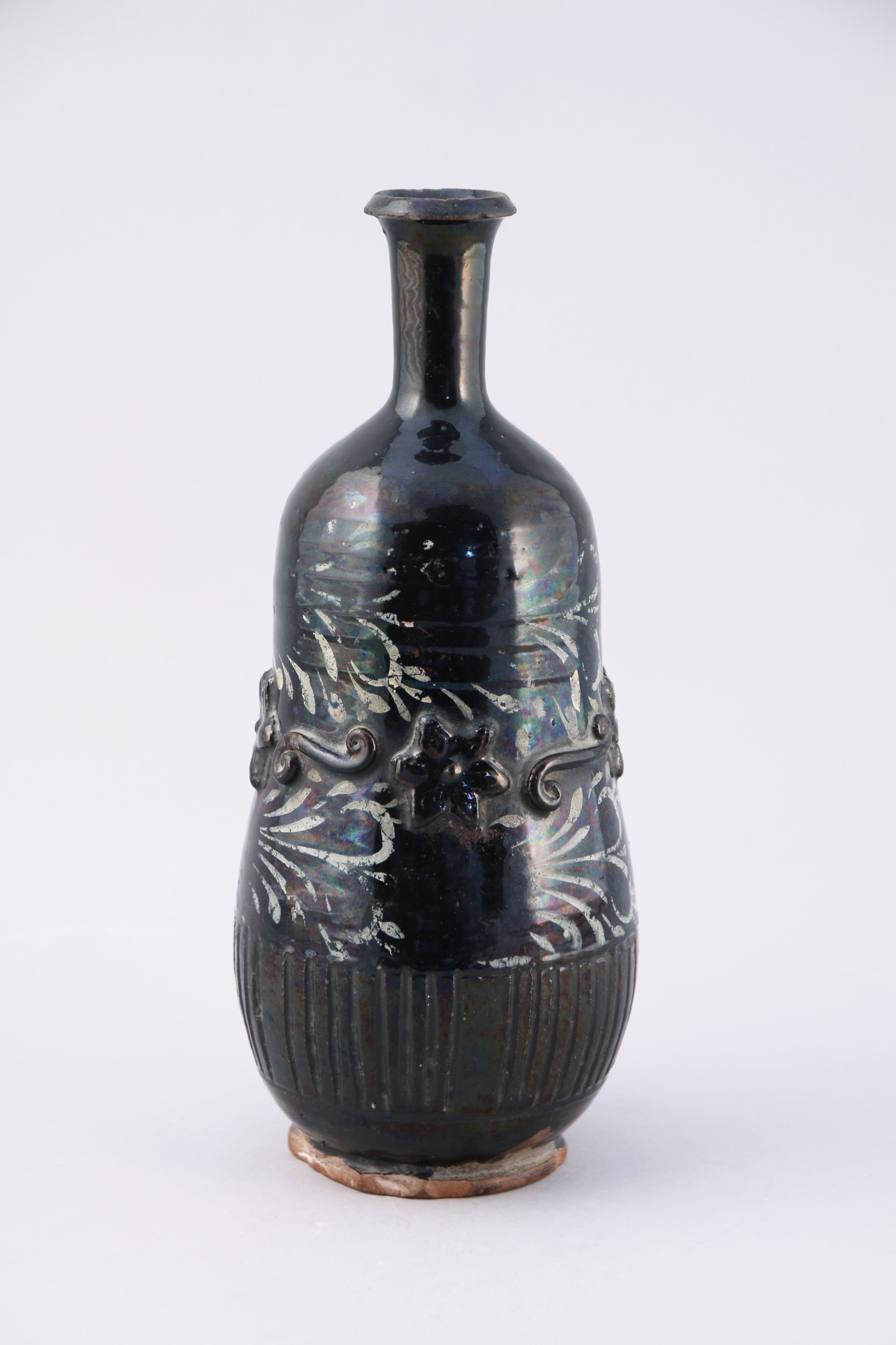 BOUTEILLE en terre cuite émaillée noire à décor en blanc de palmettes. Applications de fleurons et enroulements. Partie inférieure godronnée.