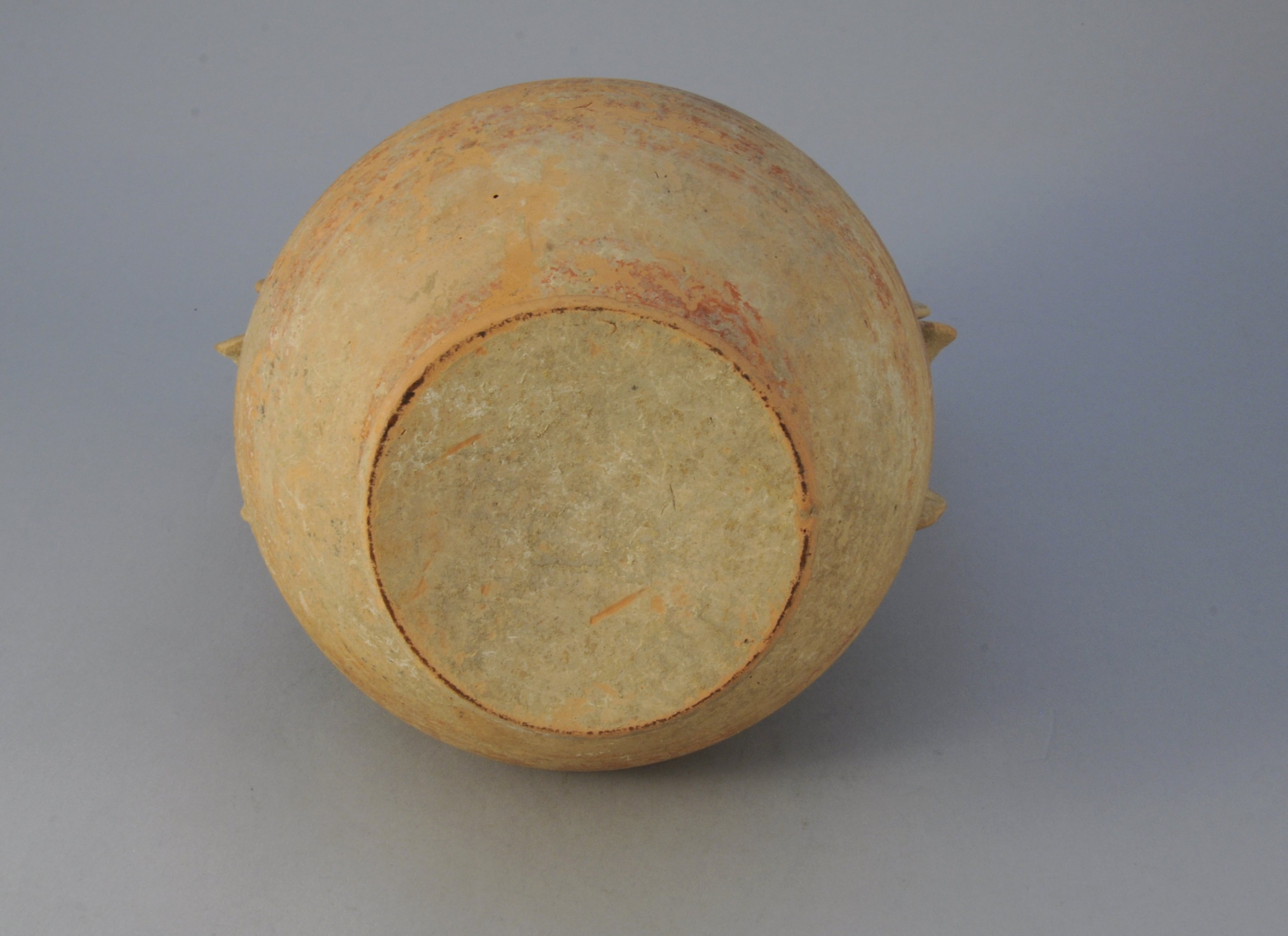 TROZELLA à rouelles, la panse peinte de registres de chevrons. Terre cuite et pigments ocres.
