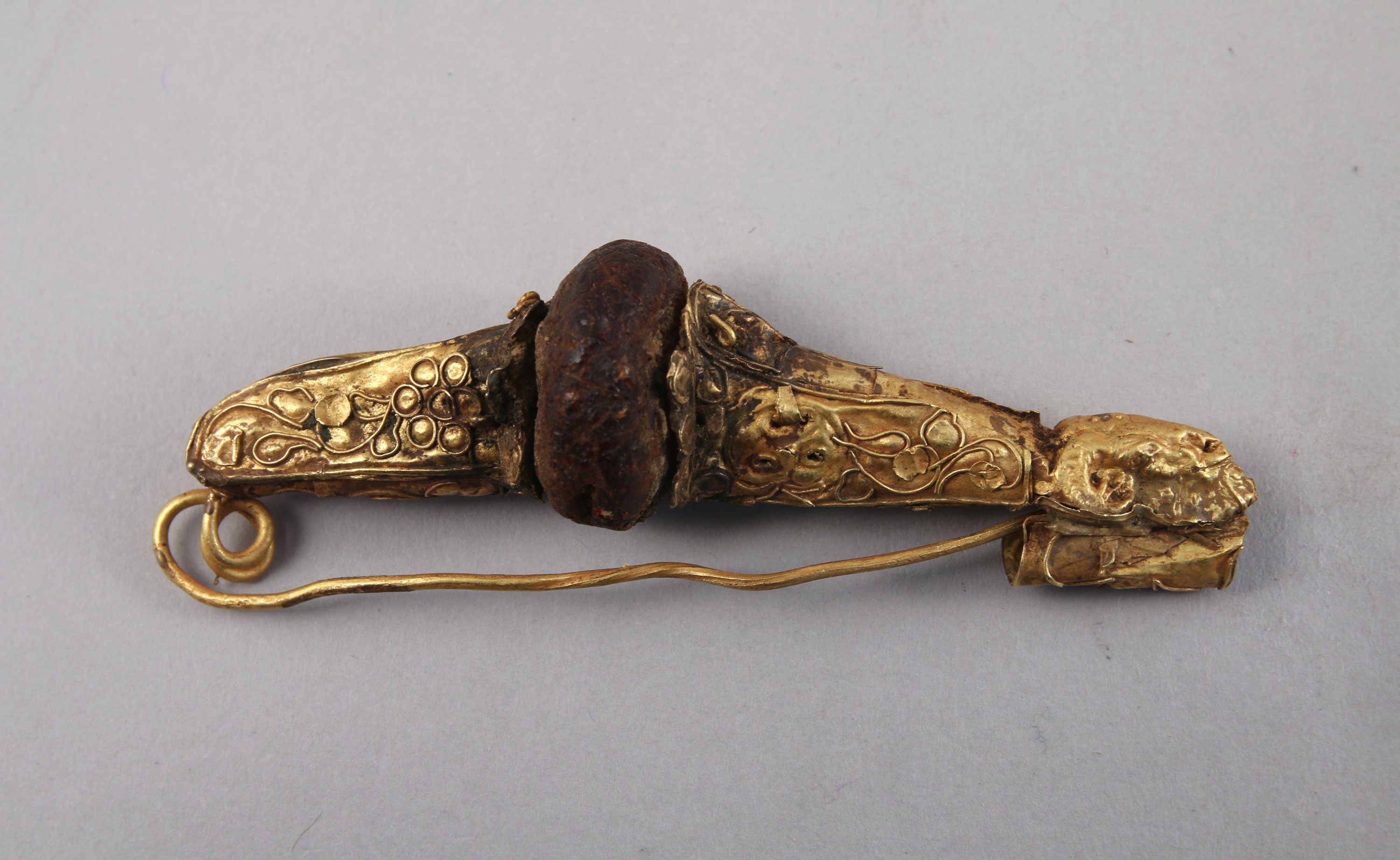 GRANDE FIBULE en or fourré avec anneau d'ambre. Le corps de la fibule est orné de rosaces, de feuillages en filigrane, l'extrémité représente une tête de bélier, l'épingle est à ressort.