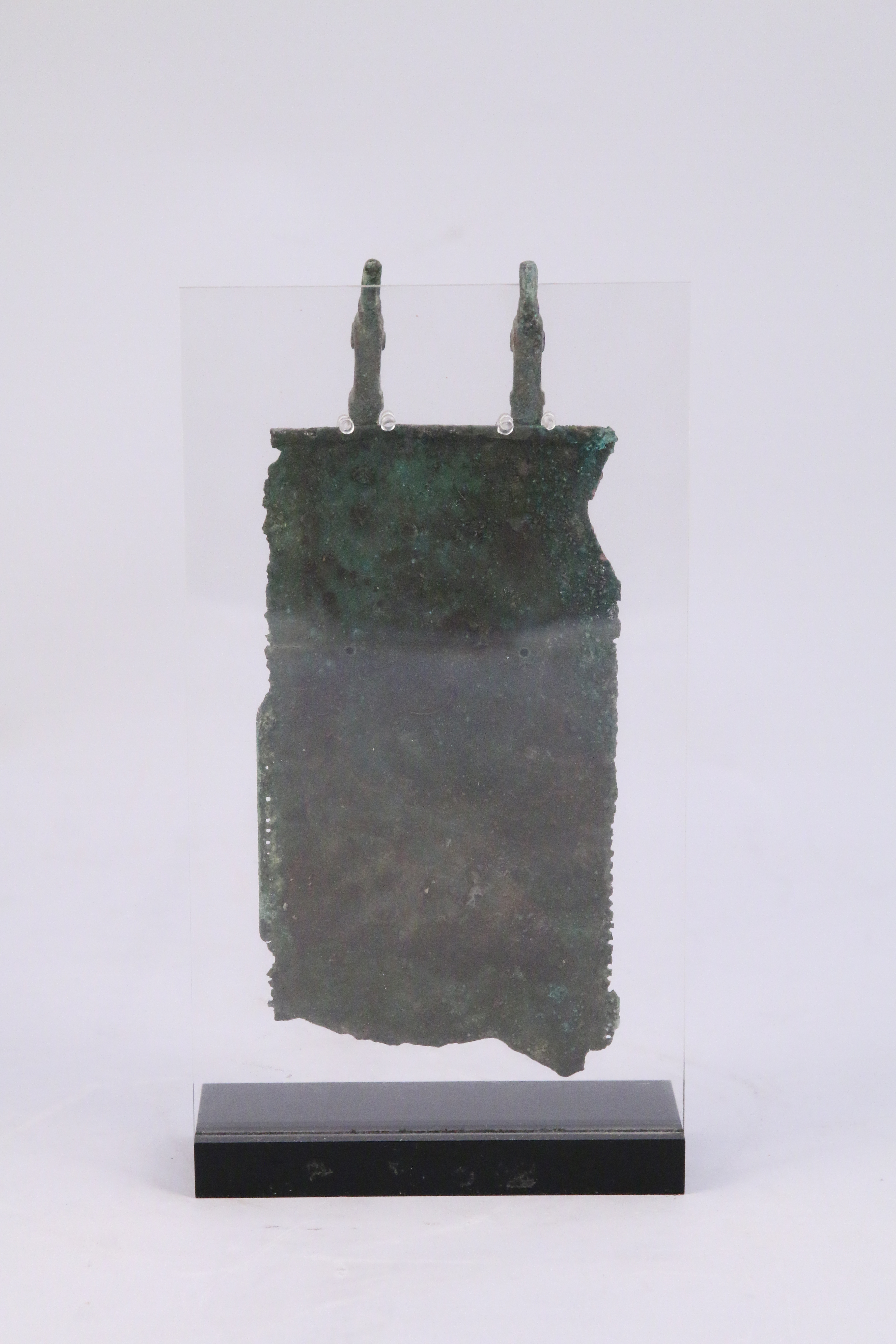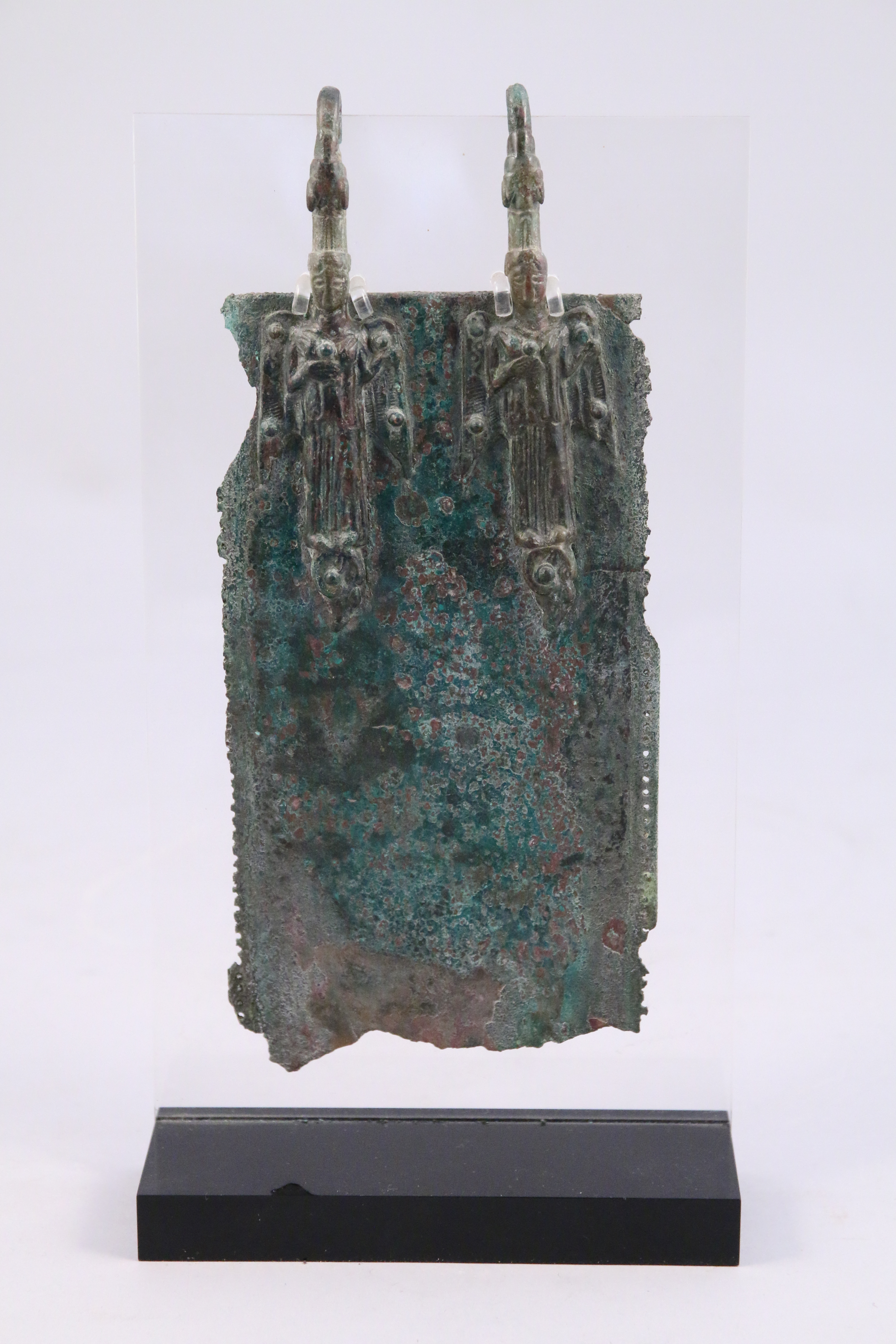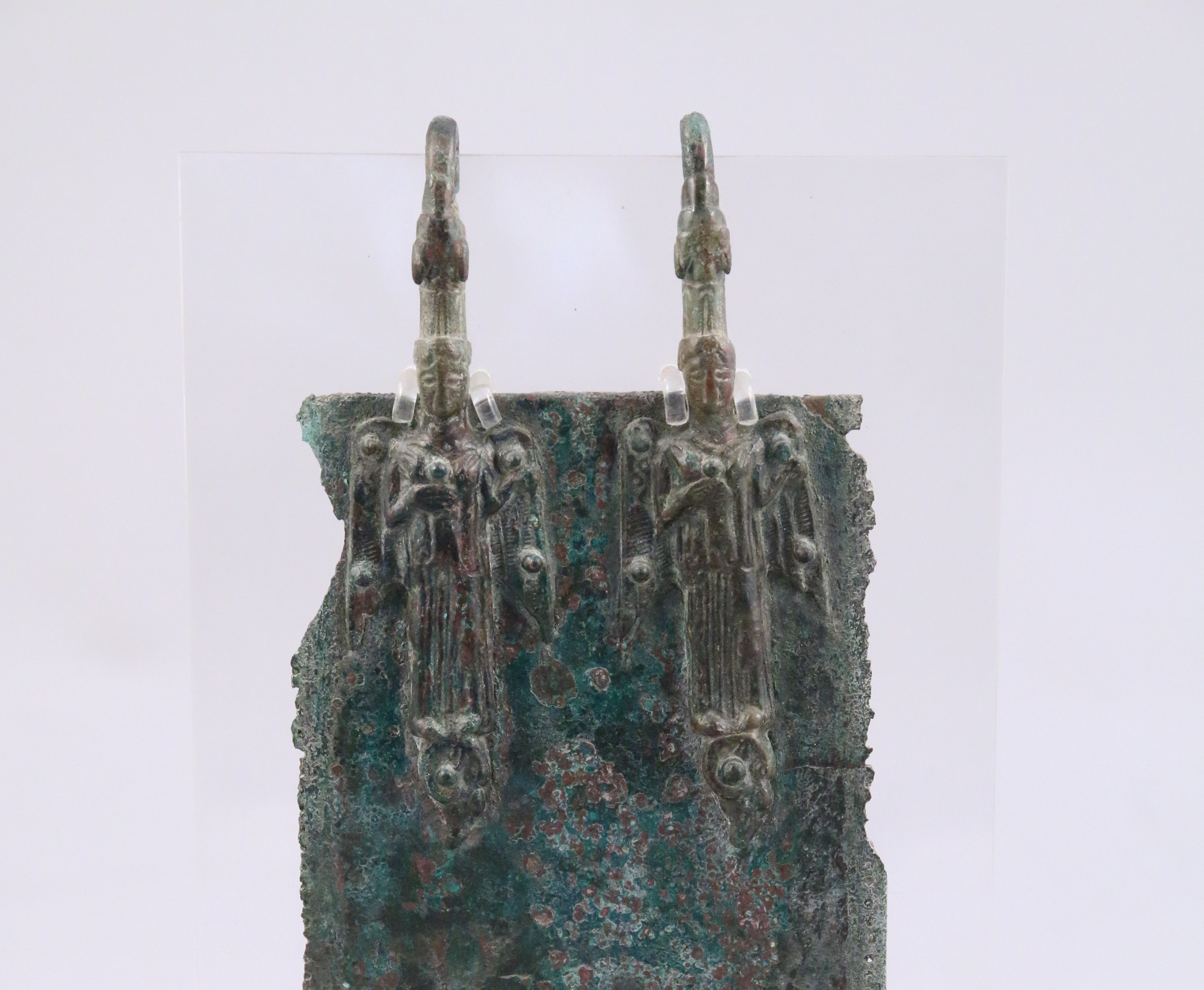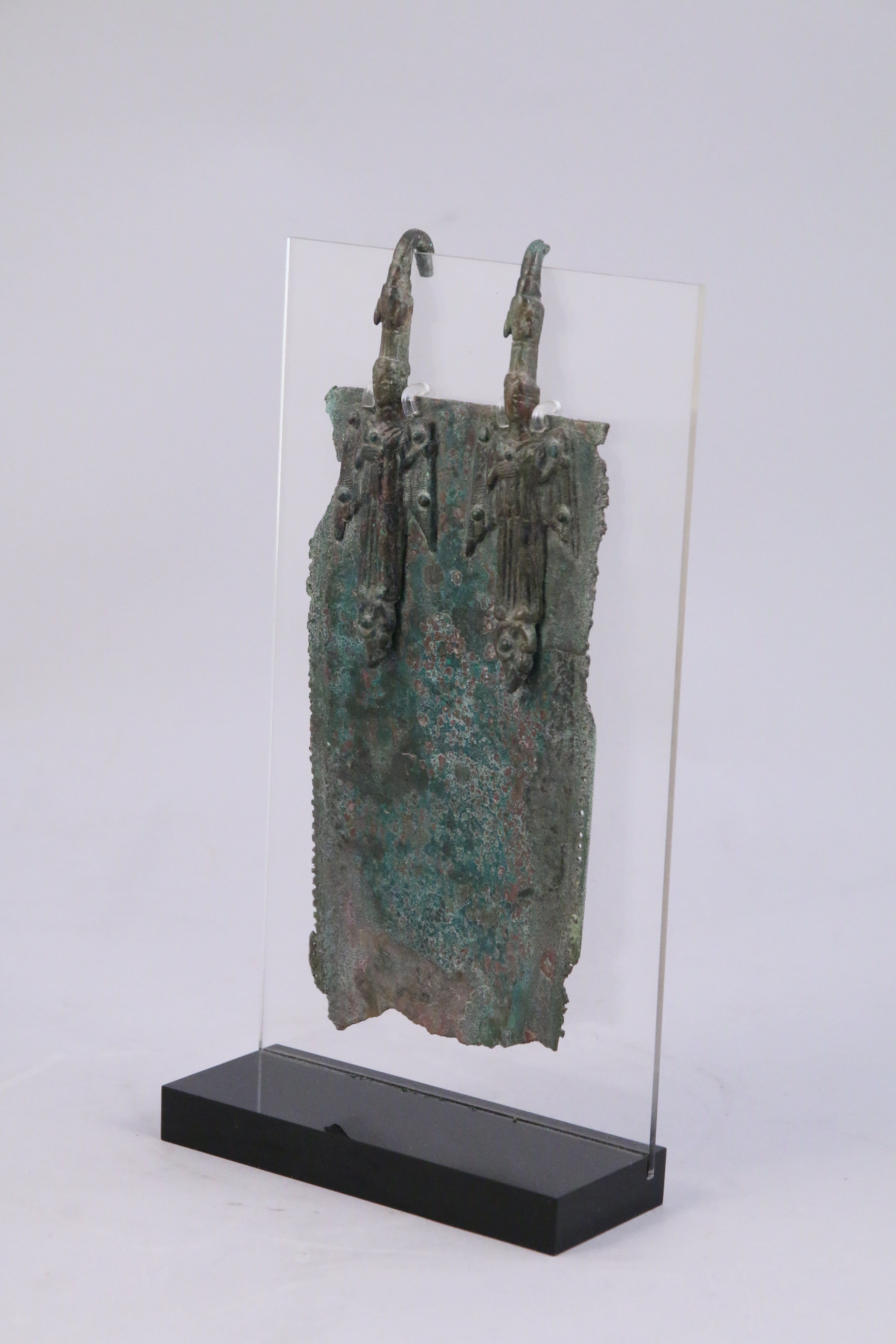 FERMAIL en bronze laminé à patine de fouille. Plaque rectangulaire sur laquelle sont fixées au moyen de petits clous, deux figurines ailées la tête surmontée de l'avant-corps d'un animal dont le bec recourbé servait de fermoir.
