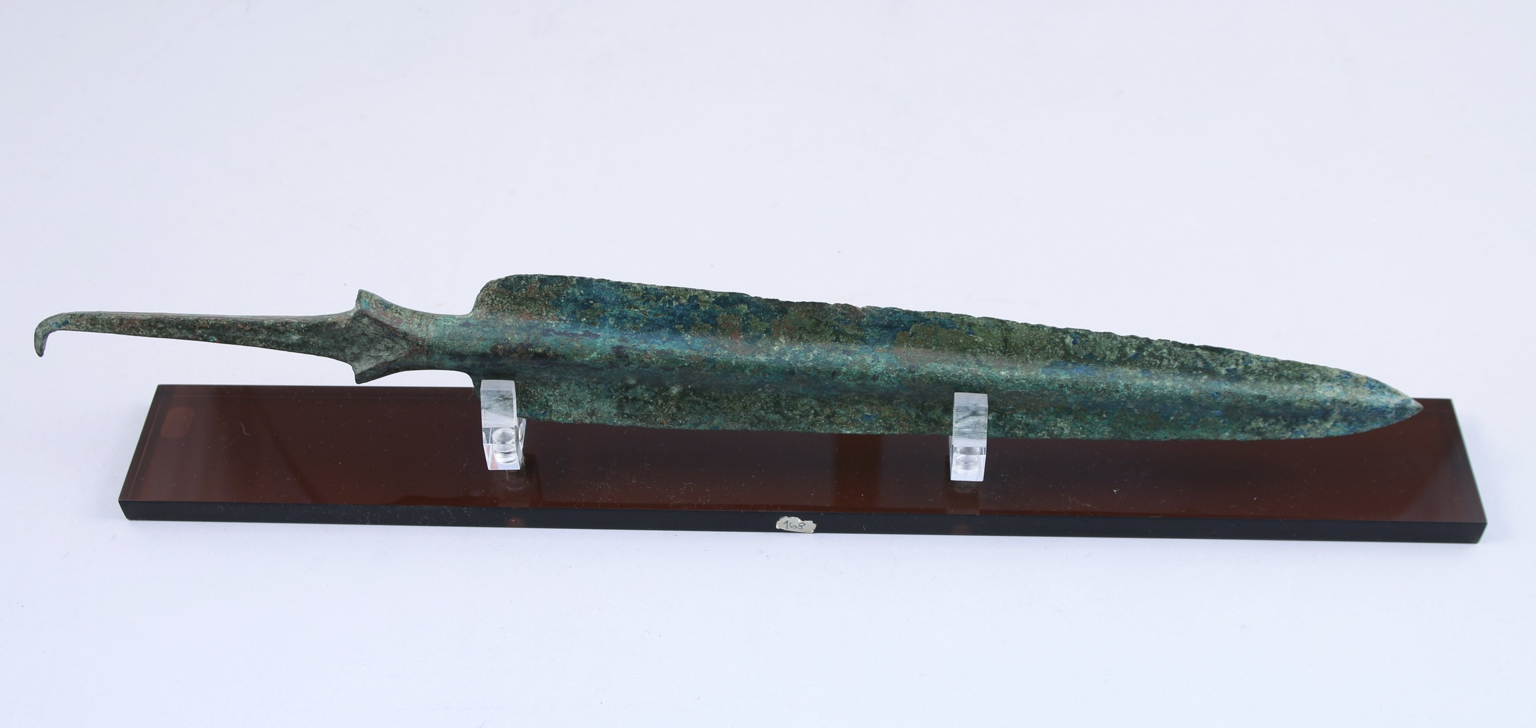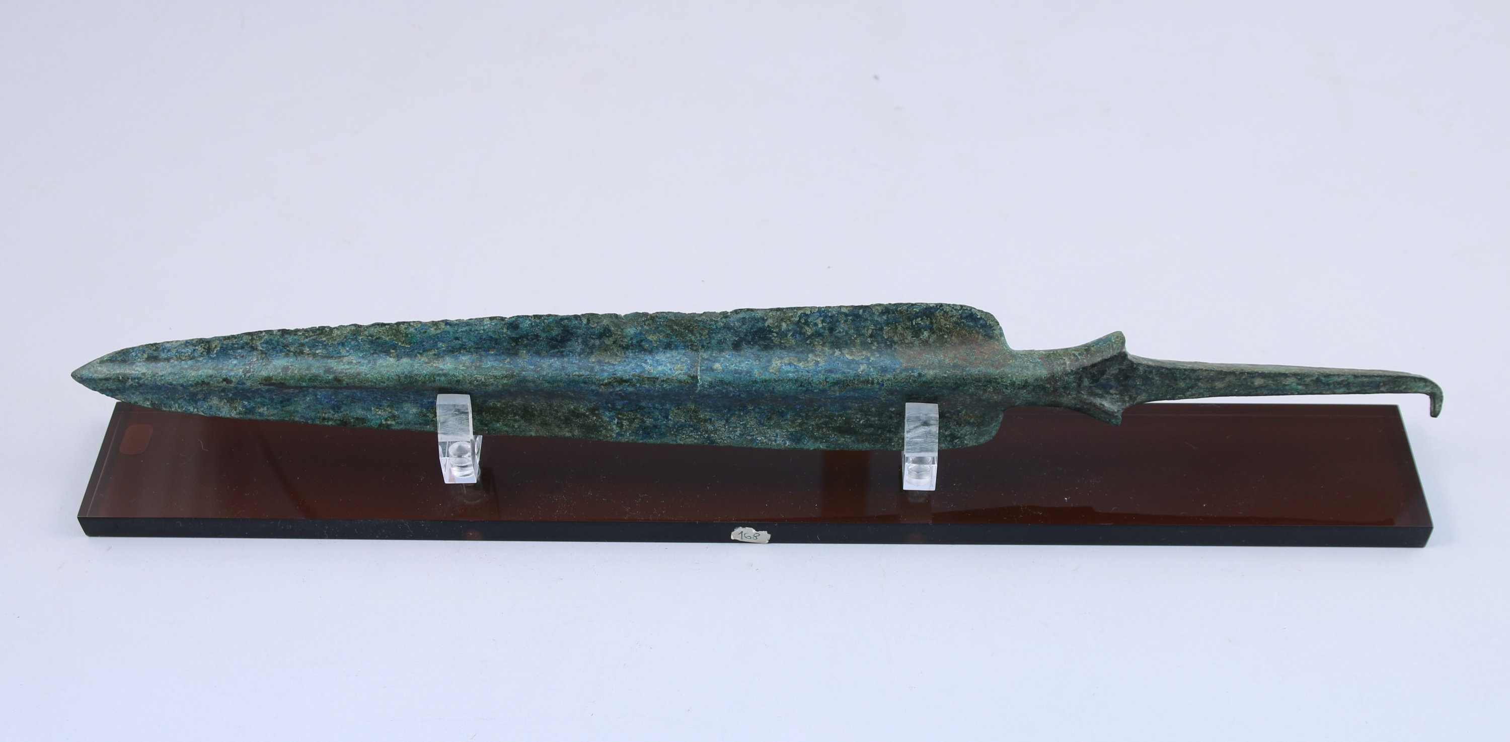 POIGNARD. Bronze patine verte, lame plate à renflement