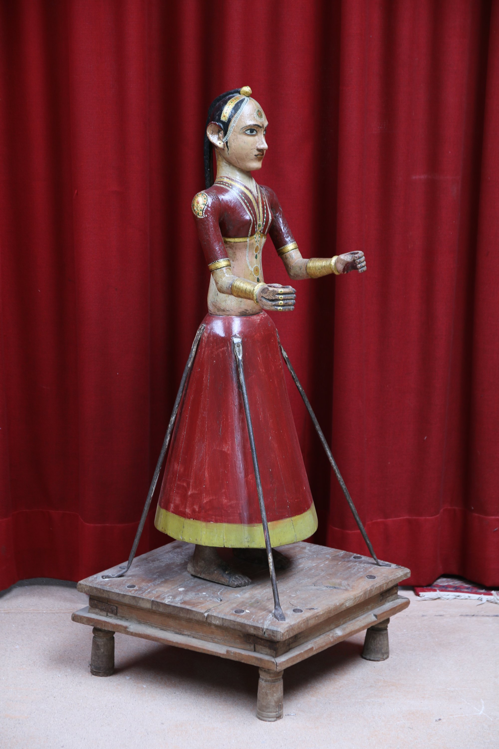 STATUETTE DE PROCESSION en bois polychrome sculpté figurant la déesse Gauri I/parvati. Tenue sur un socle en bois à quatre pieds par quatre pattes en fer.