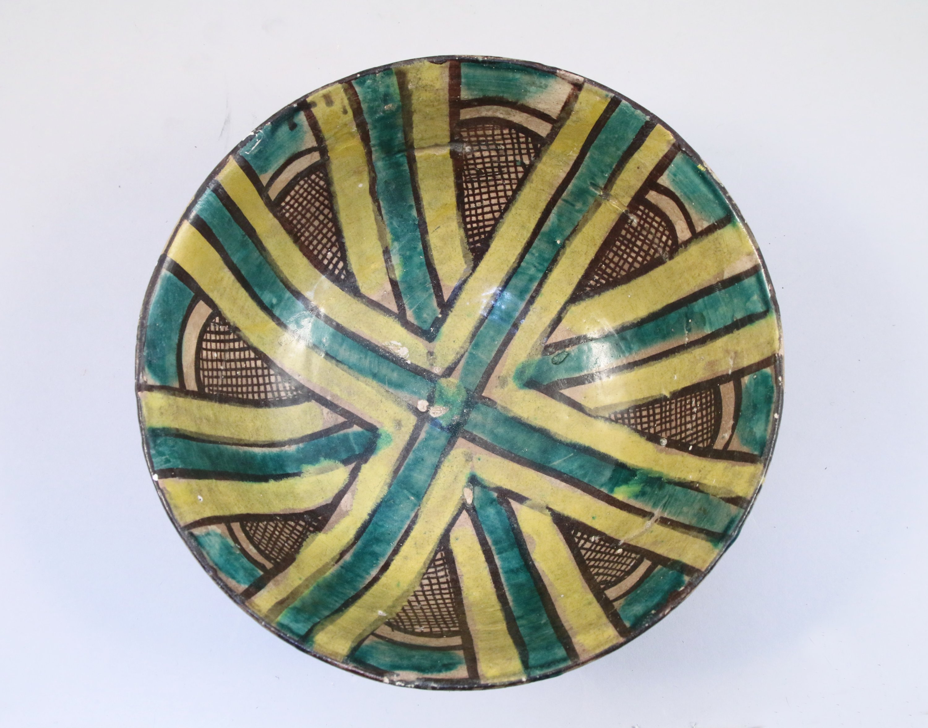 COUPE de type Nichapour. Céramique argileuse à décor de bandes rayonnantes jaunes et vertes soulignées de noir.