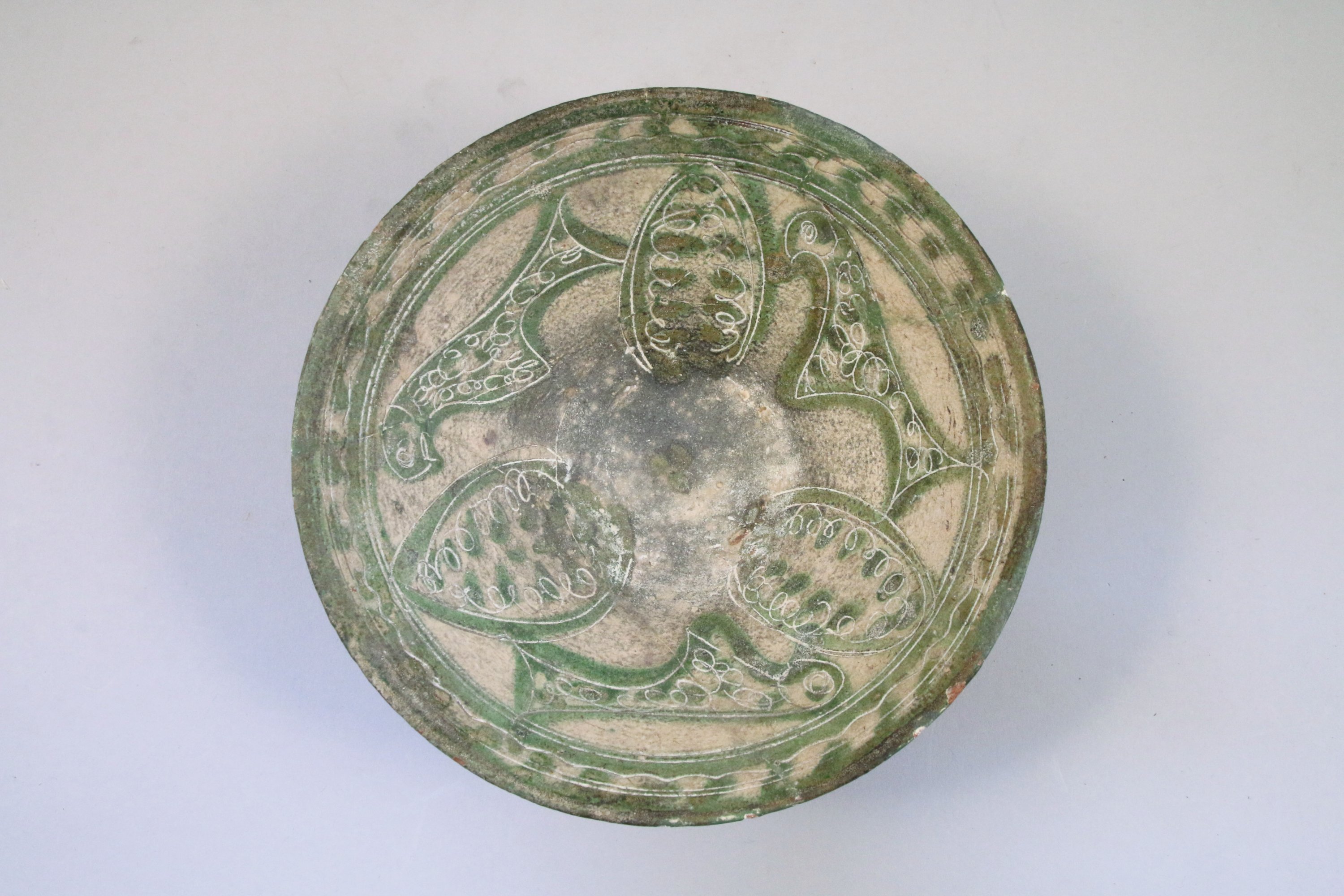 COUPE de type Amol. Céramique argileuse à décor incisé et peint en vert sous glaçure. Sur la panse, décor d'oiseaux et médaillons.