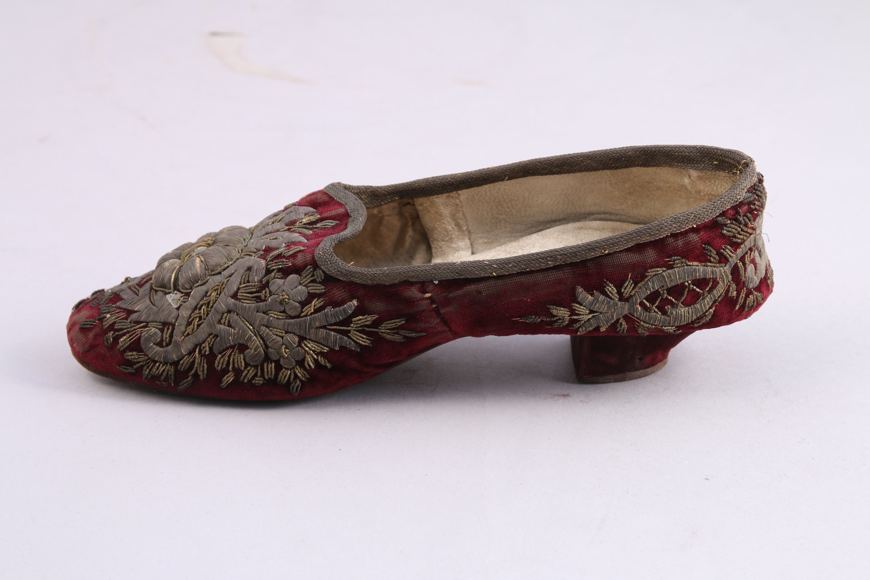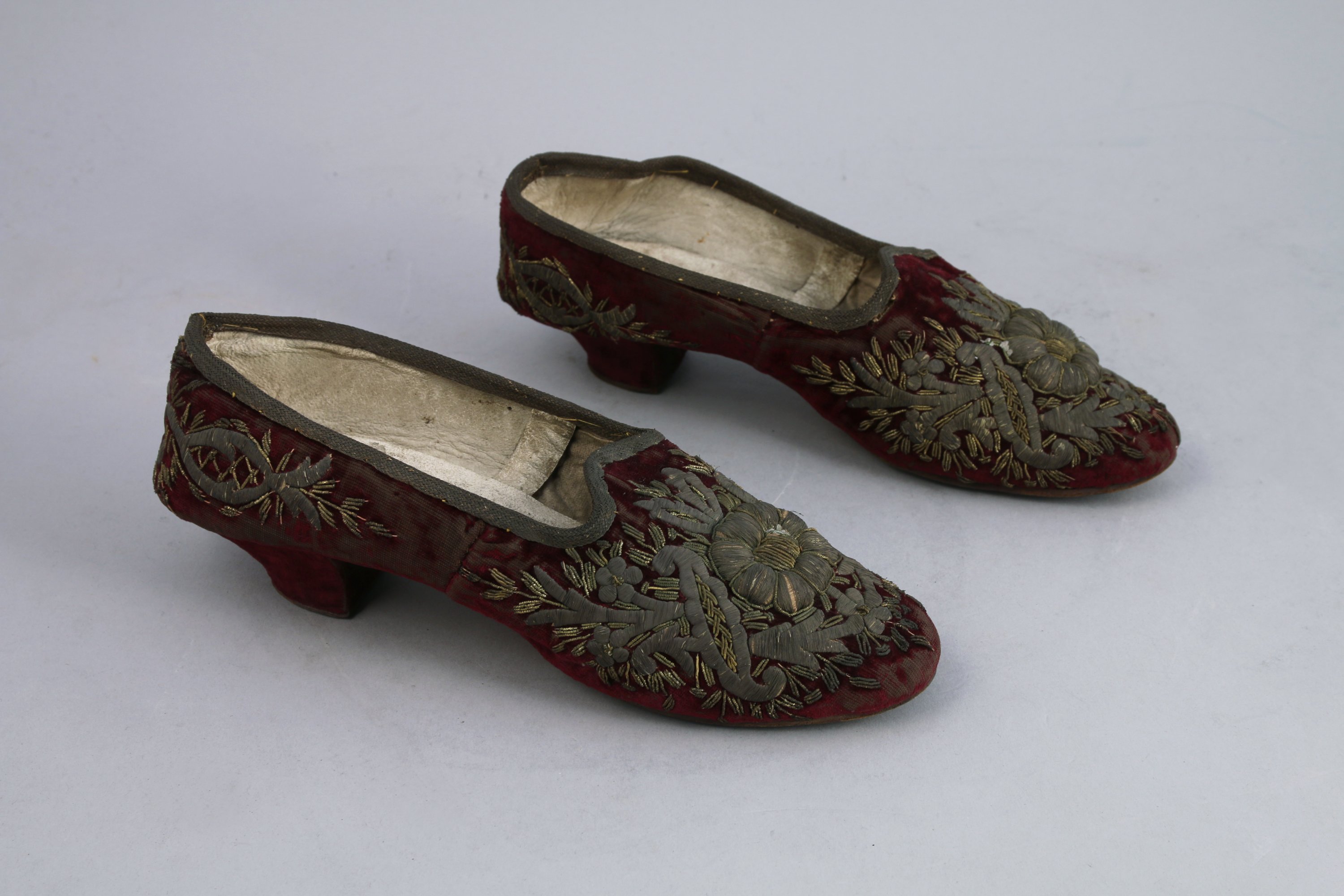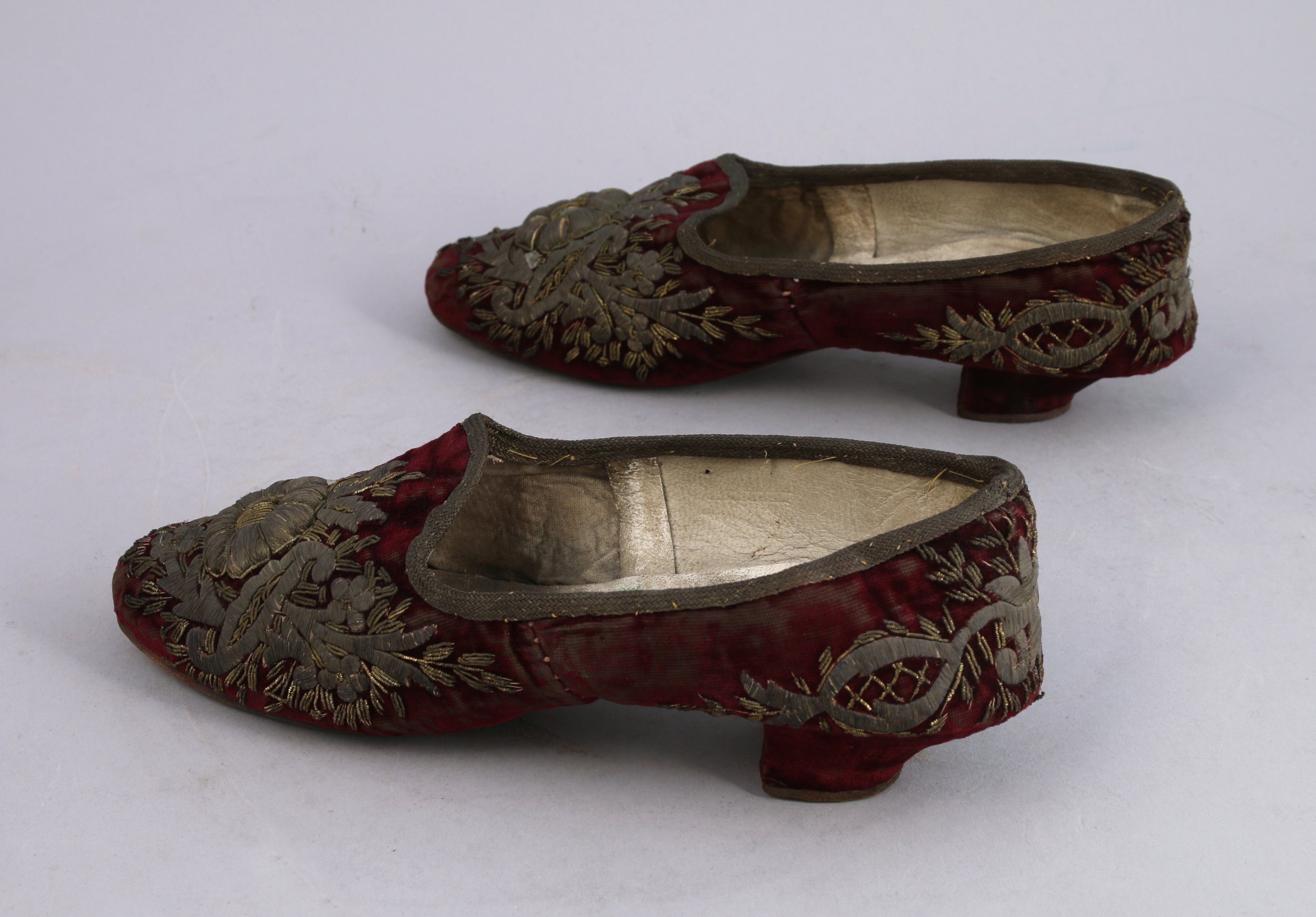 PAIRE d'ESCARPINS en velours rouge brodé en fil d'or de fleurs et rinceaux.