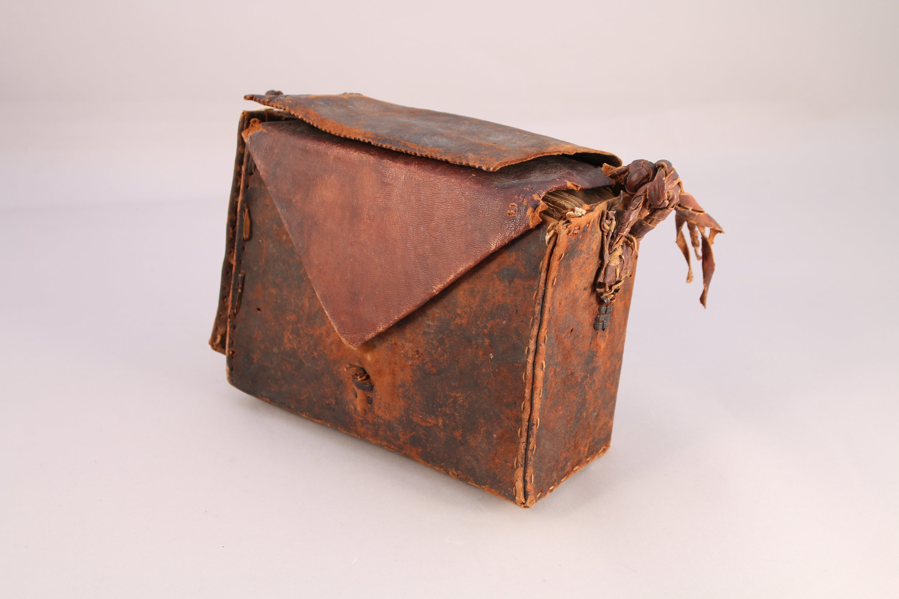 Reliure: Haut. 21, Larg. 17 cm. (pages manquantes, dans le désordre, déchirures, taches, restaurations, sacoche décousue)