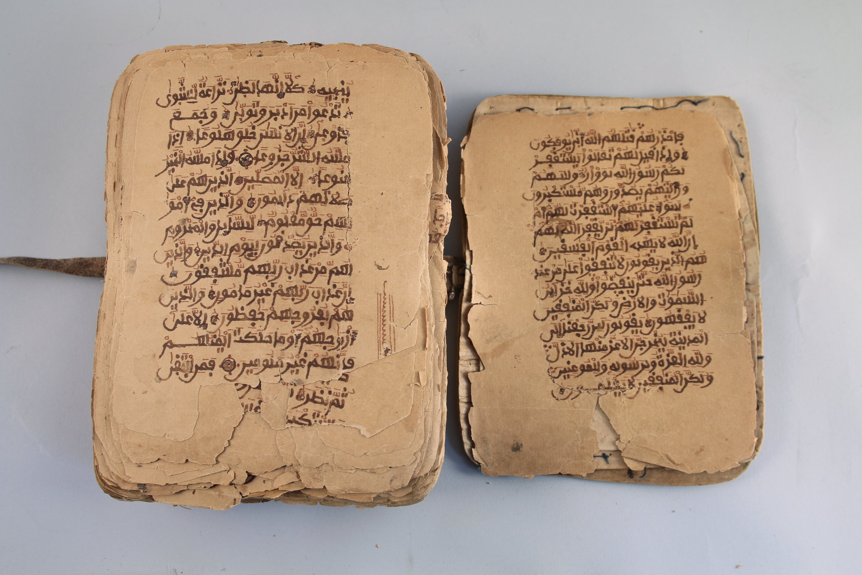 CORAN. Manuscrit incomplet sur papier de 13 lignes de texte par page en arabe à l'encre sépia et rouge pour certains termes et caractères. Séparations de versets et ornements marginaux à l'encre polychrome. Un décor de panneau de croisillons à la fin de la Sourate 18. Feuillets volants entre deux plats cartonnés, l'un à lanière de cuir achevée par un cauris. Sacoche en cuir à rabat et lanière.