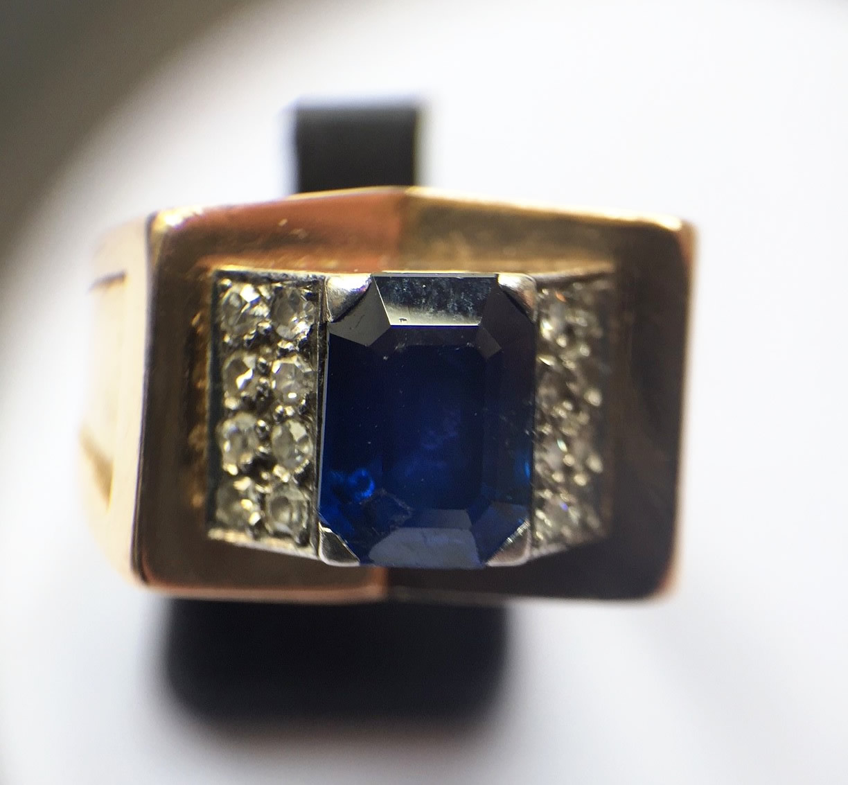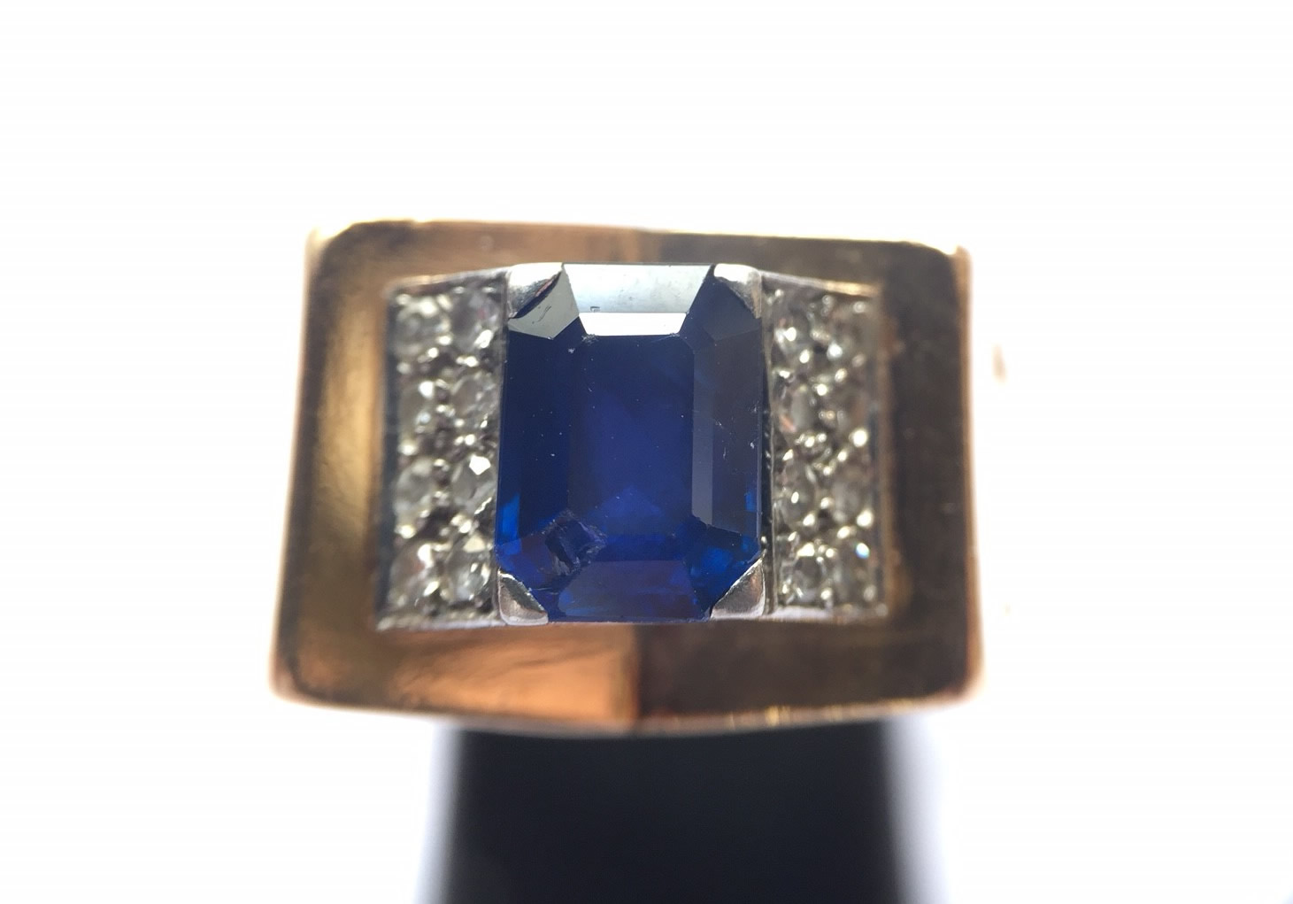 A yellow and platinum gold ring, adorned in the centre with a rectangular sapphire cut into four lines.