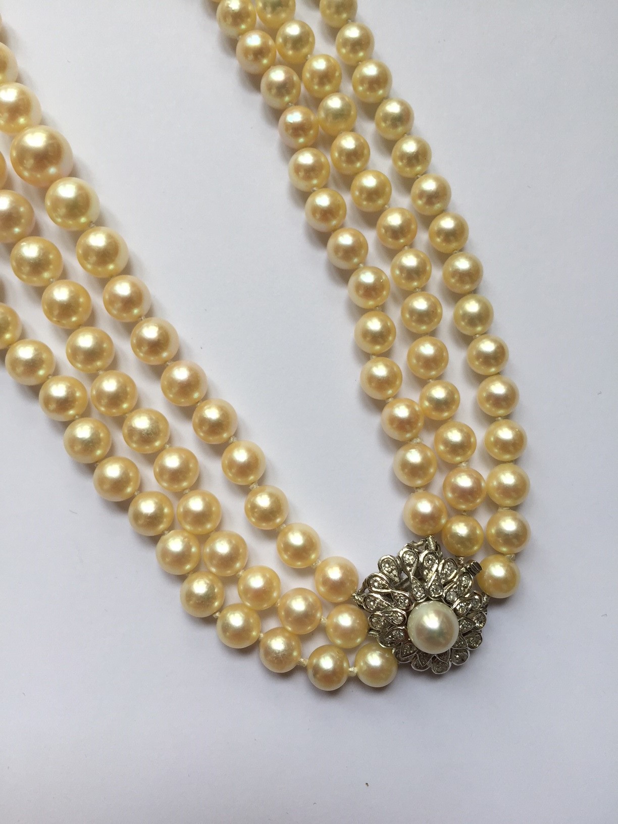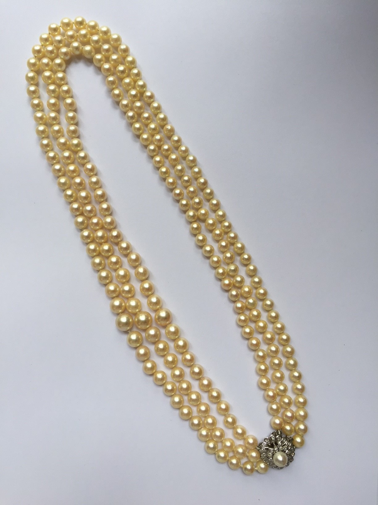 A three rows necklace of sixty-five, seventy-one and seventy-seven falling cultured pearls.