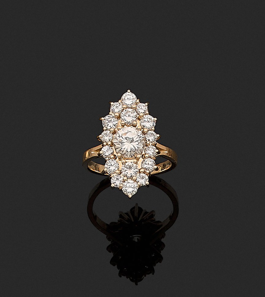 Le diamant central a un poids d'environ 1,30 ct. (G,VS). L'entourage est composé de seize diamants de taille brillant pour un poids total d'environ 2,10 ct.