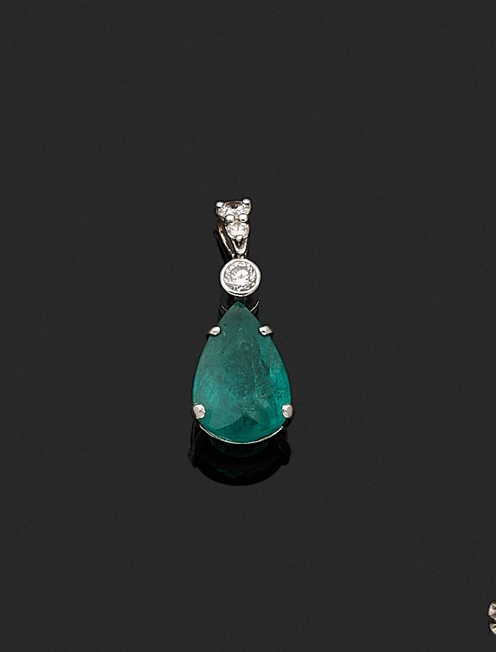 PENDENTIF en or gris 750 millièmes, orné d'une émeraude de forme poire surmontée de trois petits diamants ronds de taille brillant en chute.