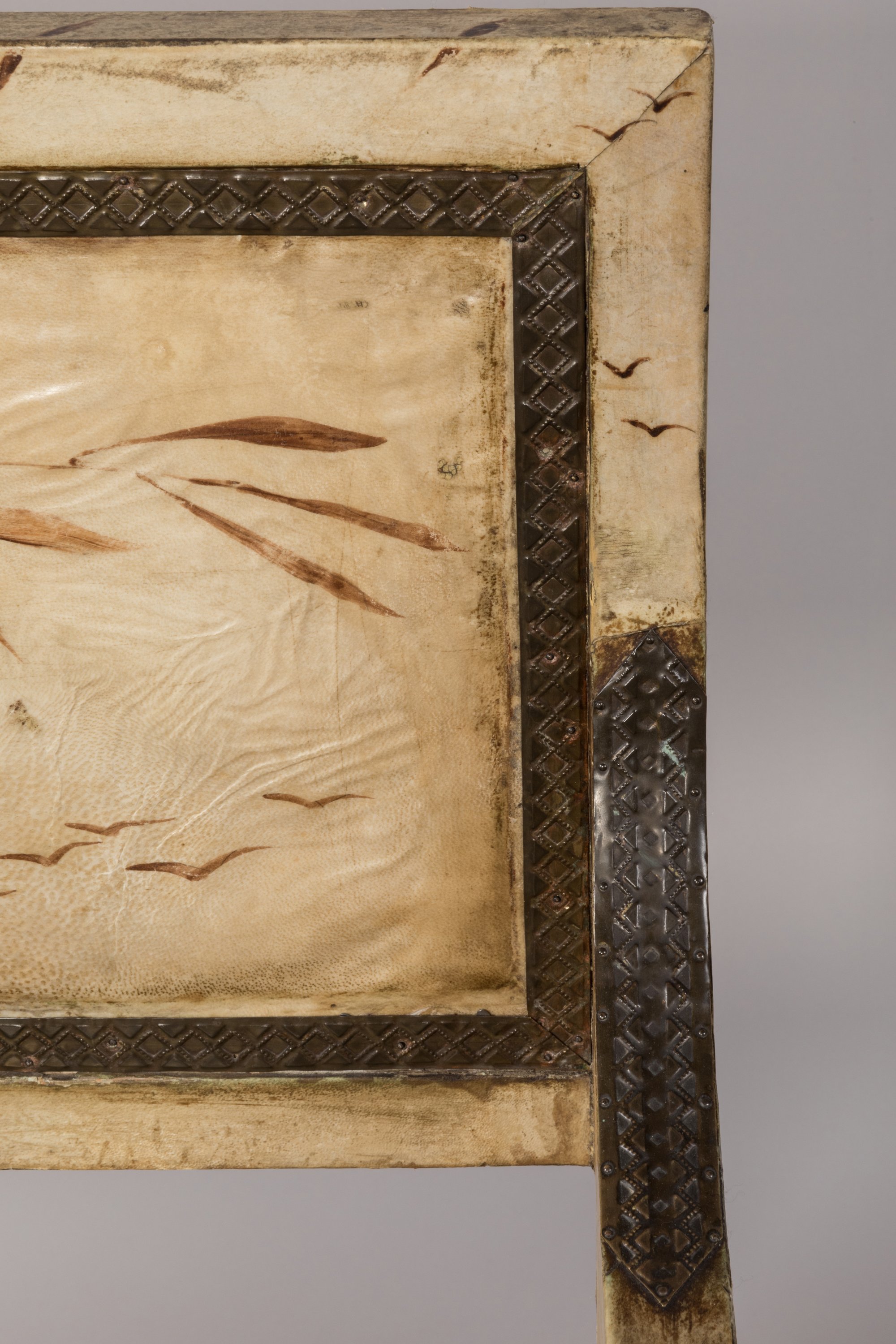 garnis de parchemin sur le dossier et l'assise, à décor de feuilles et d'oiseaux stylisés. Le dossier droit est évidé en partie basse et les accotoirs sont pleins, à la façon d'une bergère. Les joues reçoivent un disque en laiton repoussé et ajouré, ceint d'un décor discoïdal géométrique marqueté de laiton, étain, bois clair et bois sombre qui se poursuit sur la ceinture. Le piètement tubulaire est orné d'un ruban de laiton estampé ; les pieds sont cubiques. L'entretoise latérale galbée est recouverte de parchemin ; sur sa face supérieure, une feuille de laiton estampée de dents de loup rappelle le décor de la partie supérieure des accotoirs.