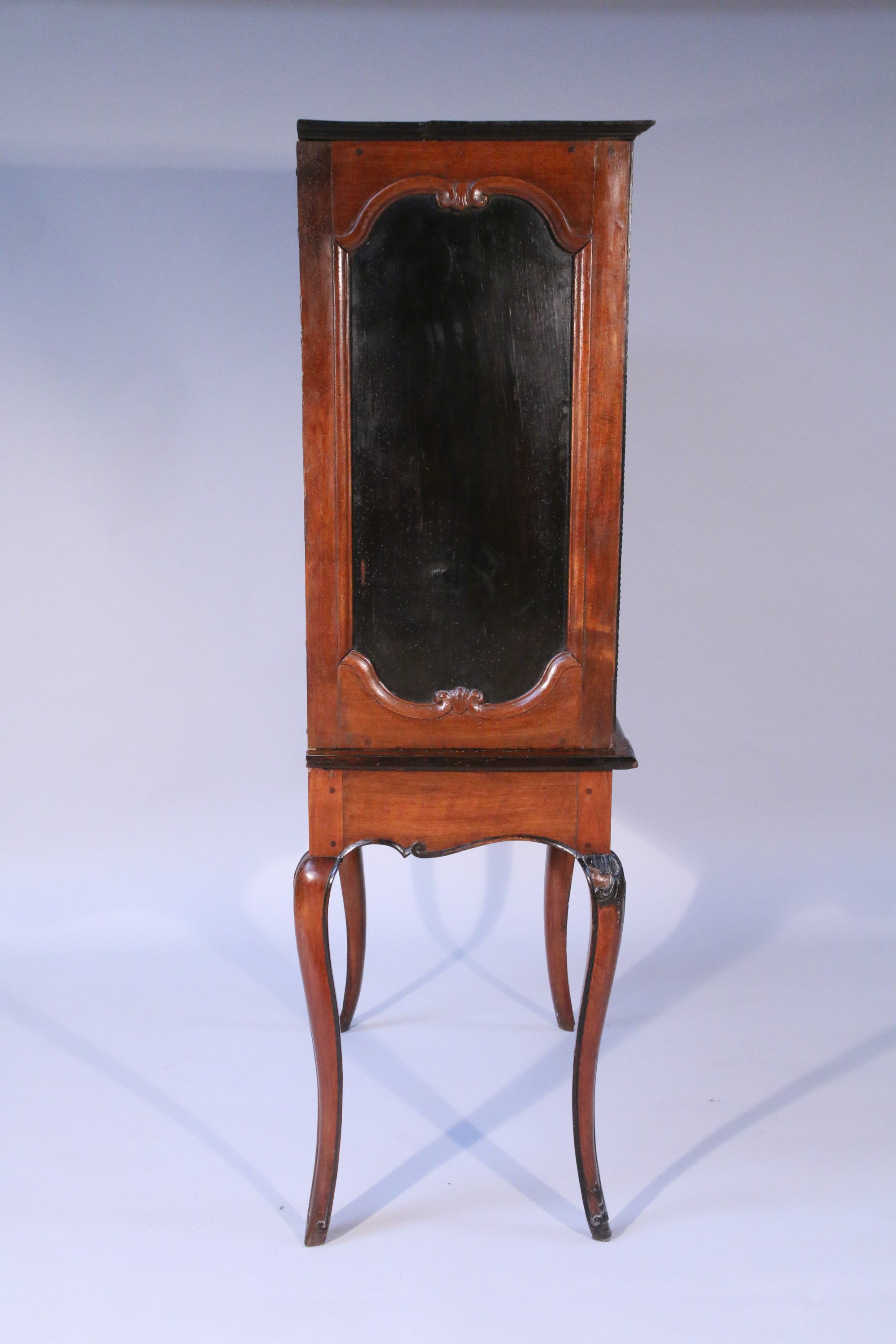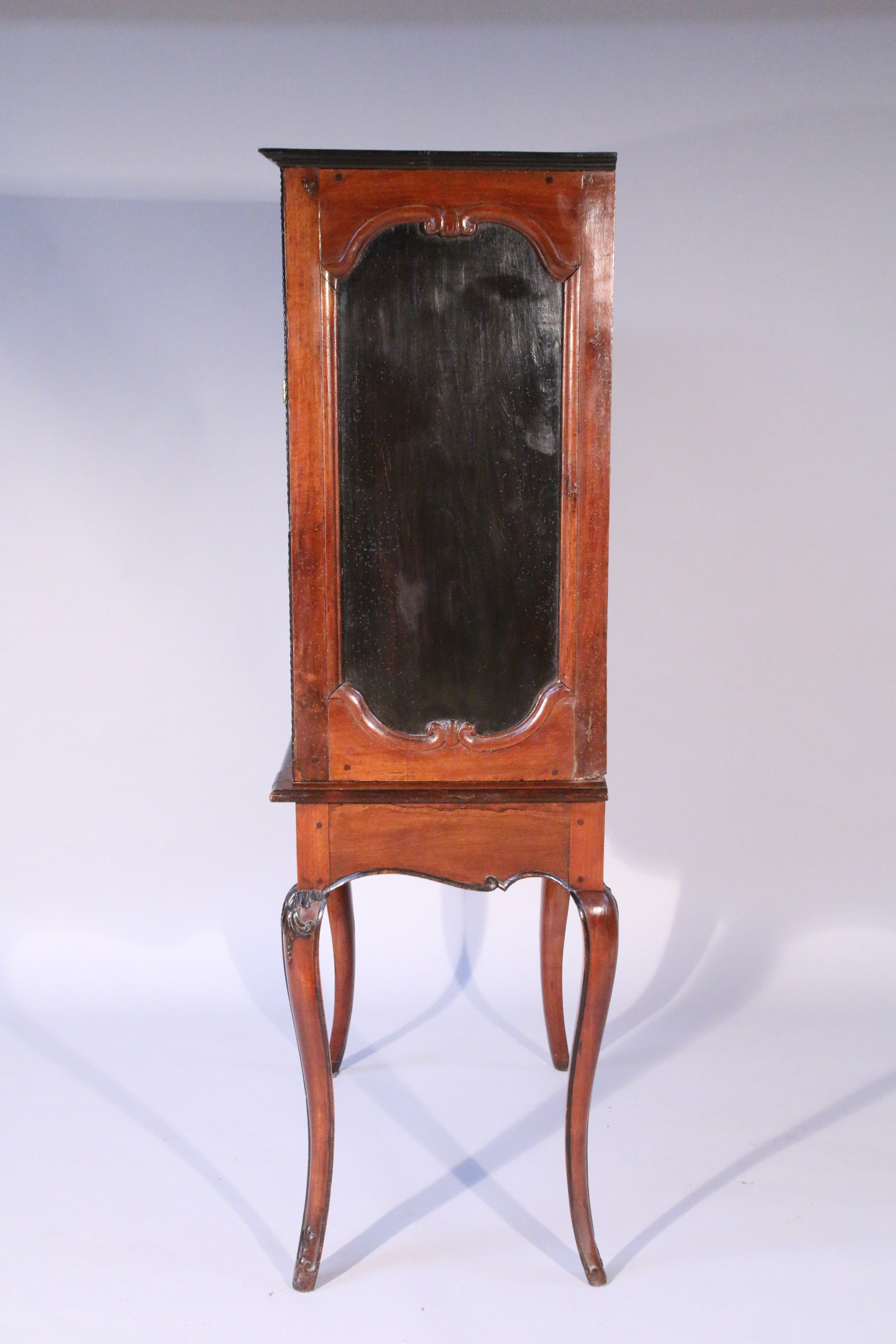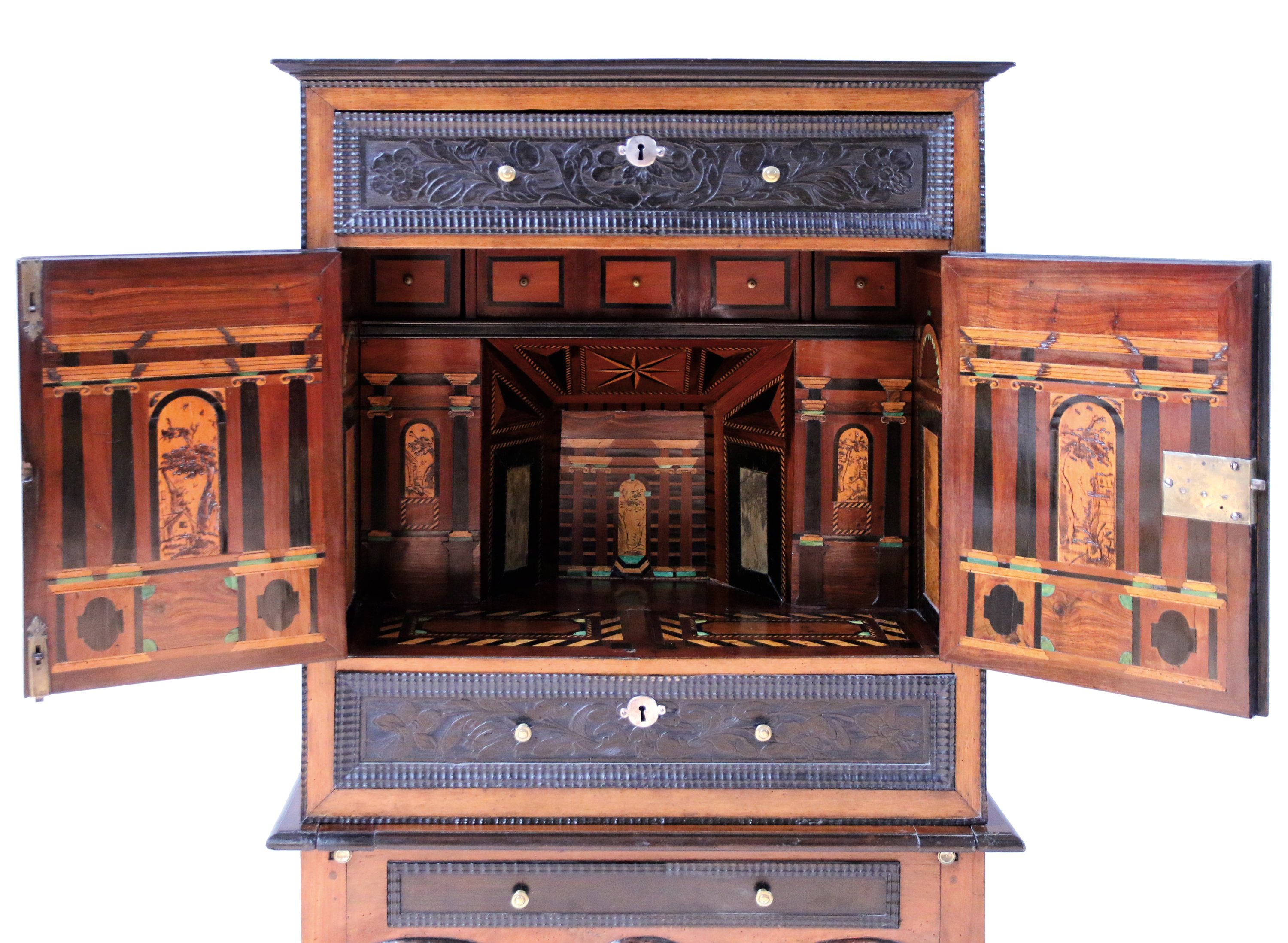 La partie supérieure en bois fruitier teinté et bois noirci, ouvrant par deux portes et deux tiroirs plaqués d'éléments en ébène provenant d'un cabinet du XVIIe. Les plaques, gravées de motifs végétaux, présentent dans deux médaillons des personnages à l'antique ceints de couronnes de laurier. Les portes dévoilent un riche théâtre en retrait. L'intérieur est marqueté de bois naturel et bois teinté, aux motifs d'architectures, de pavement en damier feignant une perspective et des paysages naturalistes. Le sommet du théâtre ouvre par trois tiroirs, tandis que les parties latérales mobiles dissimulent quatre tiroirs de chaque côté. Sur un piétement ouvrant par un tiroir et un plateau coulissant en ceinture reposant sur quatre pieds galbés.