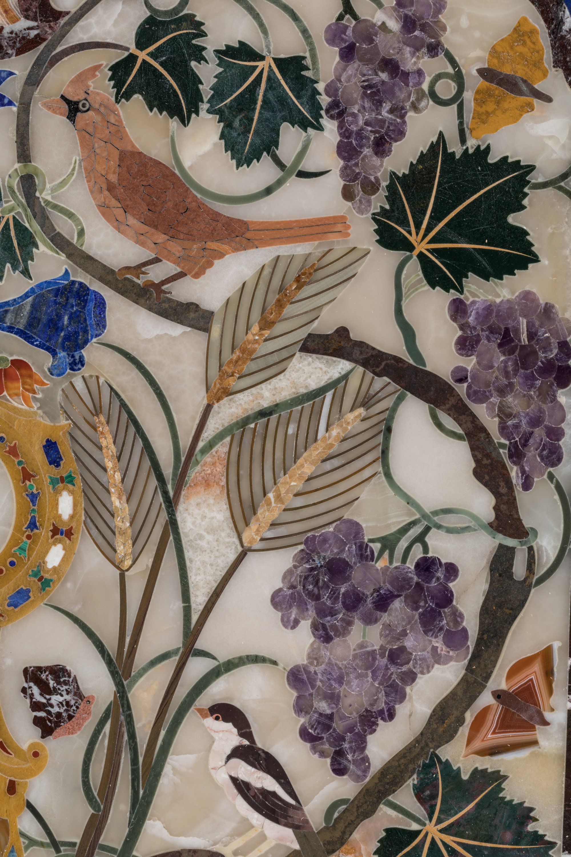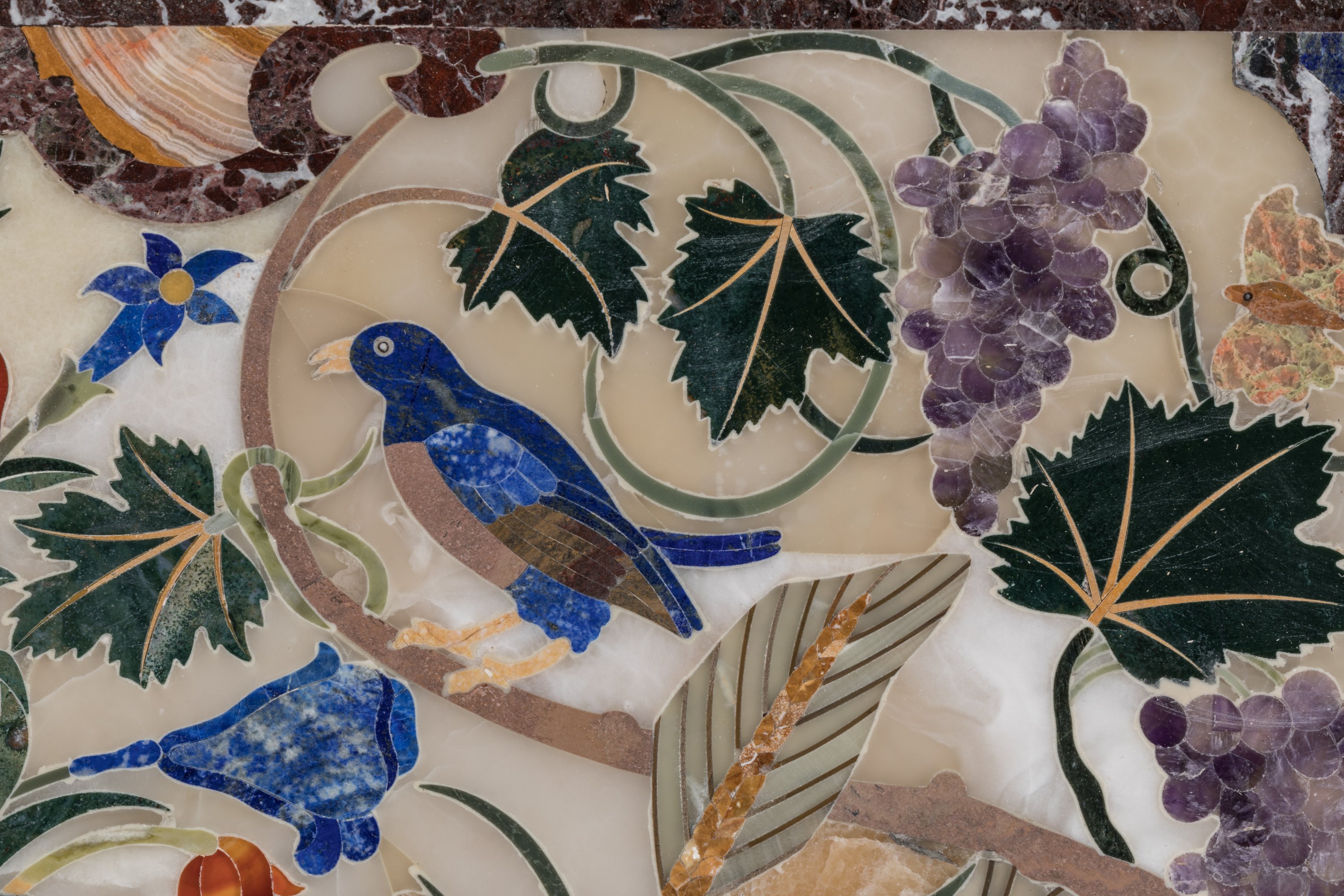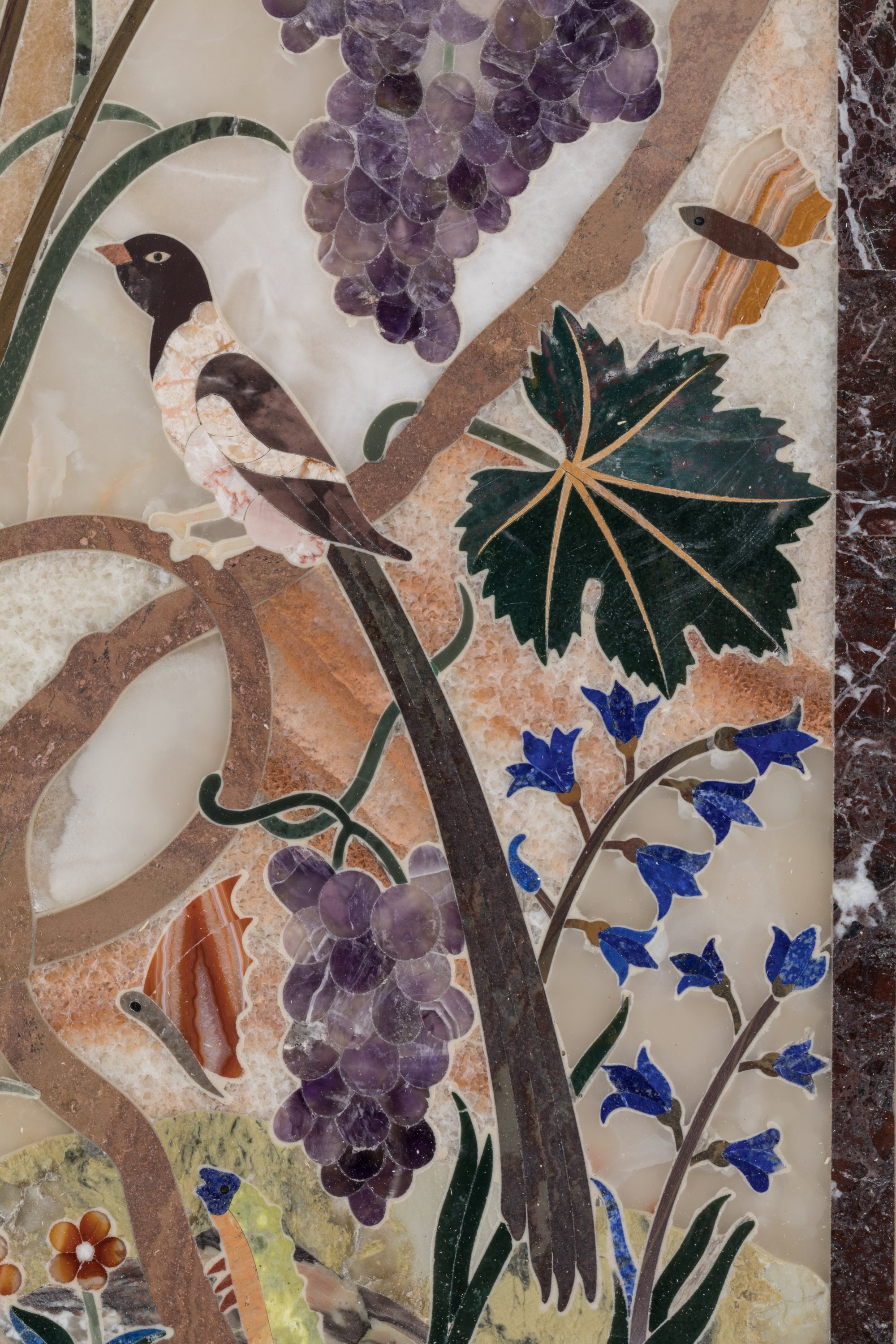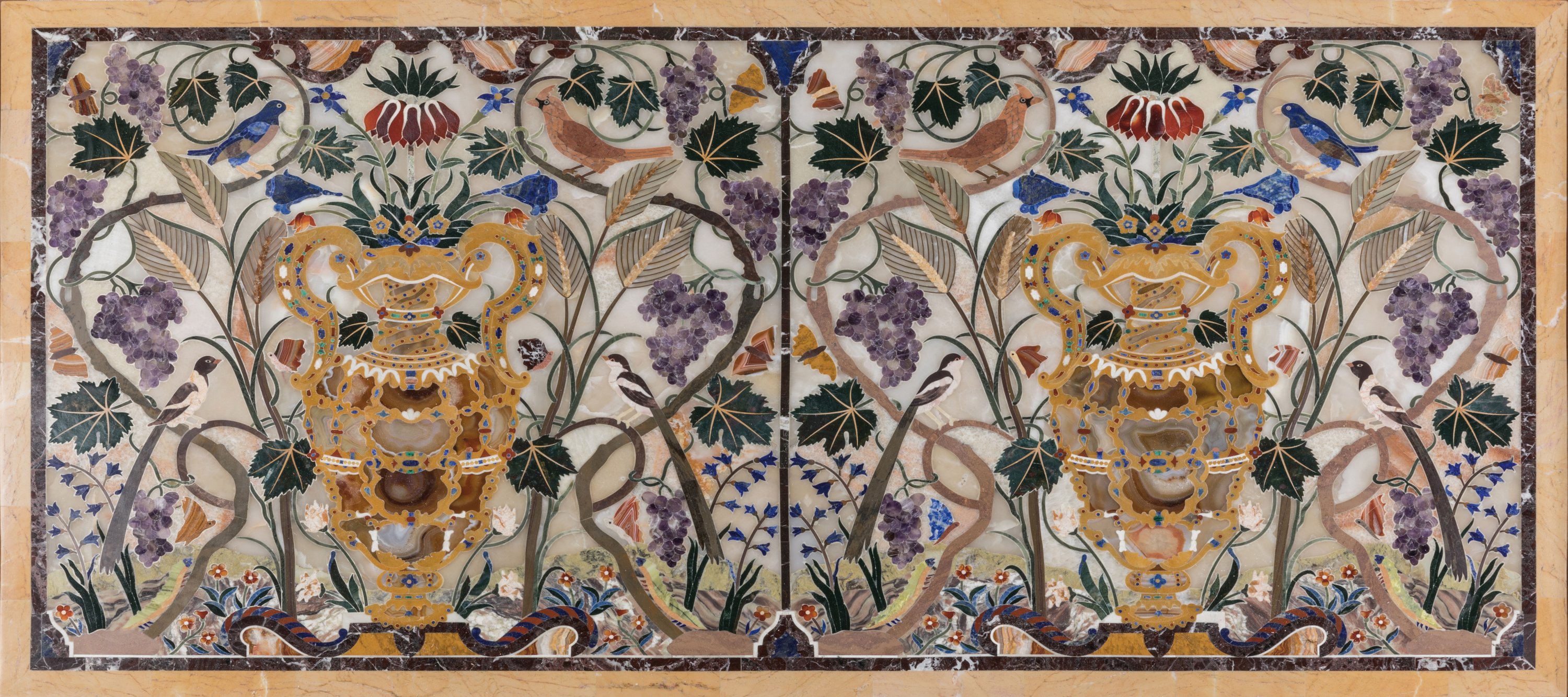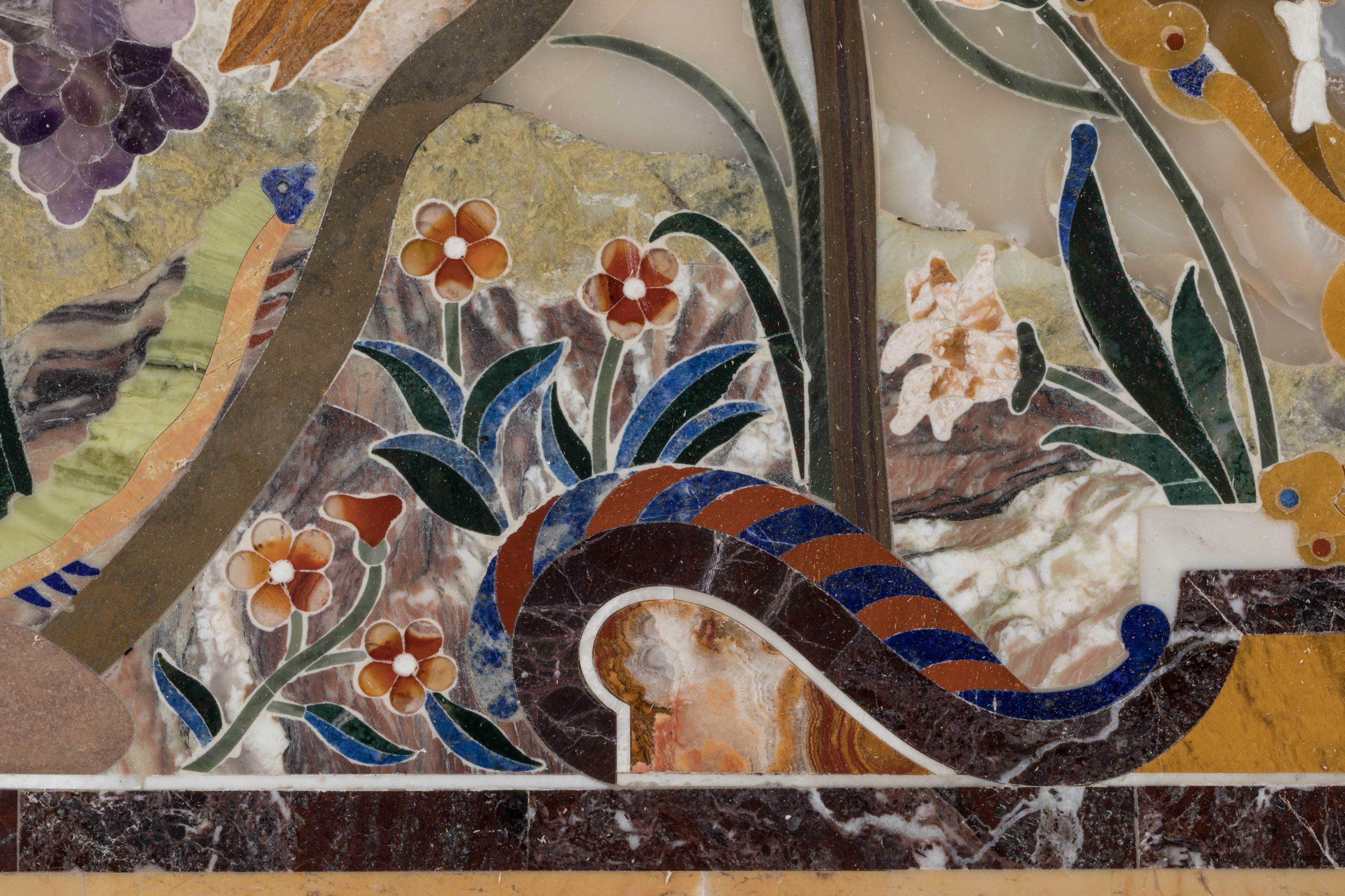 en marqueterie de pierres dures: lapis-lazuli, améthyste, agate, malachite, onyx, jaspe, calcédoine, jadéite, fluorite. De forme rectangulaire, le décor, en deux parties, est composé de deux vases dans un entourage de fleurs, oiseaux, ceps de vigne et épis de blé.