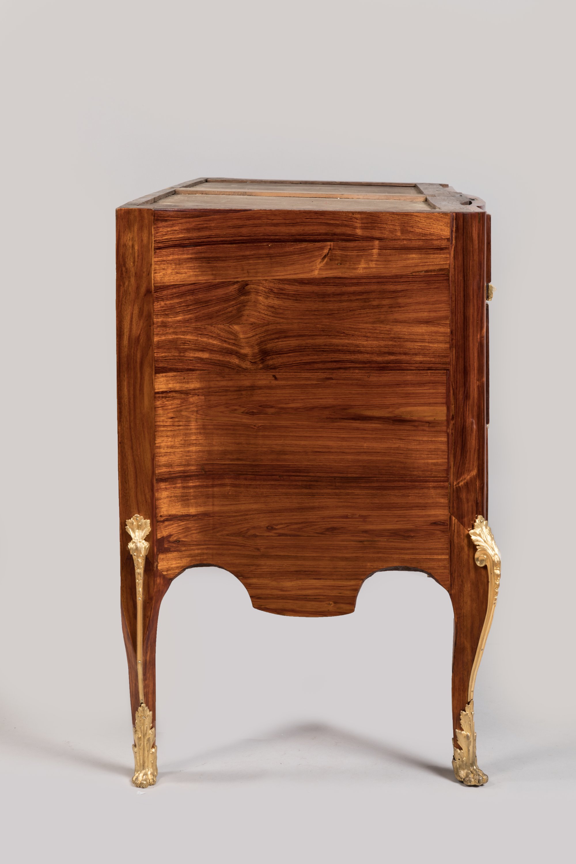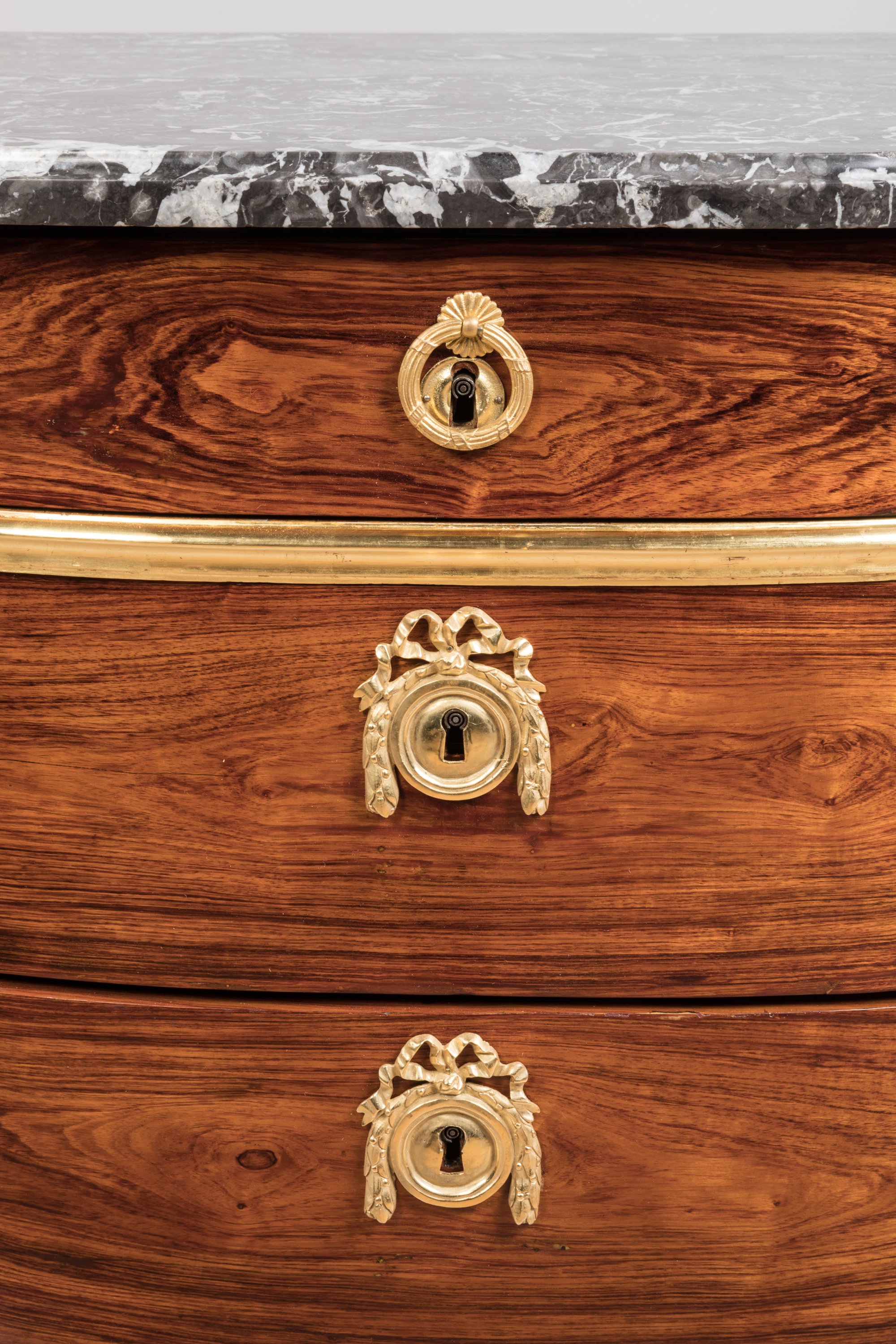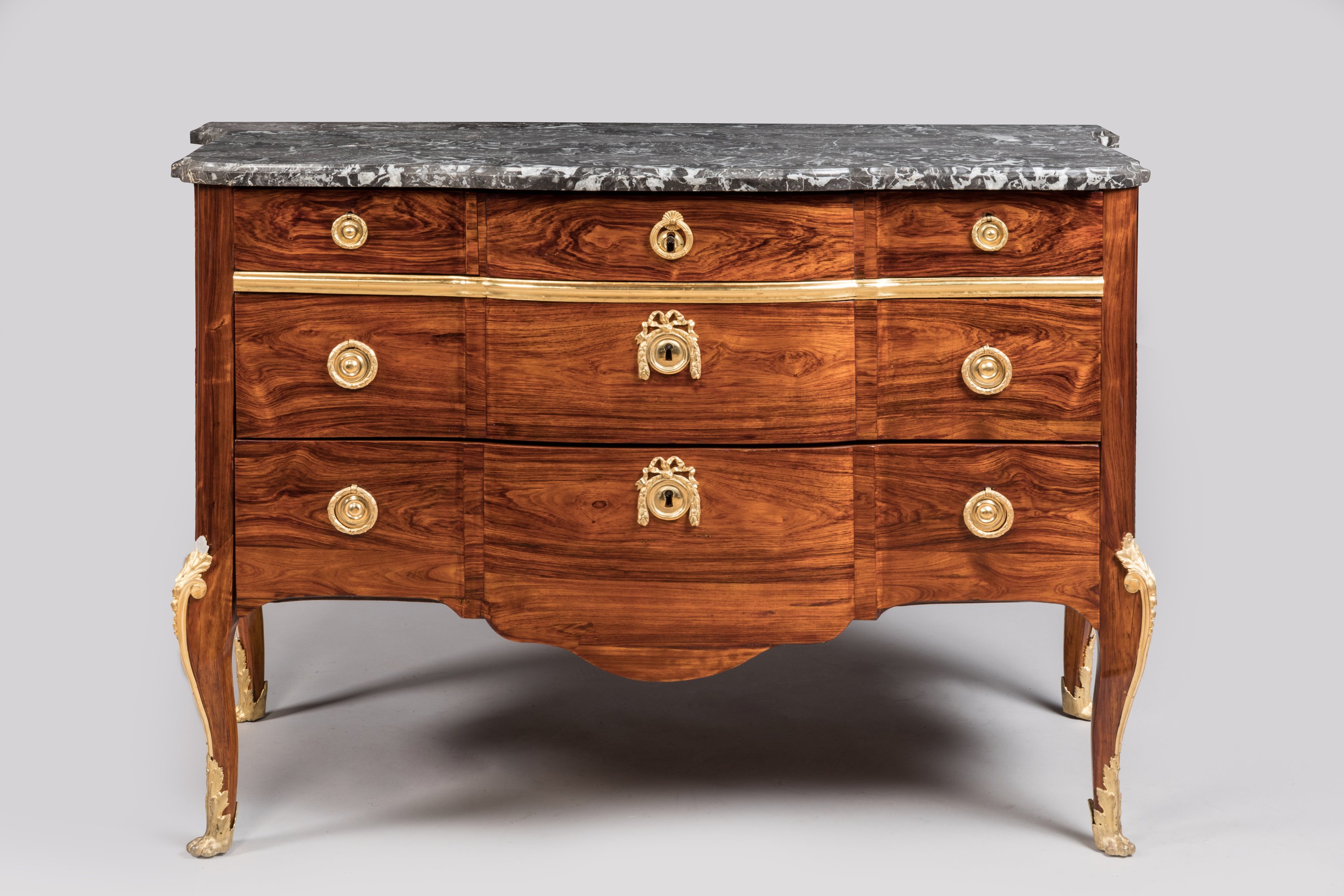 Anneaux de tirage, entrées de serrure à médaillon rubané, chutes à feuilles d'acanthe et sabots en pattes de lion en bronze doré. Dessus de marbre gris Sainte-Anne.