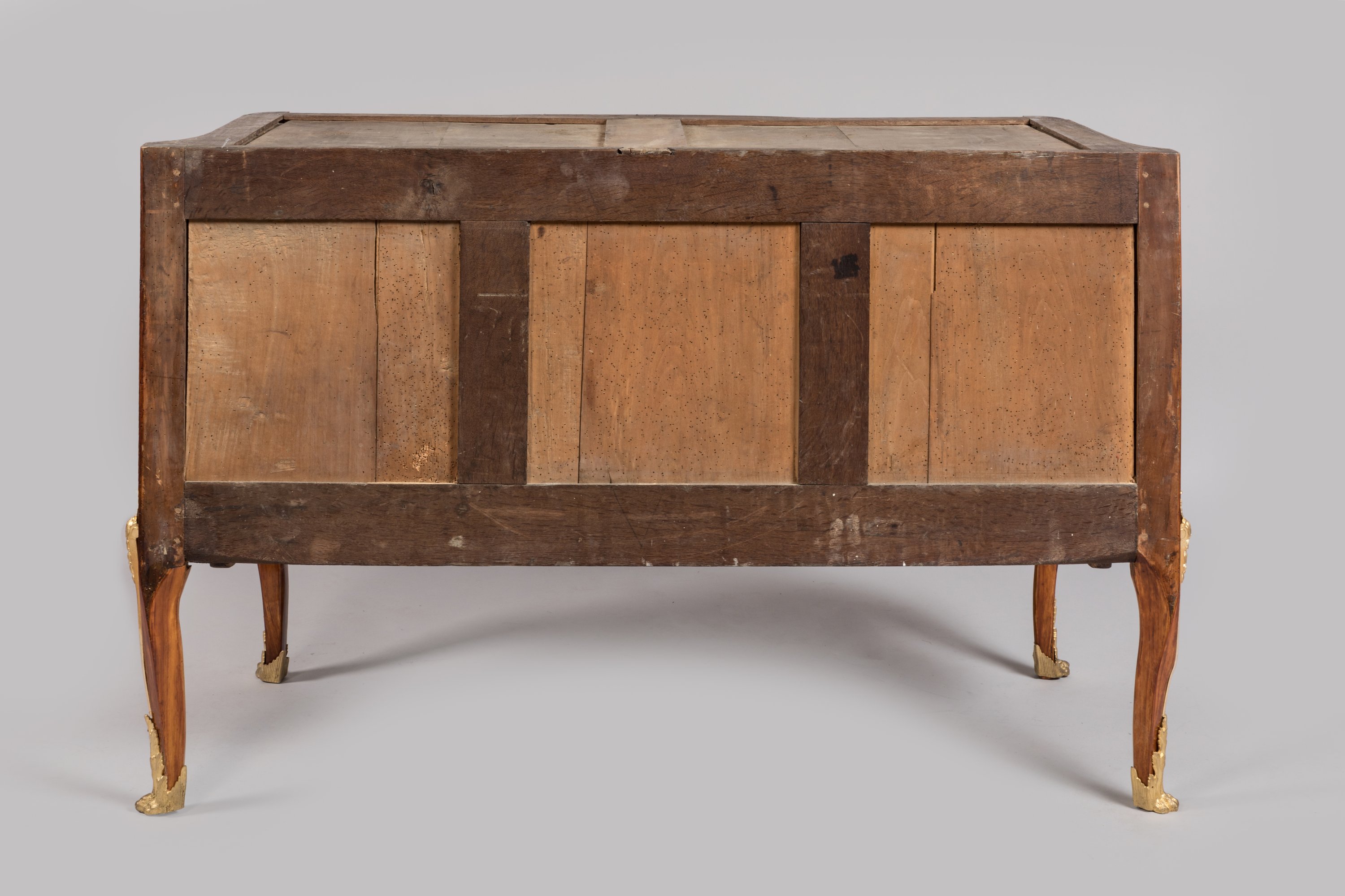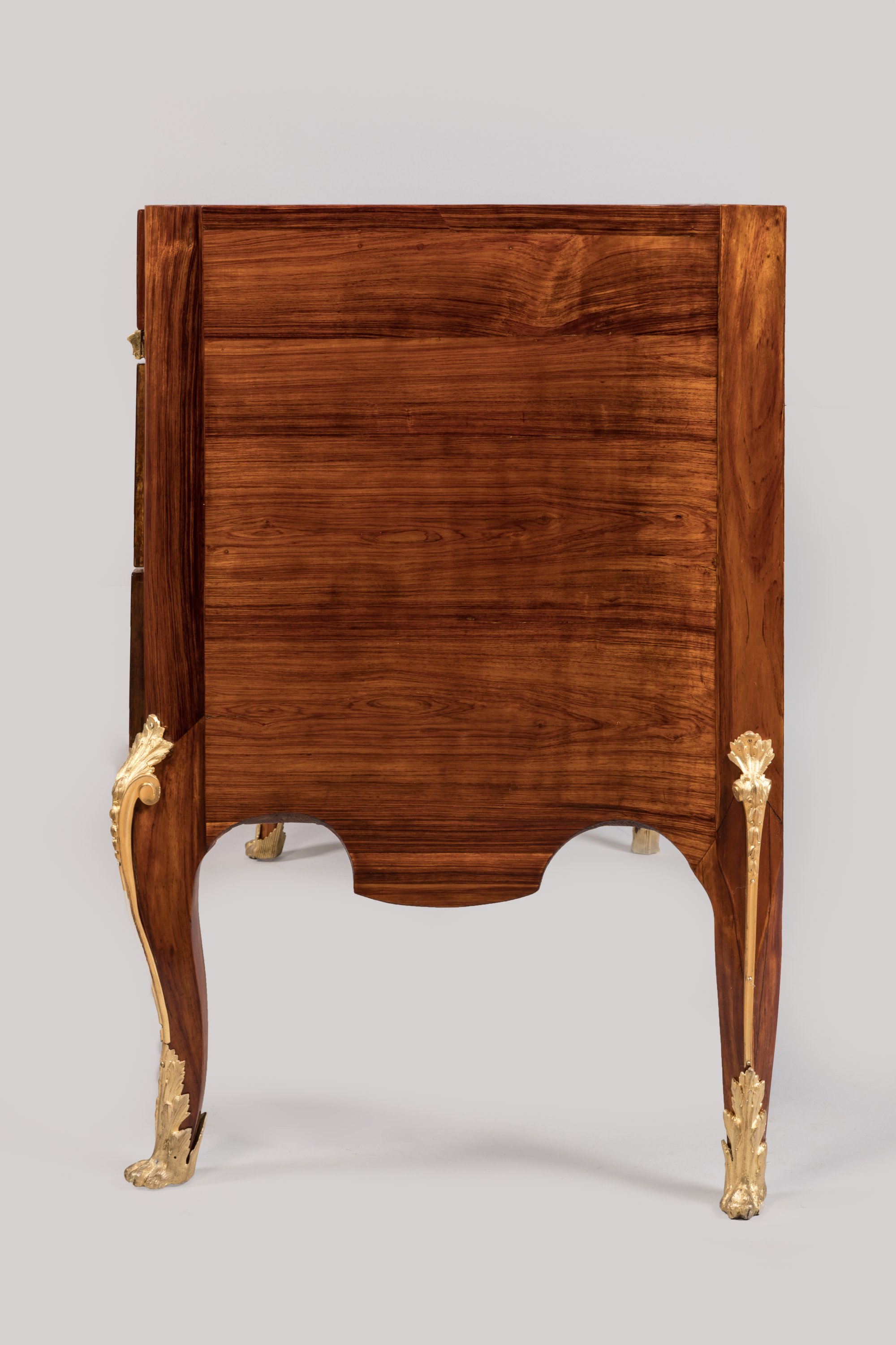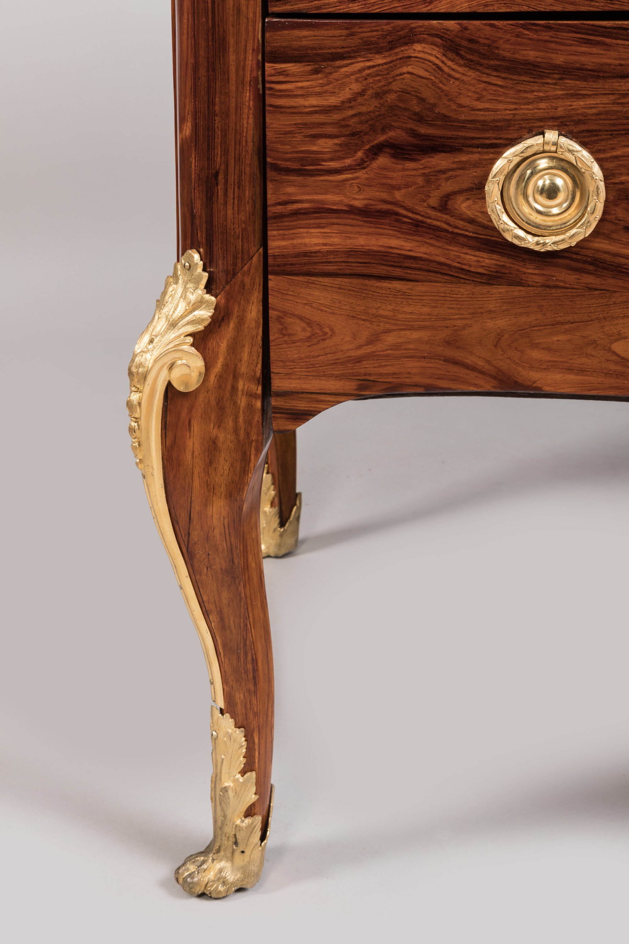 Anneaux de tirage, entrées de serrure à médaillon rubané, chutes à feuilles d'acanthe et sabots en pattes de lion en bronze doré. Dessus de marbre gris Sainte-Anne.
