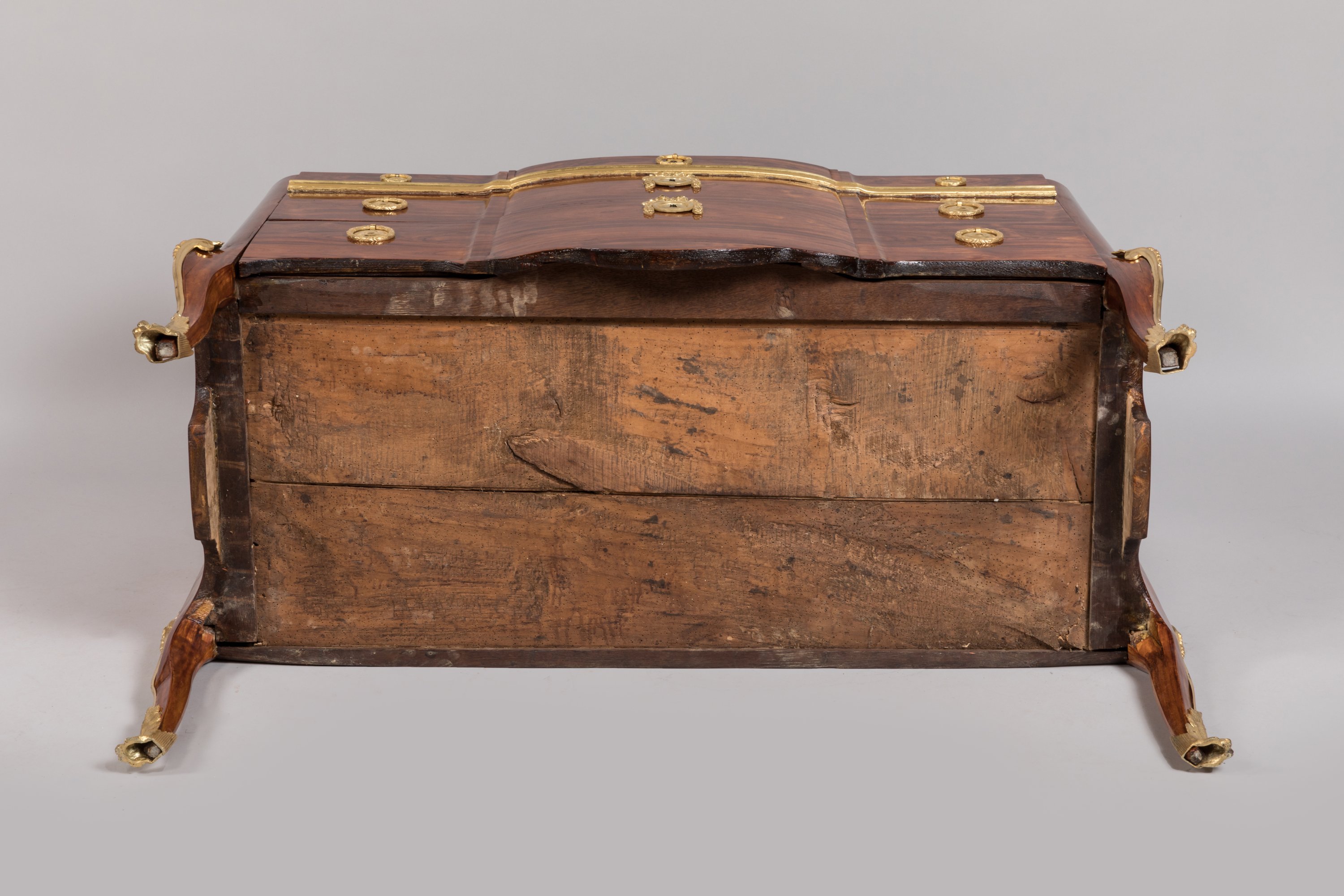 de forme rectangulaire en placage de satiné. La façade, à double ressaut, ouvre par cinq tiroirs sur trois rangs dont trois en ceinture et deux sans traverse, formant tableaux. La traverse apparente est en bois redoré. Les côtés sont évasés à tableaux aux traverses basses découpées d'un tablier. Elle repose sur quatre pieds cambrés.