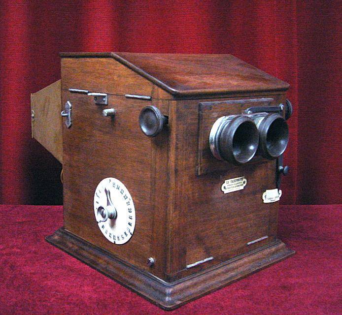 J. RICHARD. Taxiphote simplifié, 45 x 107 mm, en noyer ciré, avec éclairage électrique. Joint un panier avec vues.