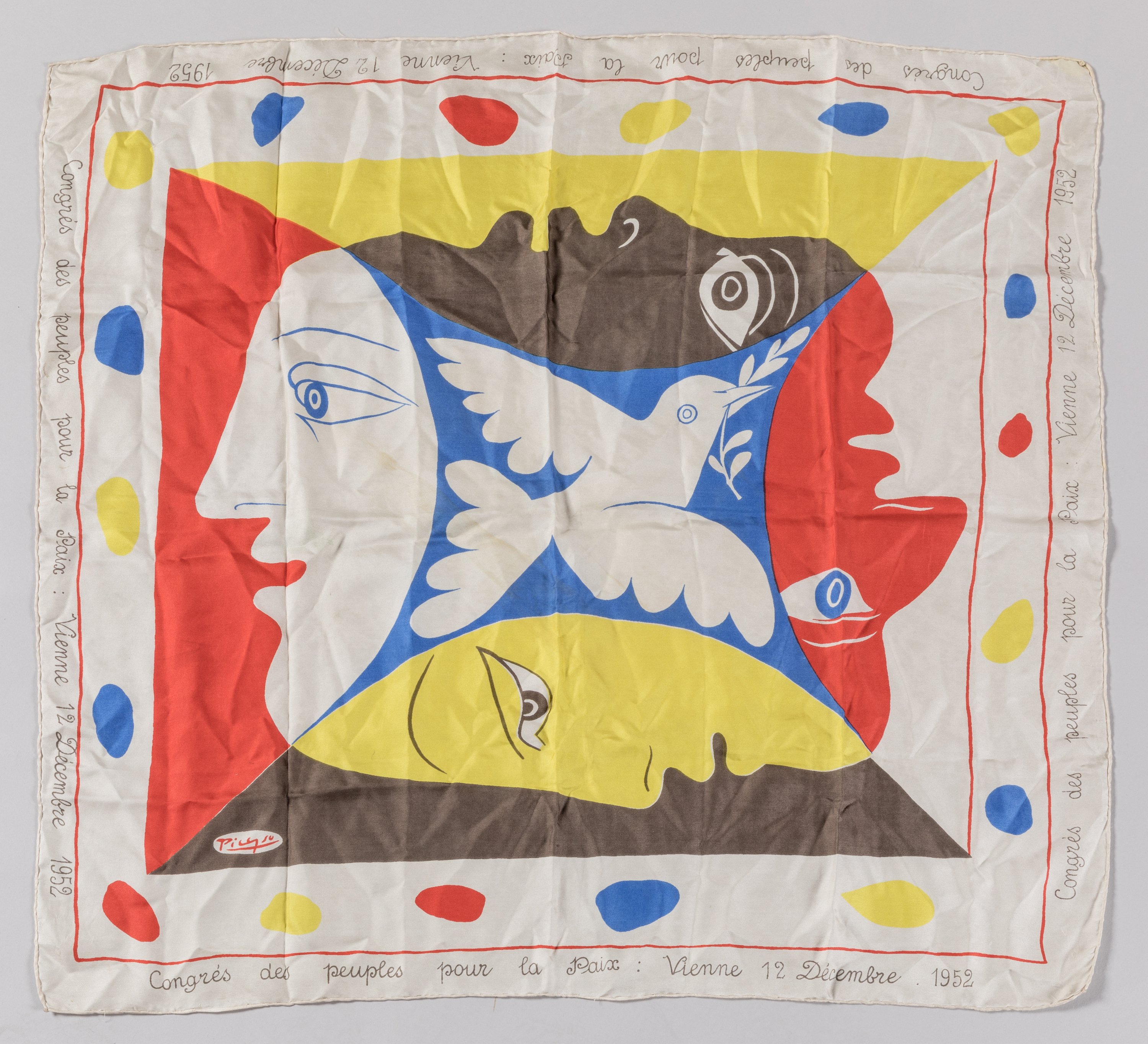 Réalisé à l'occasion du Festival mondial de la jeunesse et des étudiants pour la Paix à Vienne en 1952 ce foulard est représenté en couverture du livre "Picasso, 145 dessins pour la presse et des organisations démocratiques" aux éditions l’Humanité, 1973.
