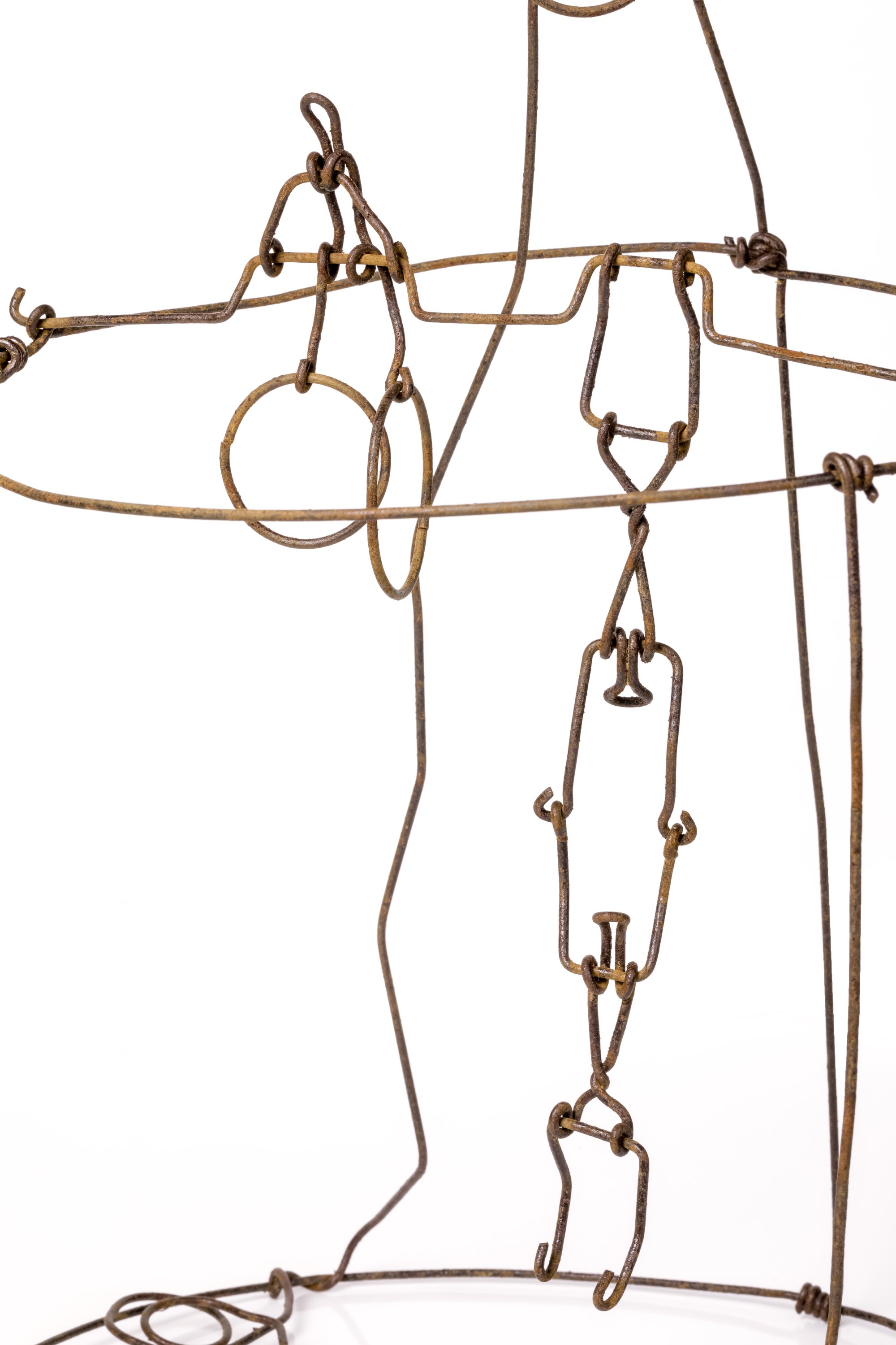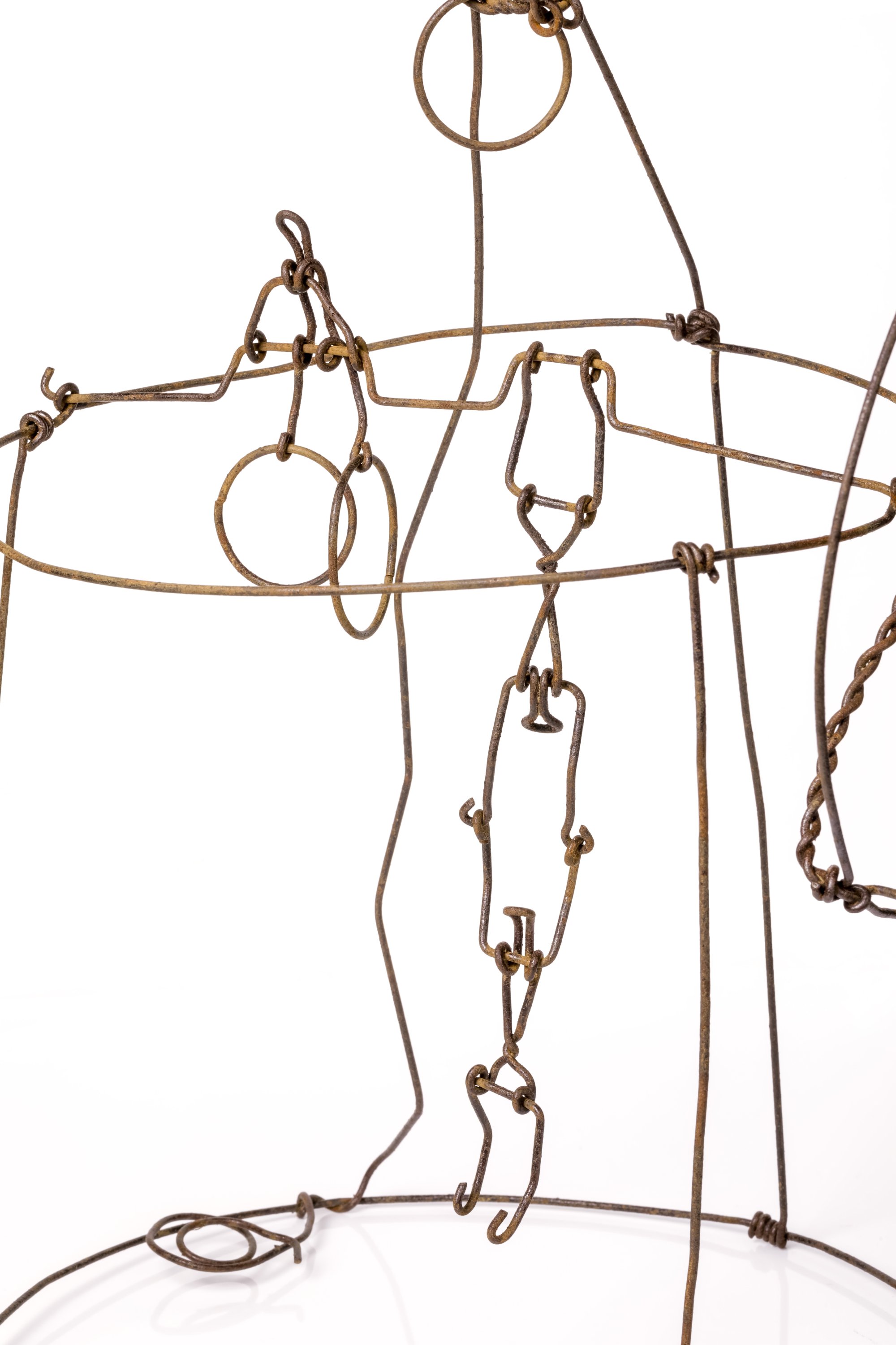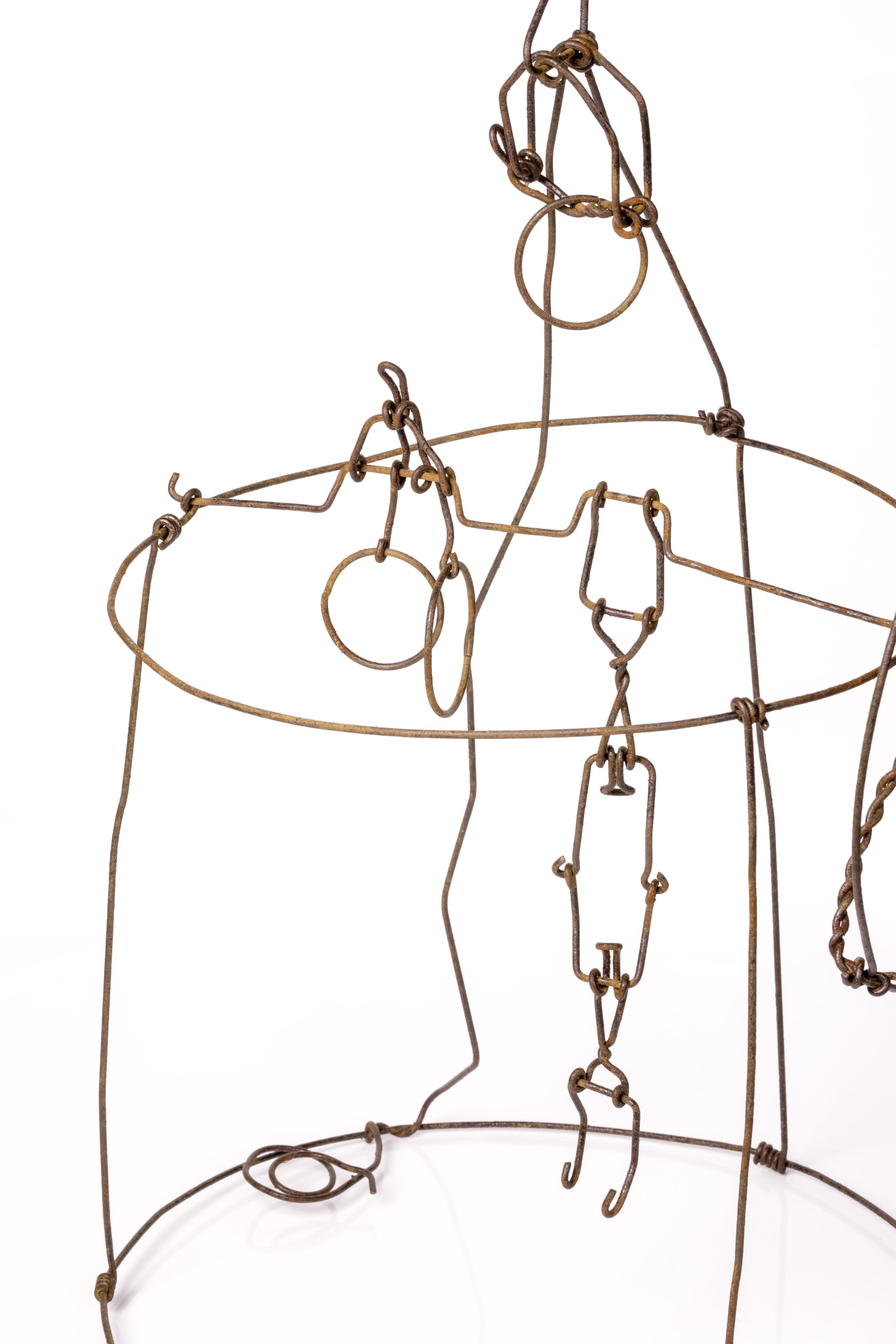 Cette sculpture en fil de fer est composée dacrobates reliés à un système de rotation. Les acrobates sagitent et voltigent grâce à la manivelle sculptée sur le côté.
