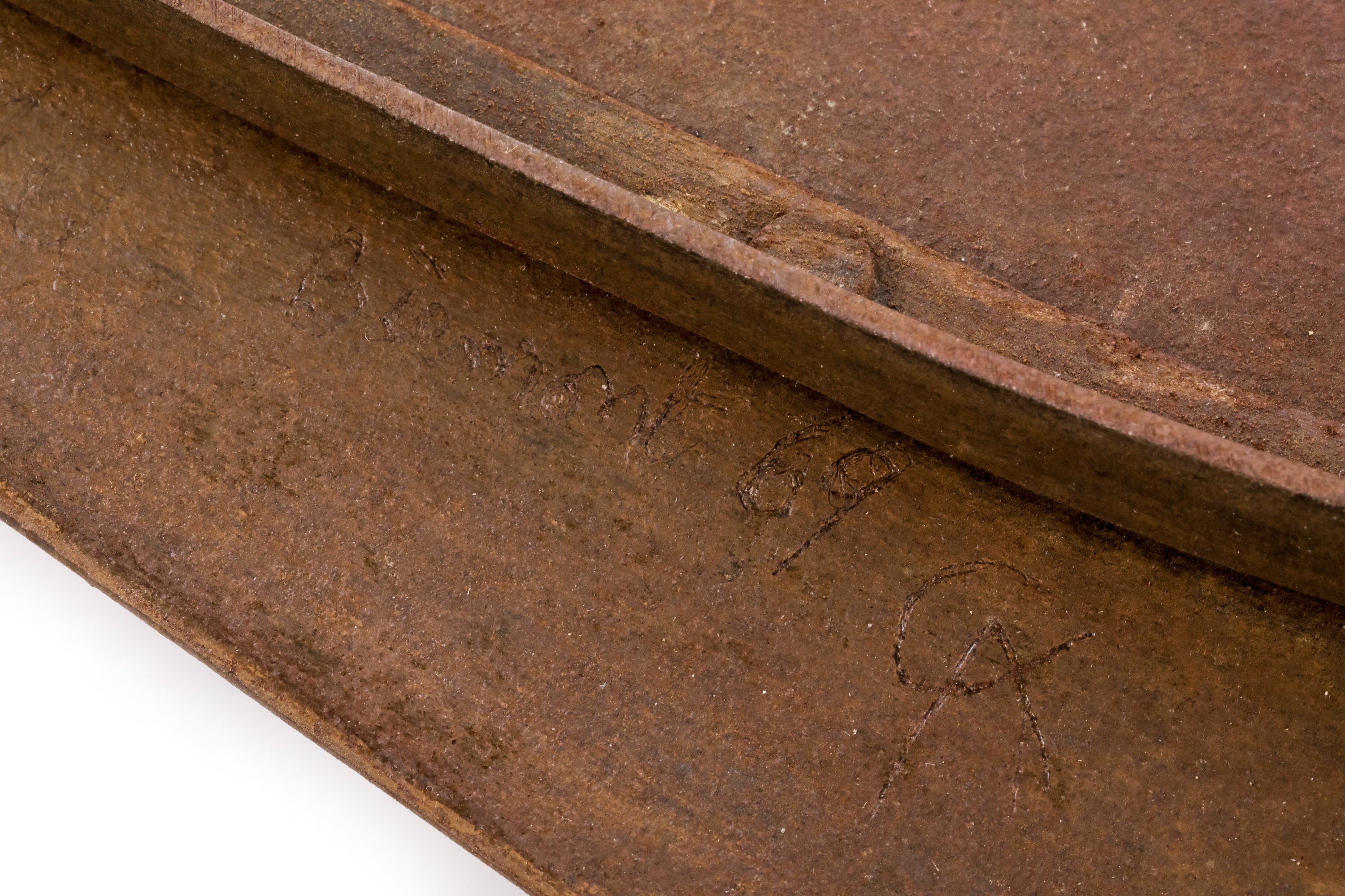 Le sujet et le traitement confirment la datation de 1969 retrouvée avec la signature. La simplicité dans le traitement de la queue indique qu'il s'agirait d'une des premières ébauches de Fáfnir. Le carnet "Calder" des usines Biémont liste en 74e position un premier mobile intitulé "Dragon" sous le numéro de commande 149, qui est livré en 1969 à la galerie Perls à New York. "Dragon II", aussi appelé "5 Pales", est un stabile qui arrive en 76e position sous le numéro de commande 198 et qui s'envole cette même année pour Chicago. Notre maquette monogrammée CA ne sera jamais agrandie sous cette forme ; elle porte des indications et numéros Biémont anciens sans lien apparent avec ces deux projets.