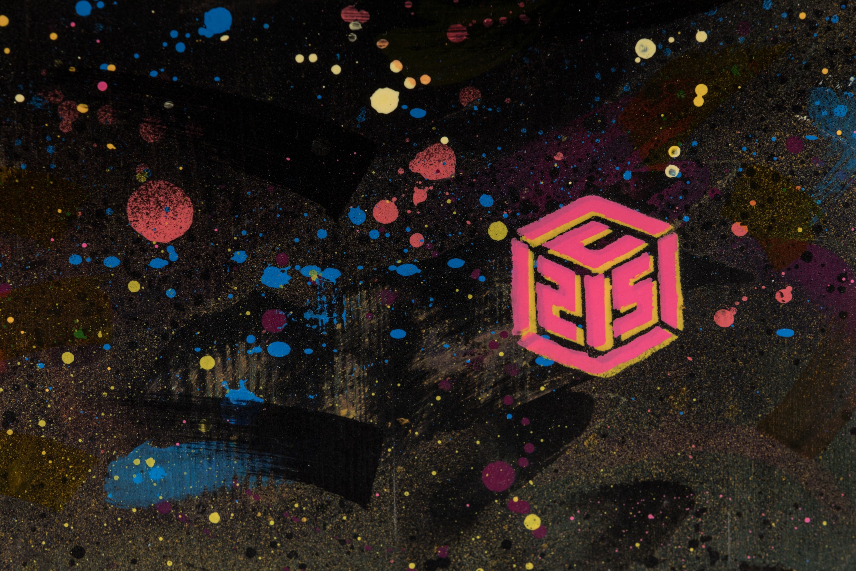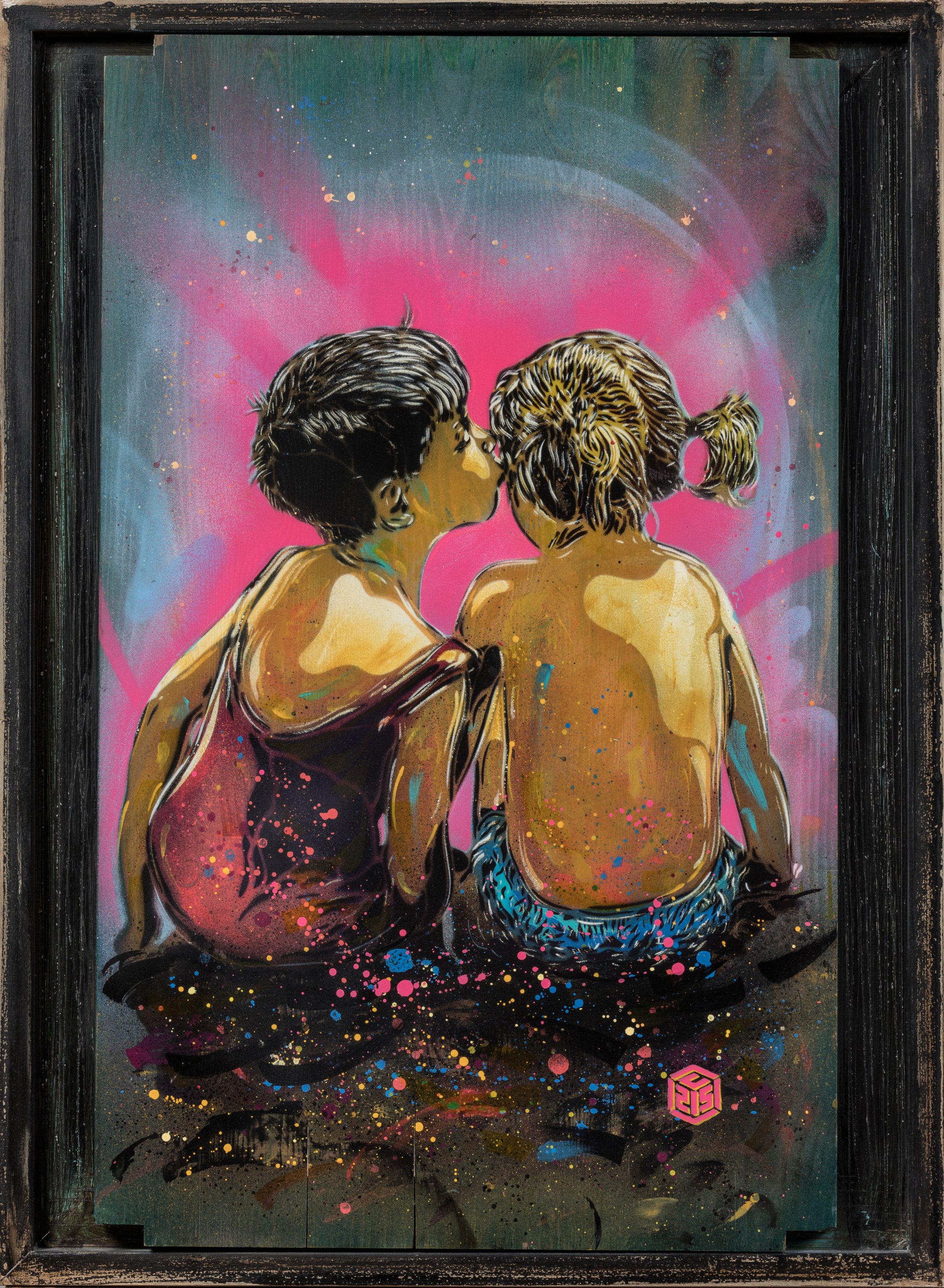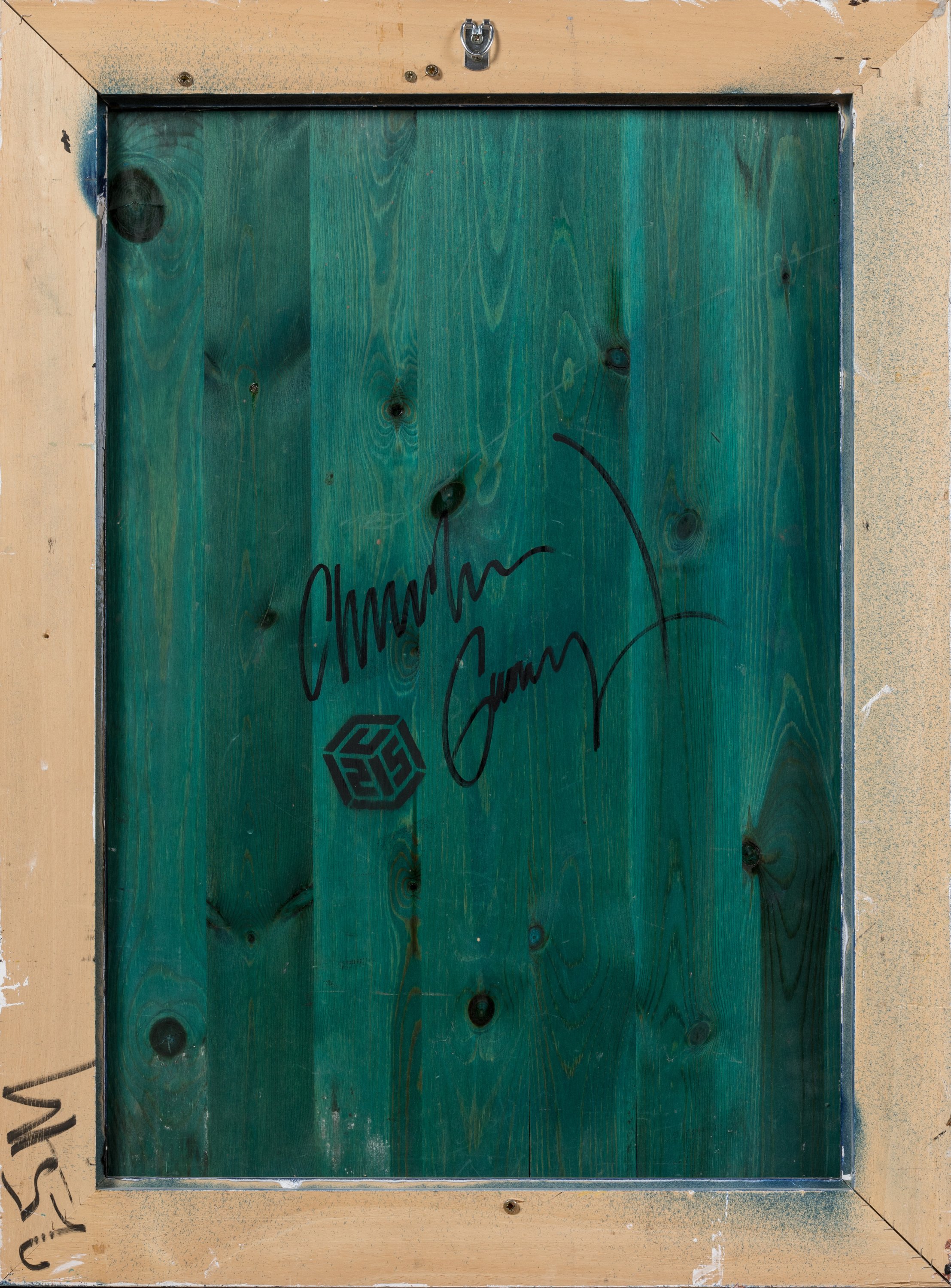 Technique mixte, pochoir et aérosol sur panneau encadré, signé en bas.