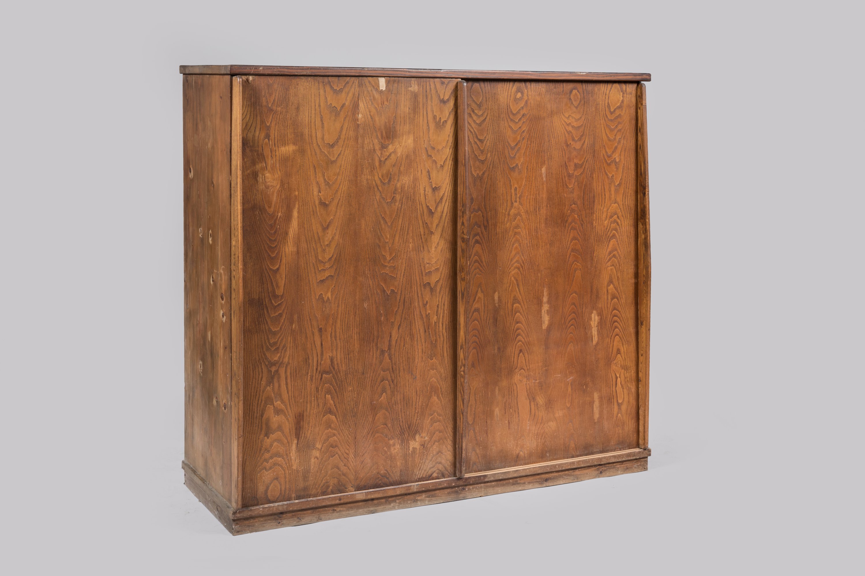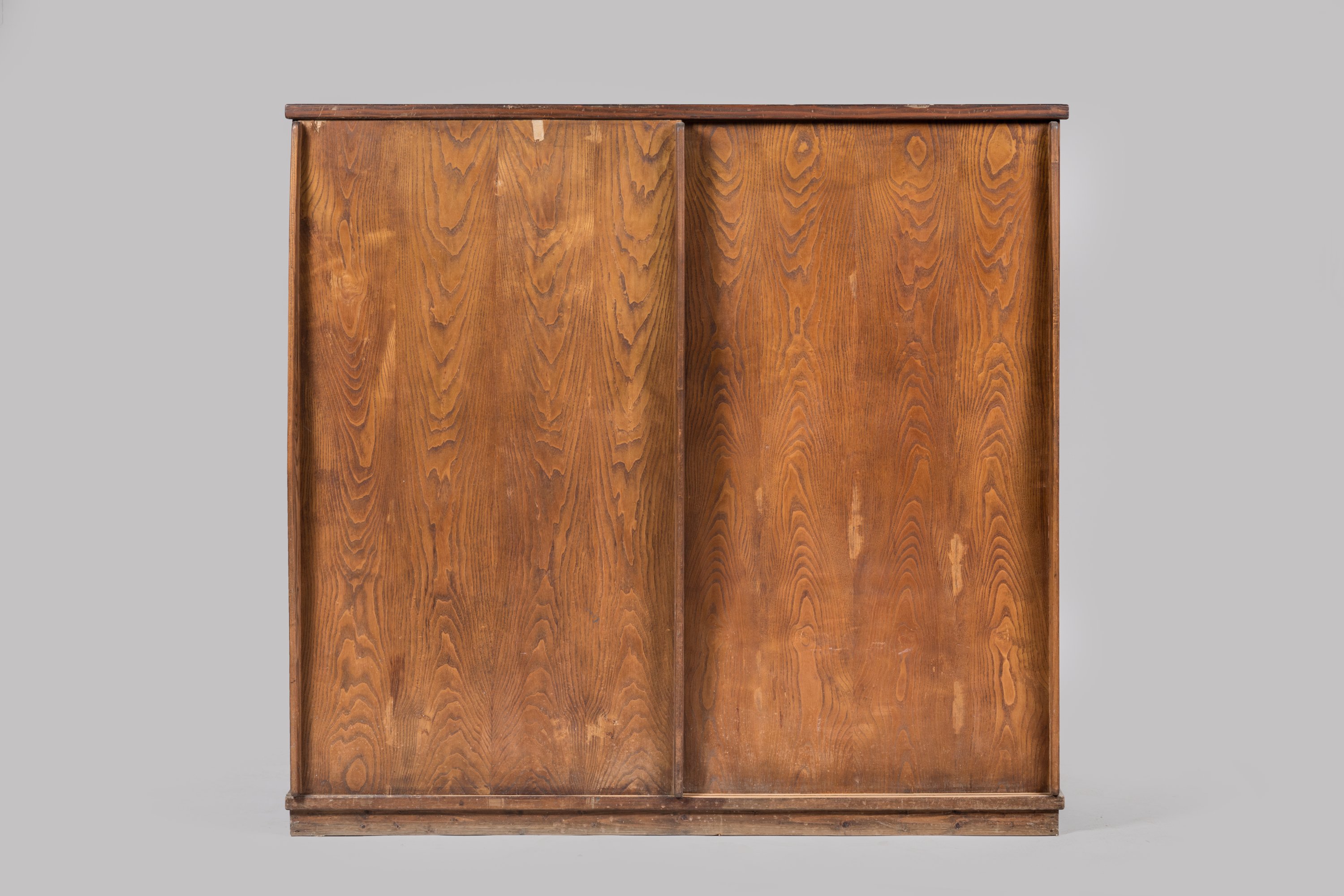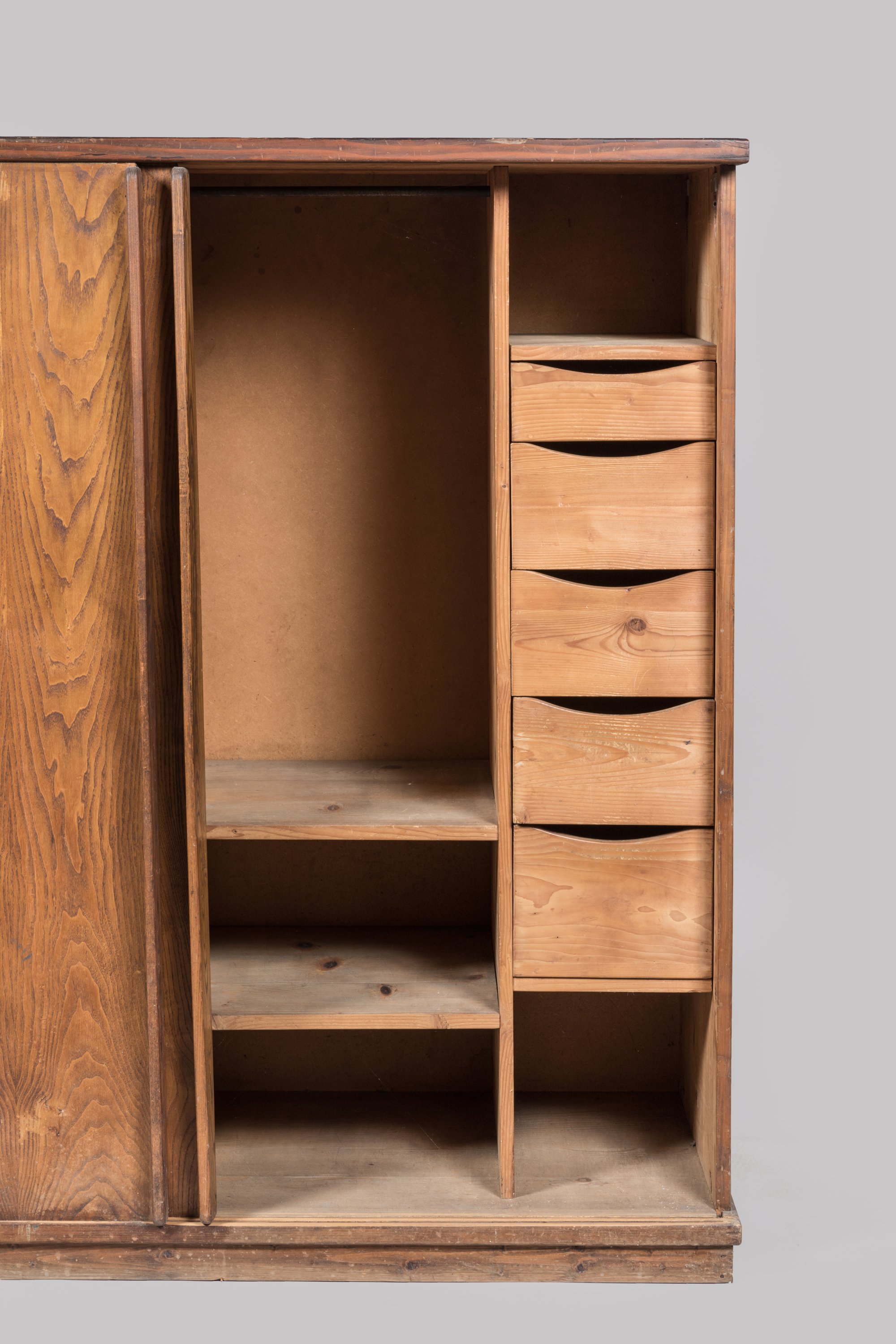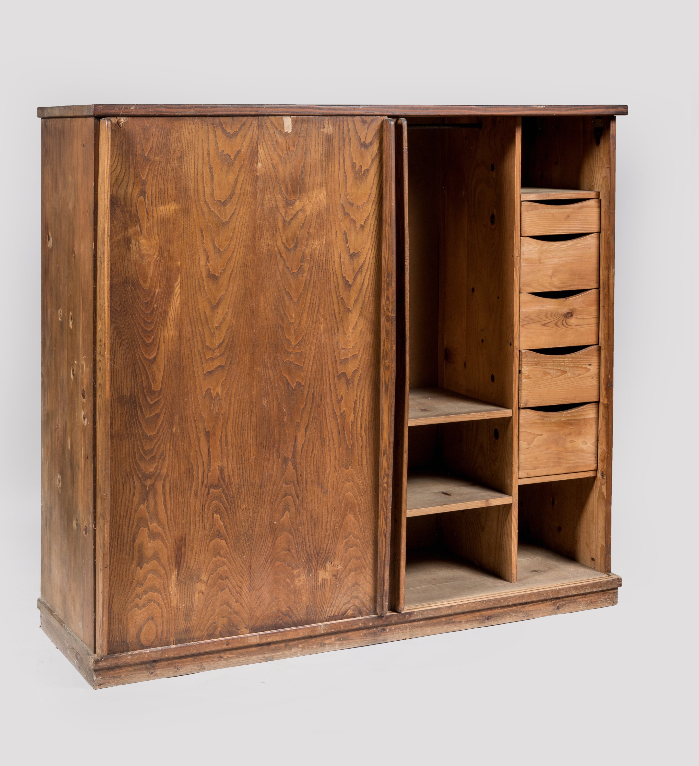 Penderie à deux portes coulissantes, en triplé, côtés extérieurs et dessus frêne, intérieur en peuplier, socle et aménagement en sapin, poignées en frêne.