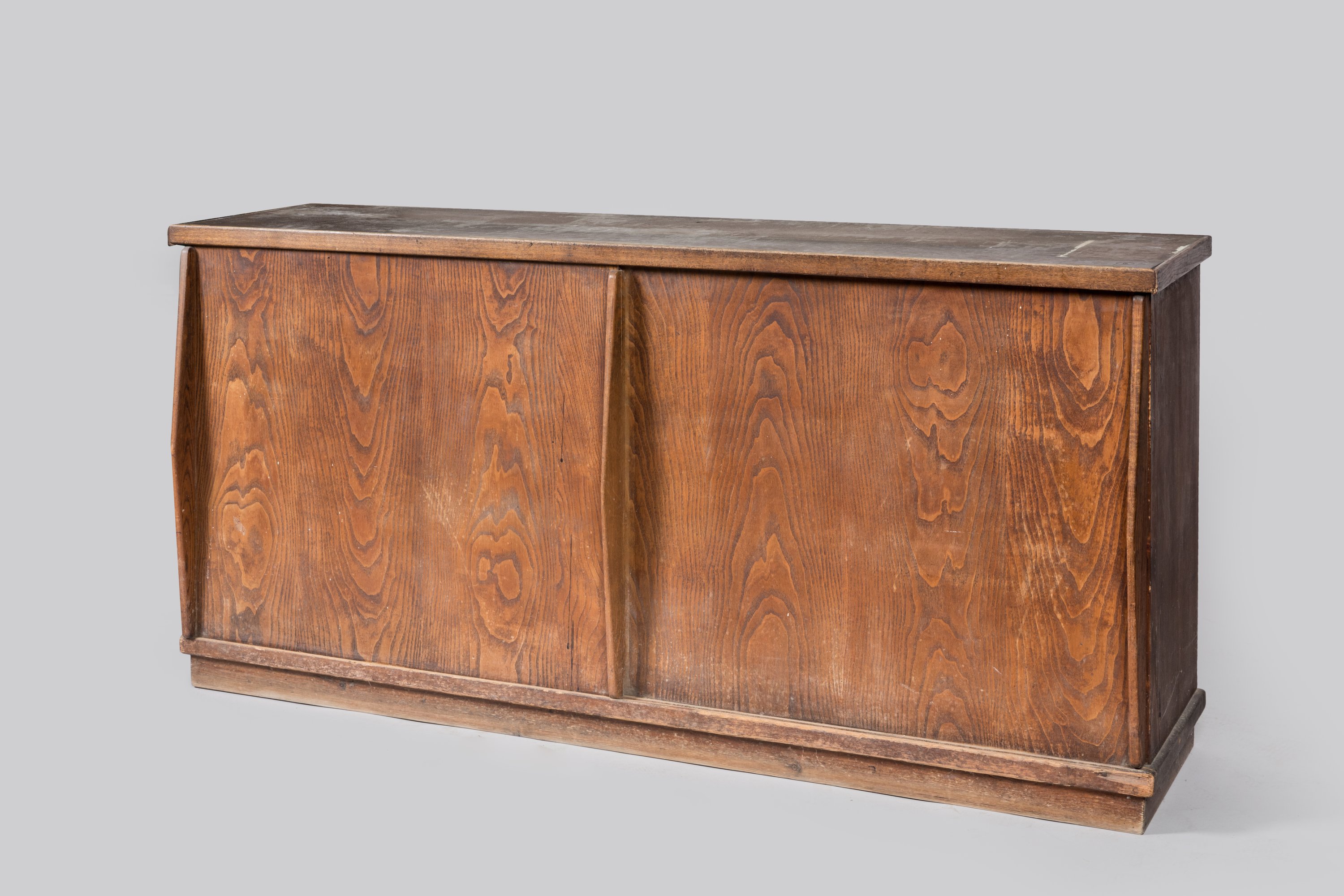 Ouvrant chacun par deux portes coulissantes dévoilant des tiroirs et des étagères. Le tout reposant sur une plinthe.