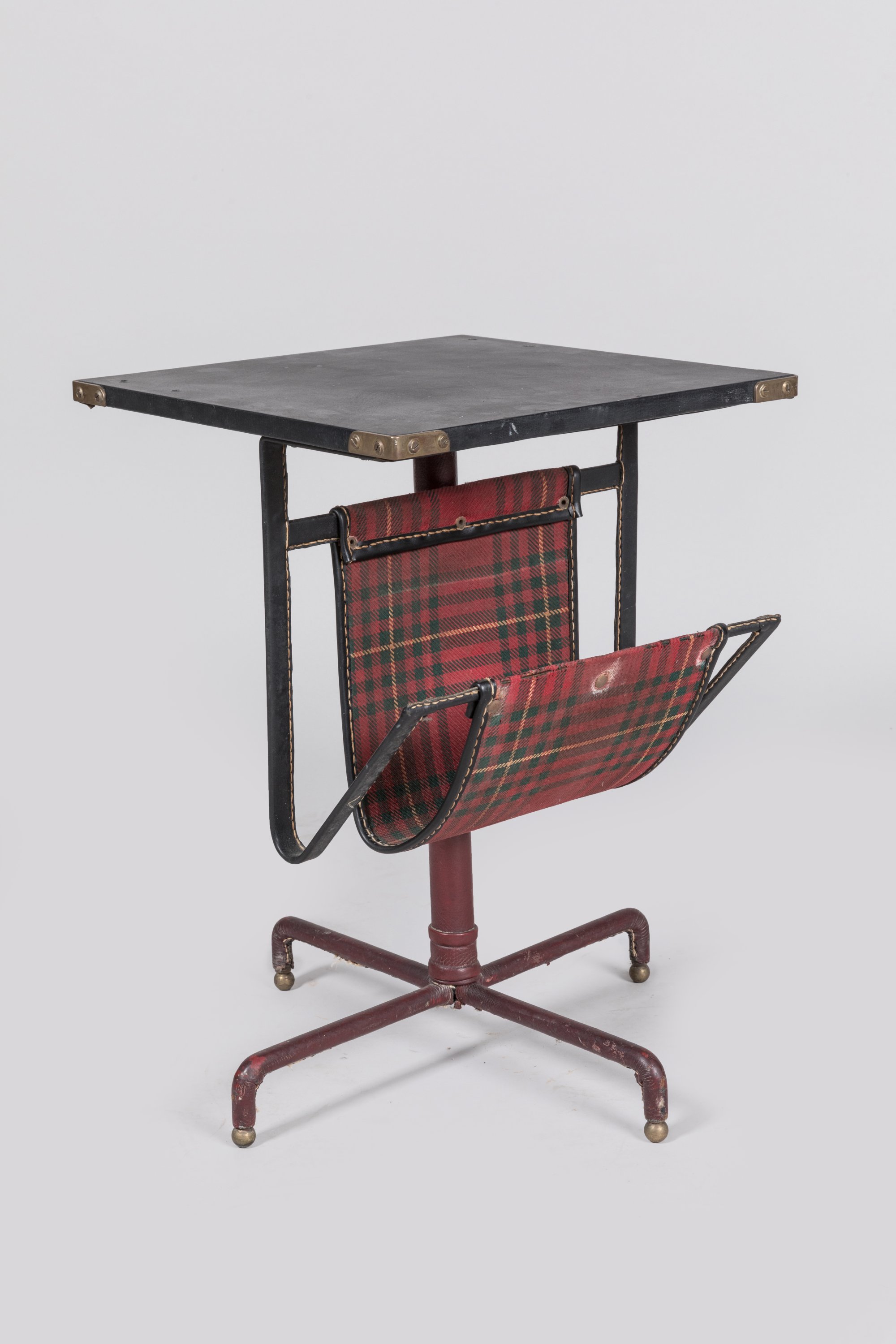 de forme cintrée en tissus écossais, tubes gainés de cuir rouge, tablette du haut en skaï noir. Le tout reposant sur des boules de laiton. L'ensemble pivotant.