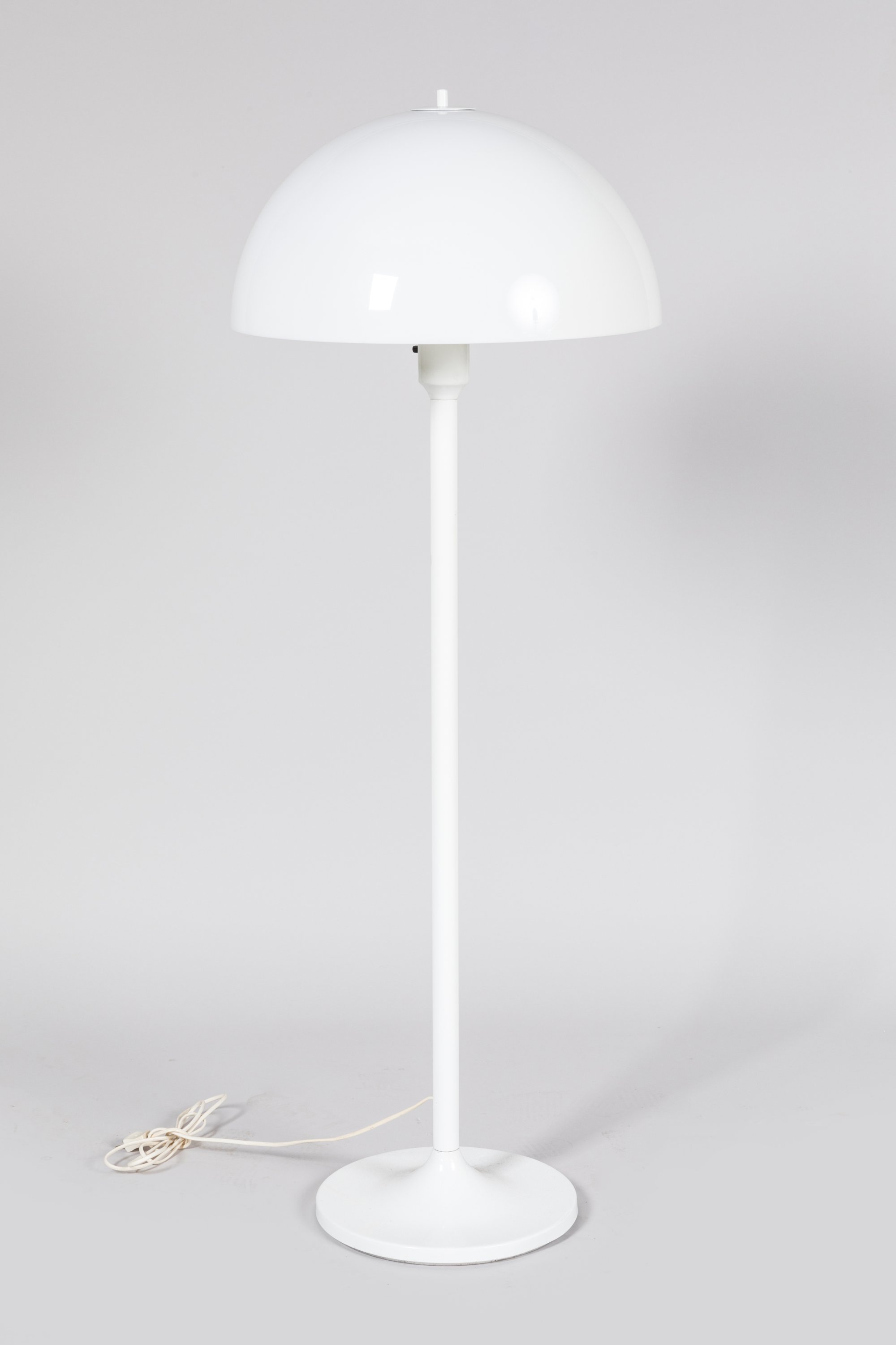 le pied en métal et abat-jour en plastique blanc.