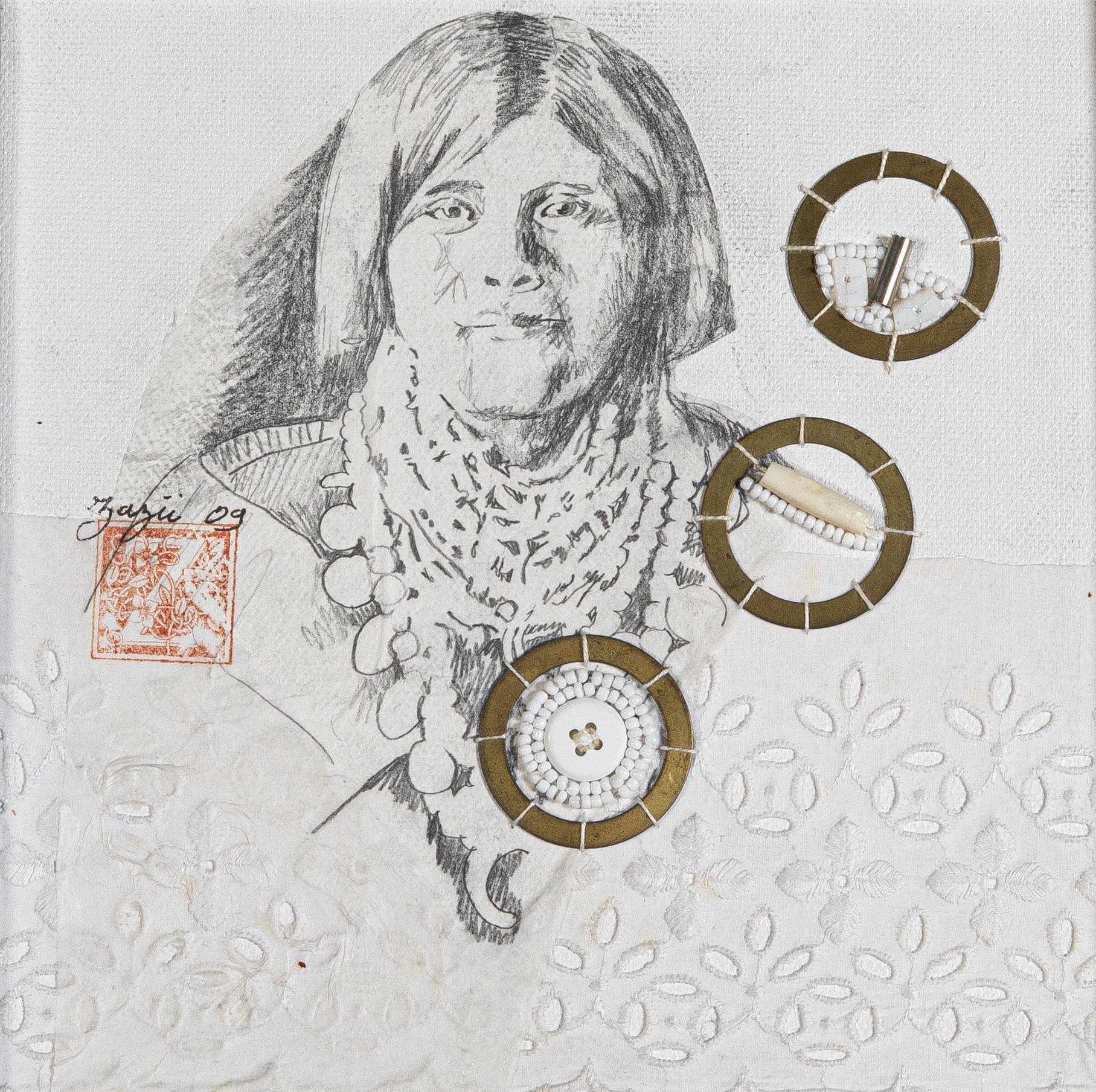 Technique mixte de mine de plomb sur papier de soie encollé, incrustations de broderie, perlage, métal sur toile.