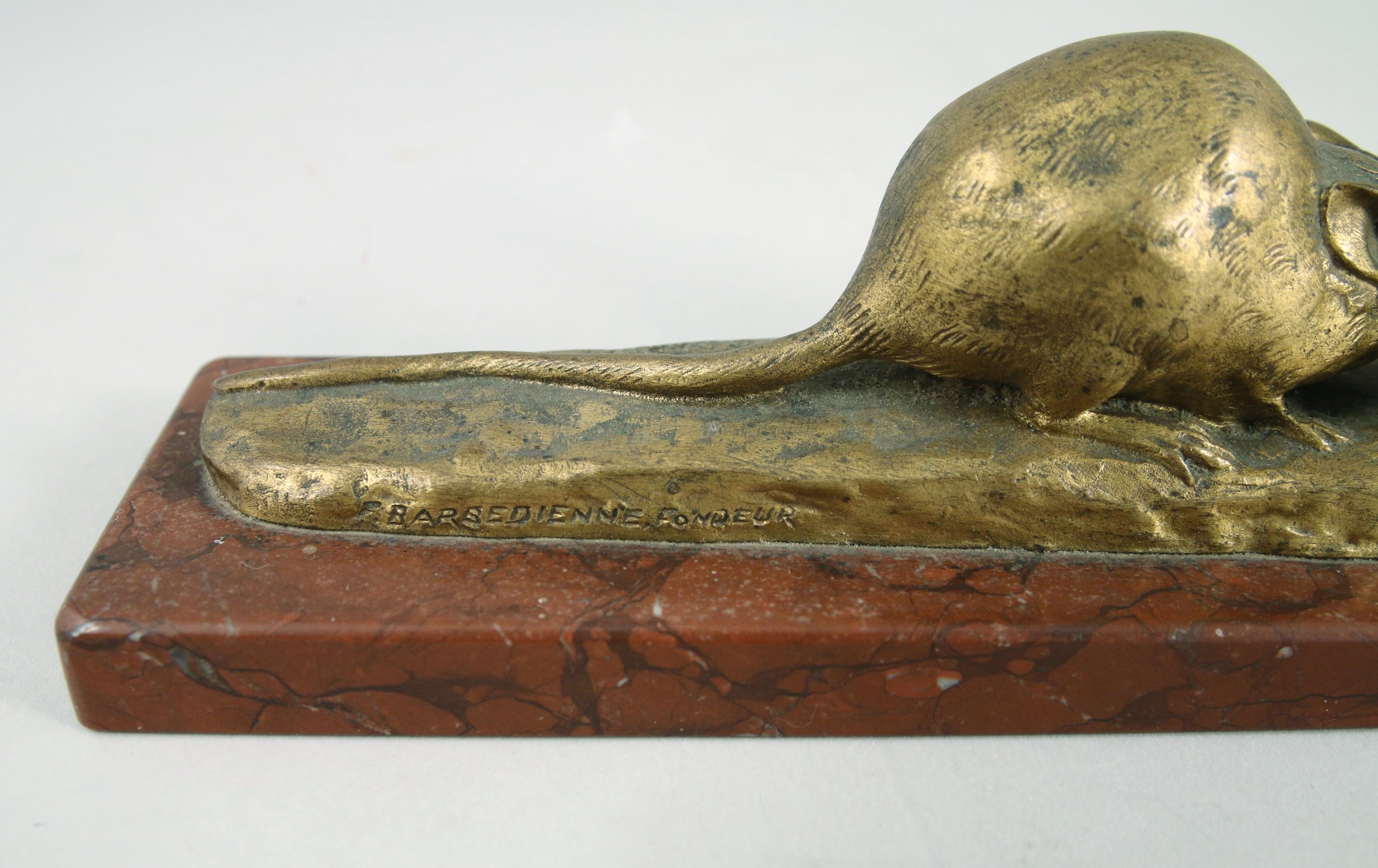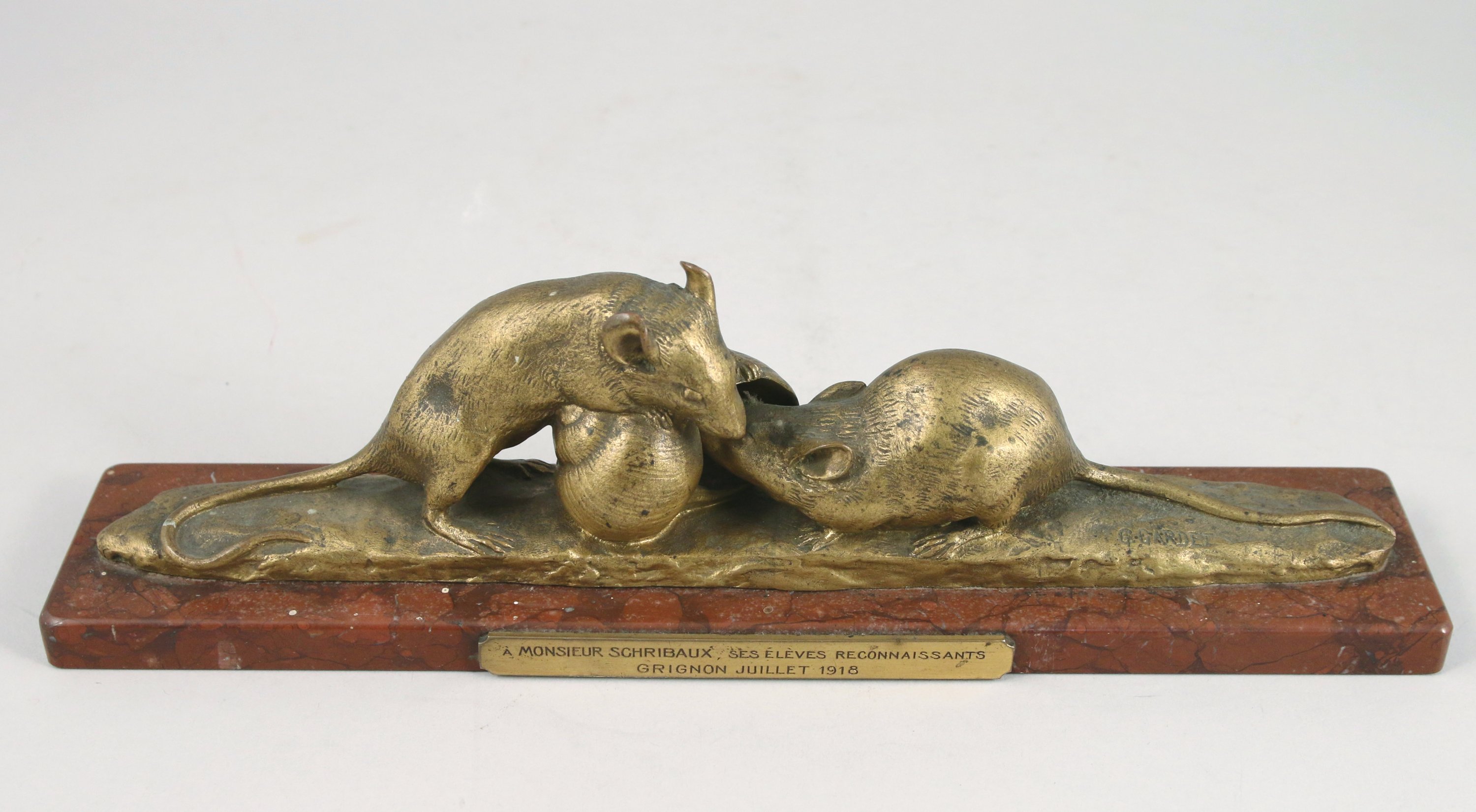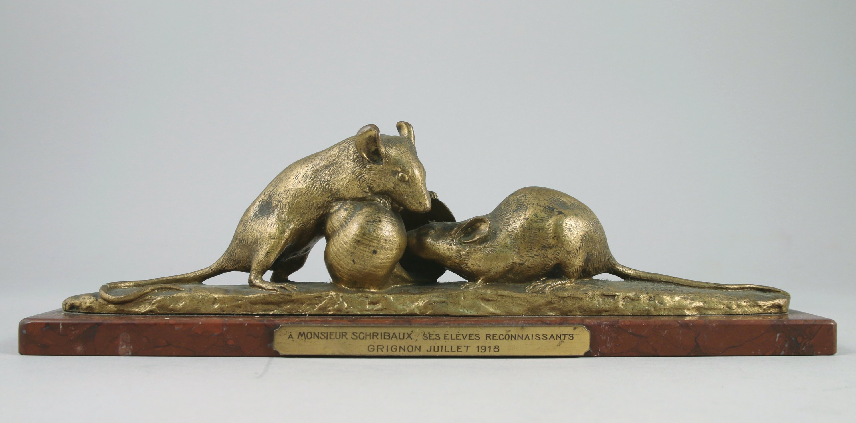 Bronze à patine dorée signé en creux sur la terrasse F. BARBEDIENNE. FONDEUR. Socle en marbre griotte avec plaquette portant l'inscription. " A MONSIEUR SCHRIBAUX, SES ÉLÈVES RECONNAISSANTS/ GRIGNON JUILLET 1918 ".