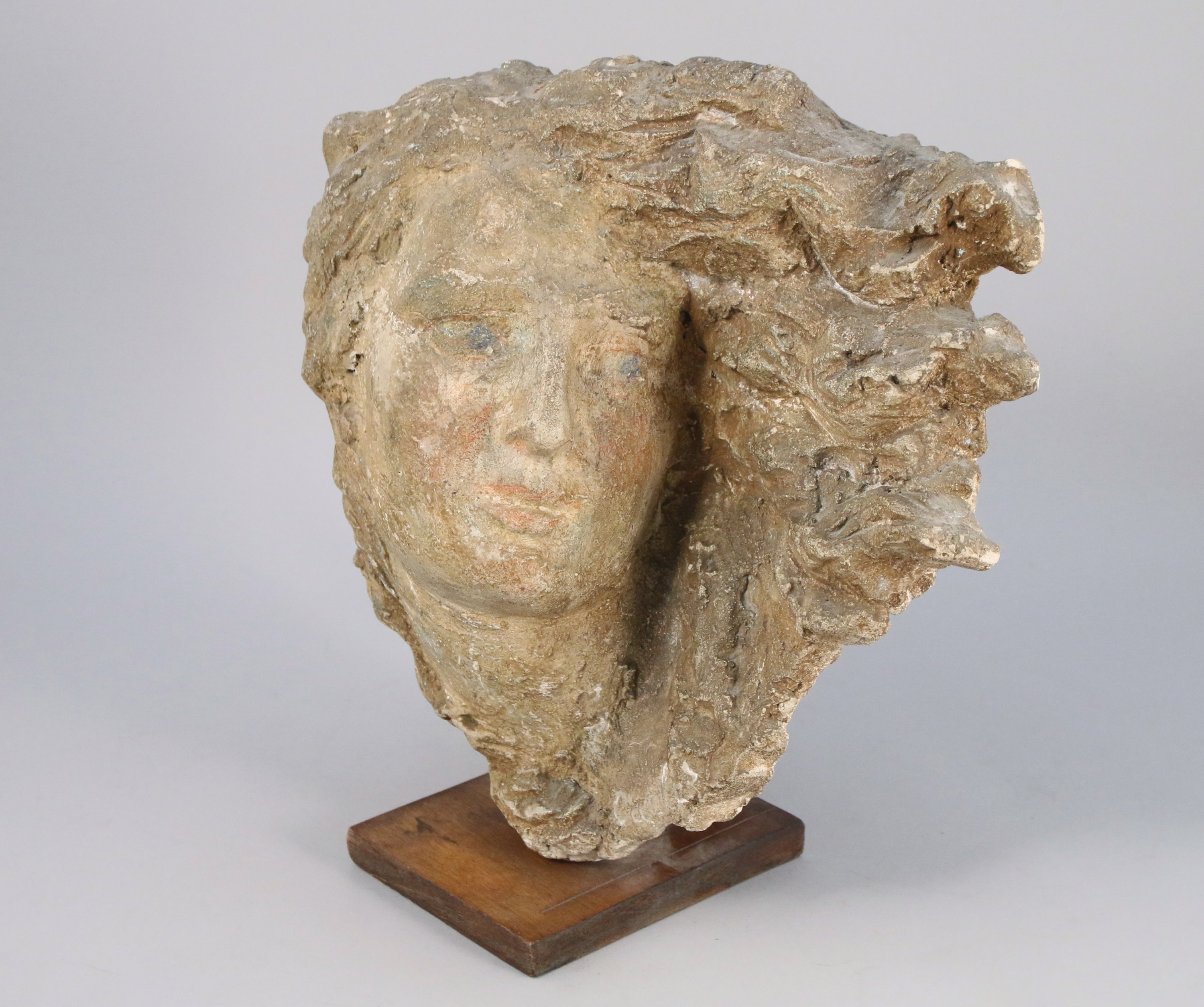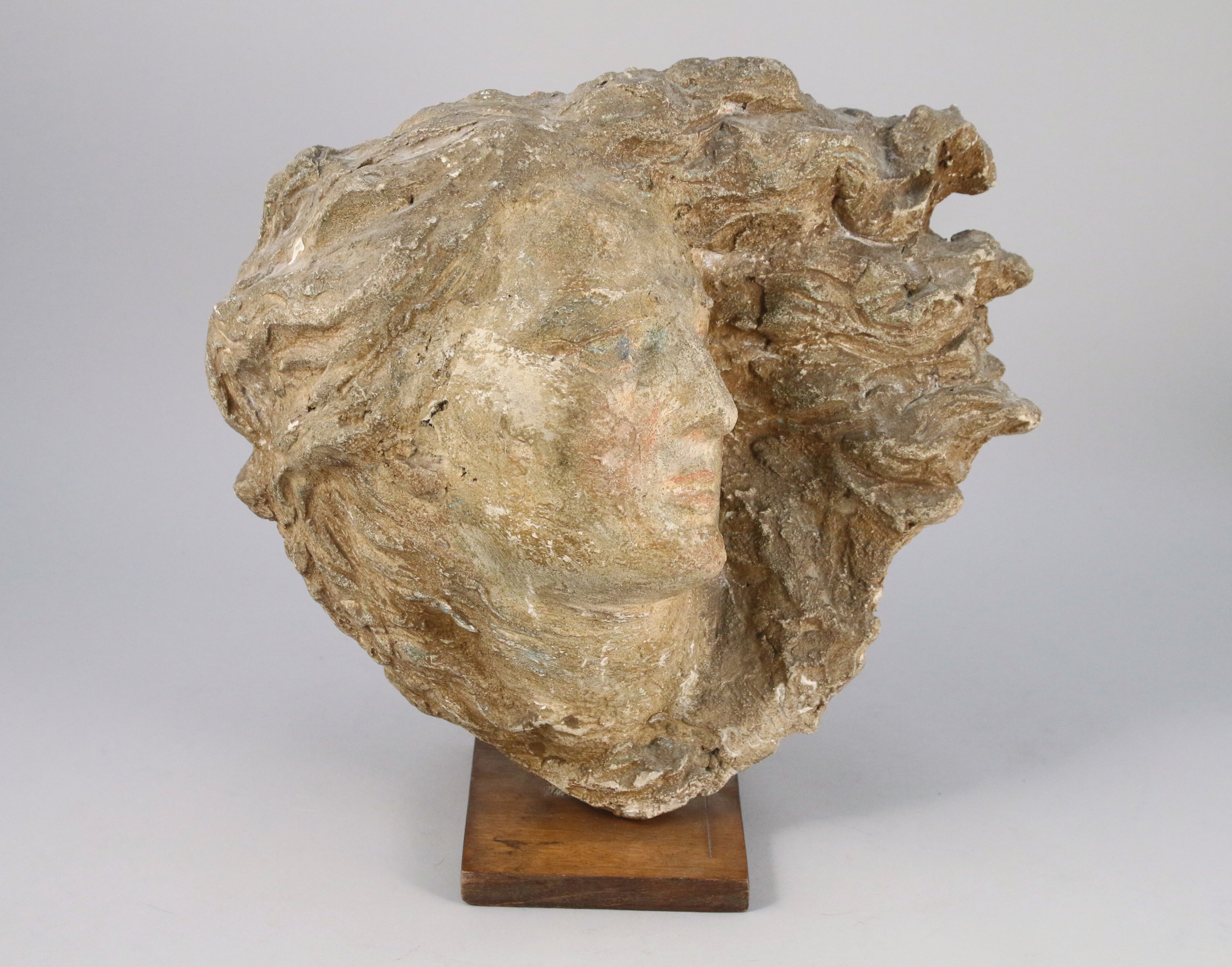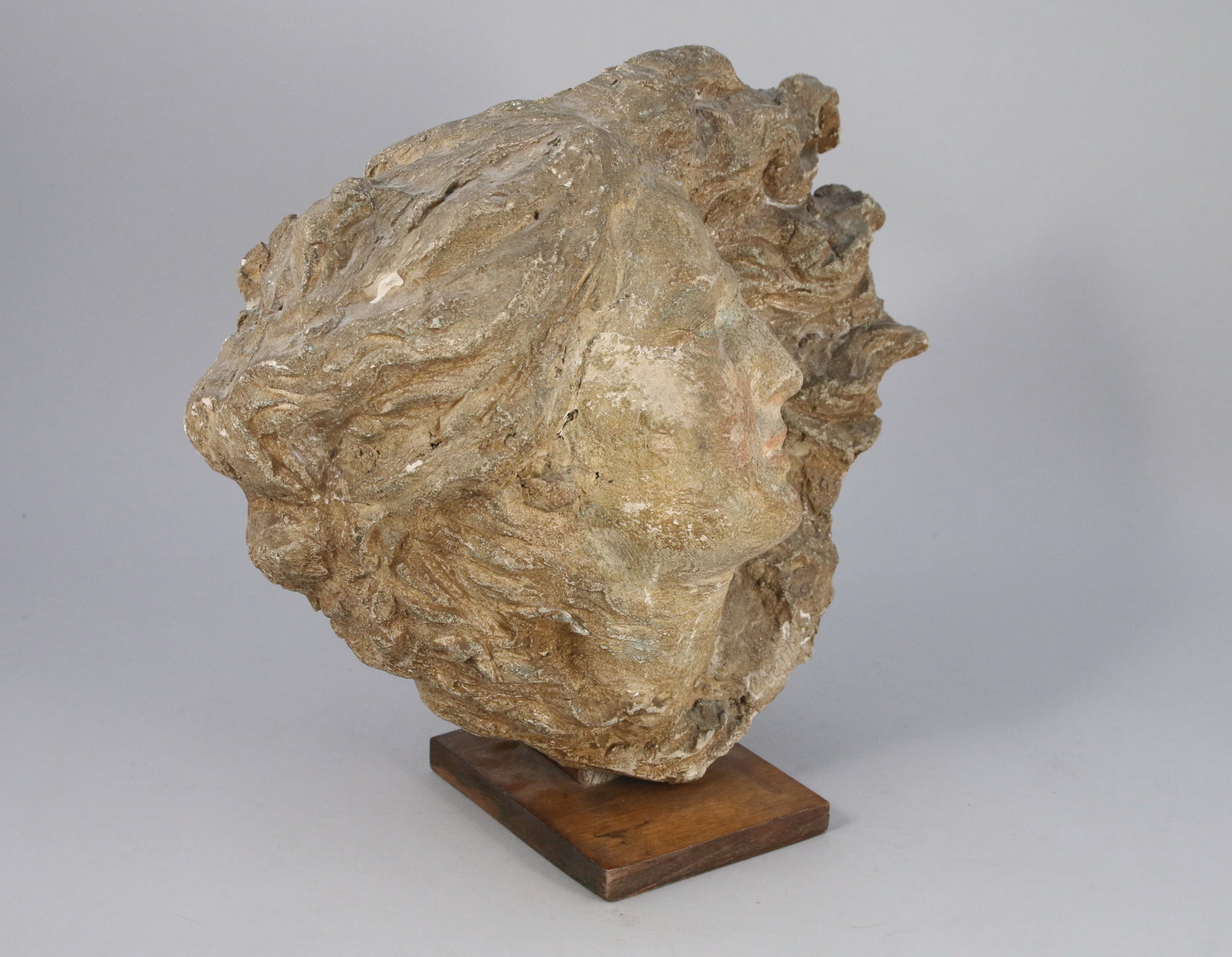 Sculpture en terre cuite (grès?) et plâtre. Profil droit, traces de polychromie.