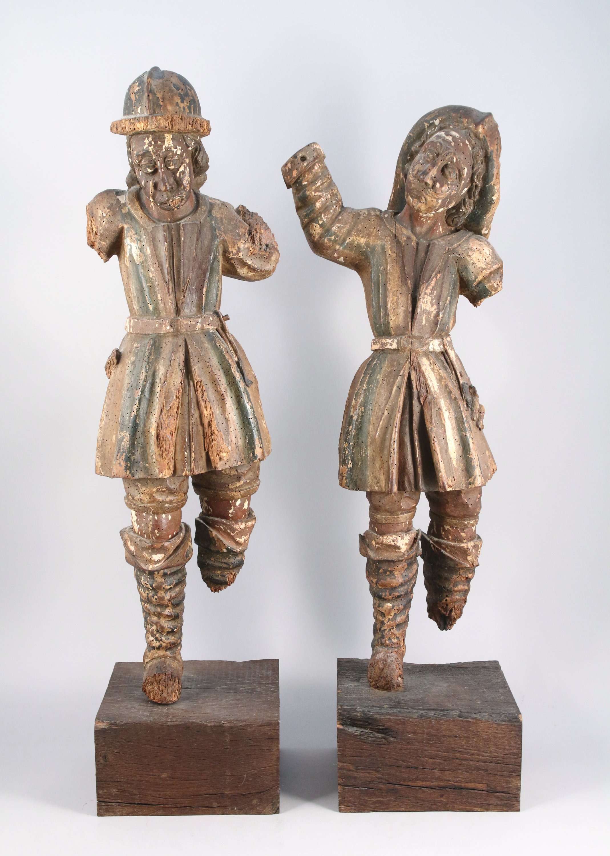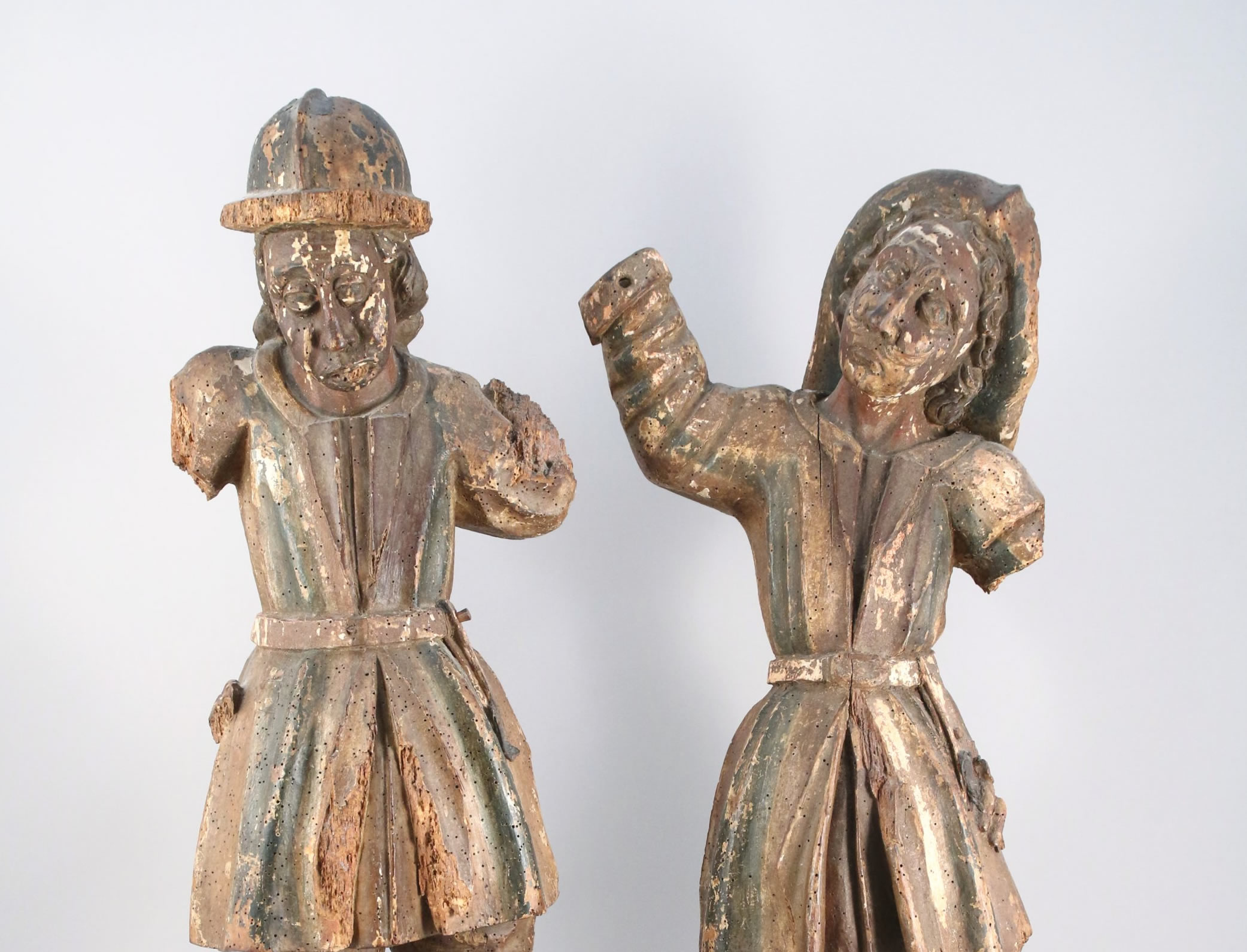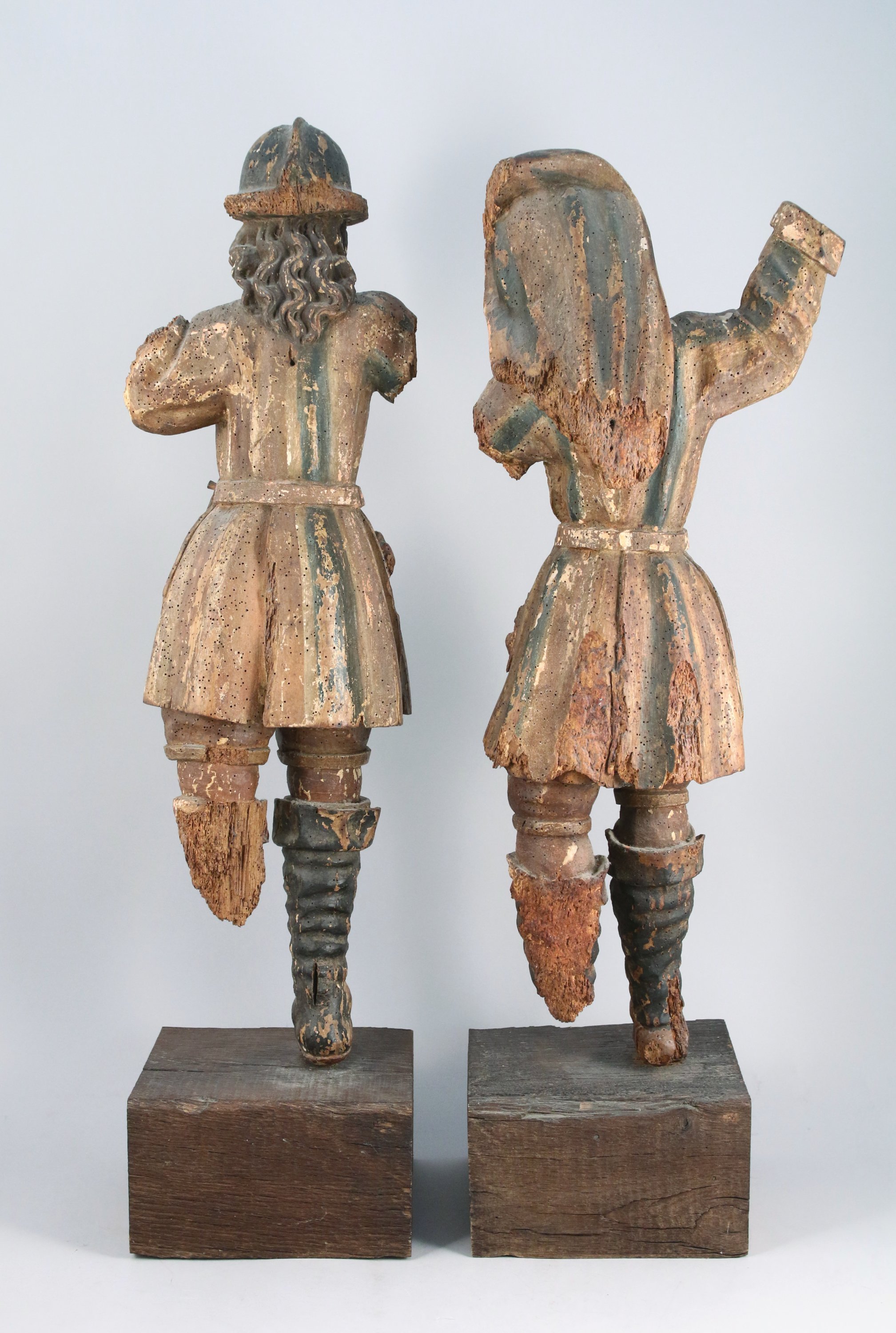 Paire de STATUES en bois naturel anciennement polychrome, représentant deux personnages coiffés et costumés dans le goût de la Renaissance.
