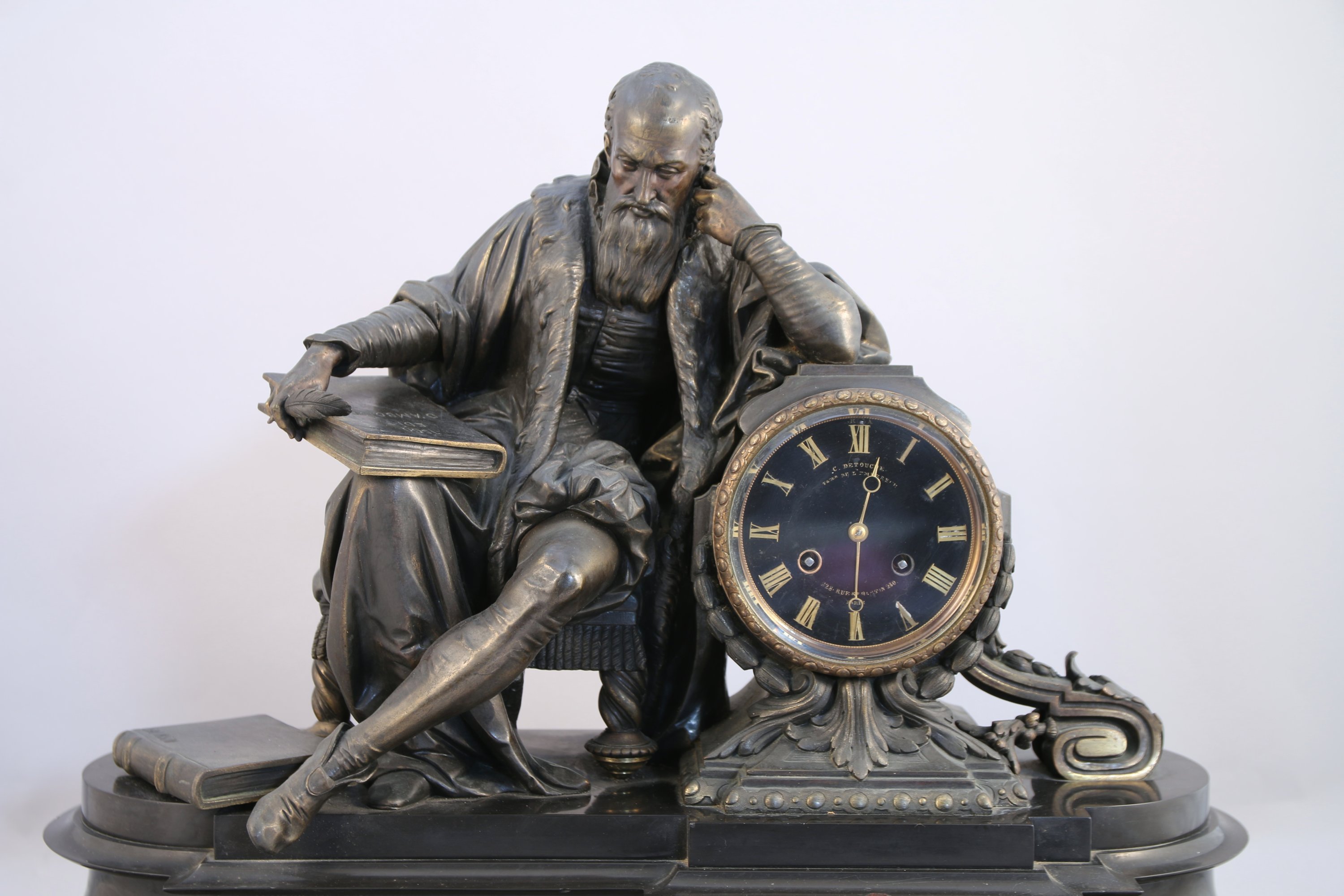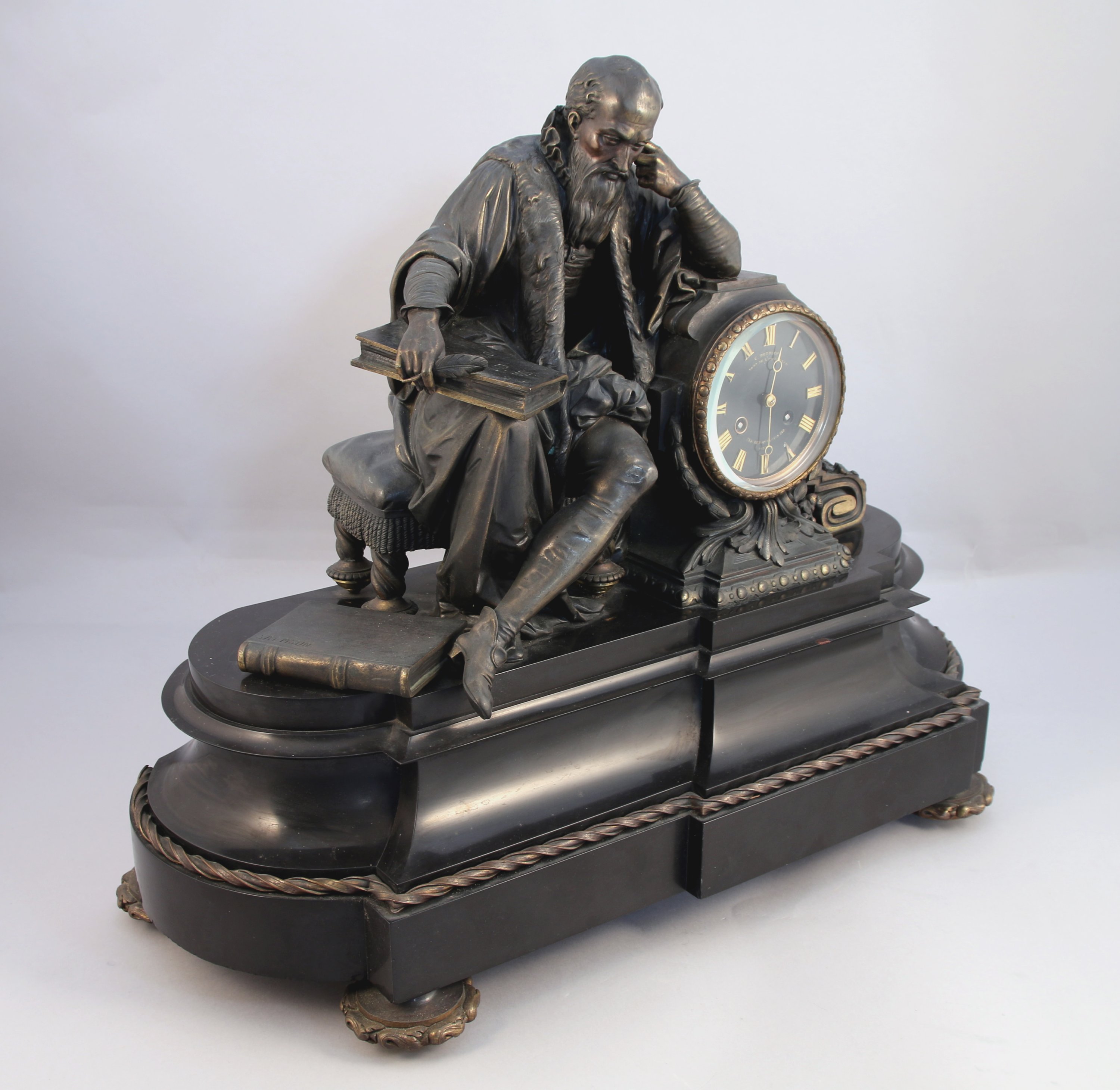 en bronze patiné et marbre noir. Elle se compose d'une pendule et de deux personnages.